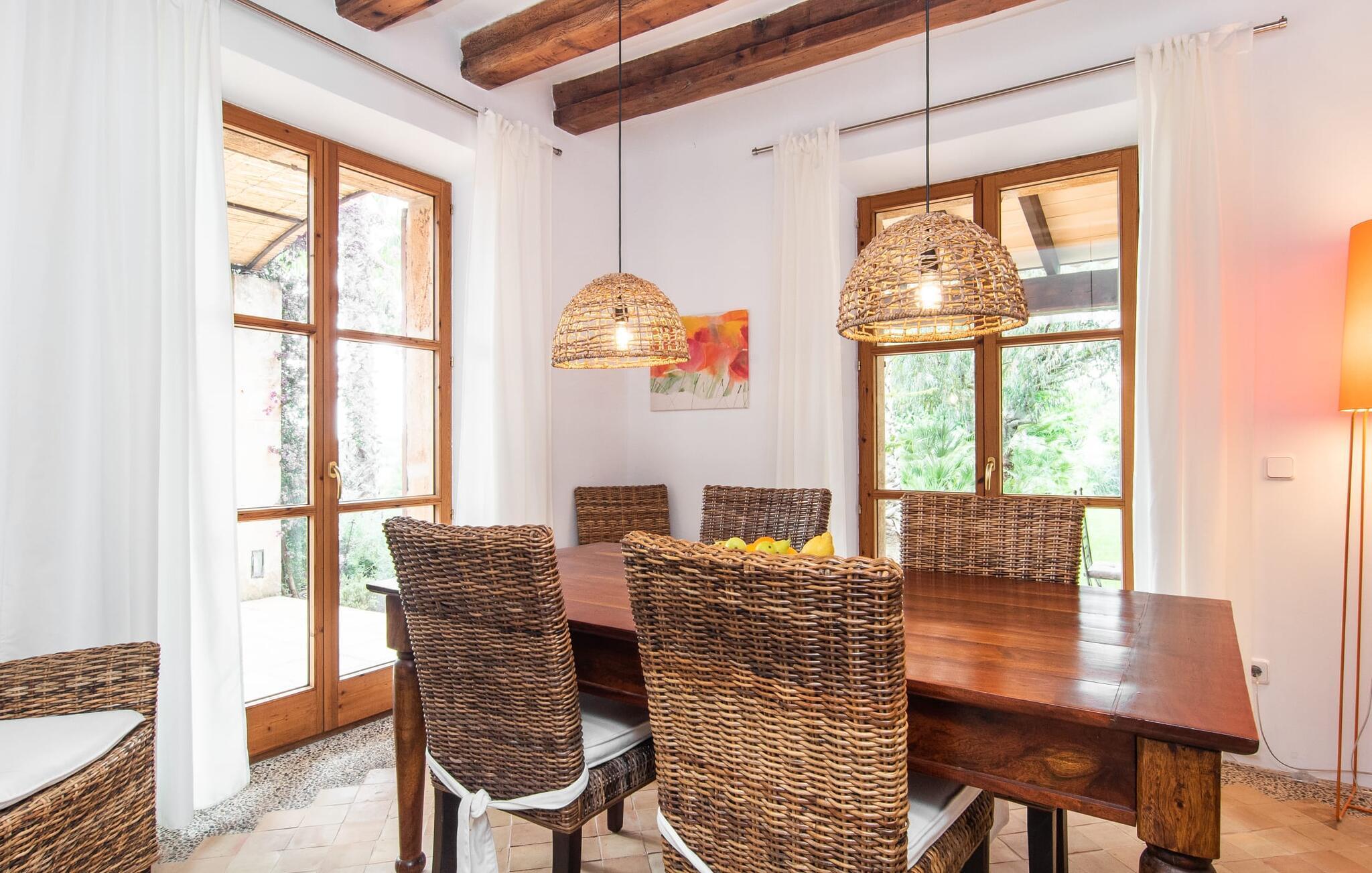 Die Wohnfläche des Ferienhauses verteilt sich auf zwei Ebenen. Der Innenraum ist hochwertig möbliert und geschmackvoll dekoriert. Ein großzügiger Empfangsraum führt in einen gemütlichen Wohnbereich mit Kamin und angrenzendem Essbereich. Mehrere Fenstertüren führen auf die Terrassen und durchfluten die Räume mit viel natürlichem Tageslicht. An den Essbereich schließt sich eine großzügige, voll ausgestattete Küche im Landhausstil an. Die Küche hat einen eigenen Zugang zur Terrasse. Darüber hinaus gibt es im Erdgeschoss ein Gäste-WC und einen Hauswirtschaftsraum. Im Obergeschoss erwartet Sie ein helles Büro mit gemütlicher Leseecke. Von hier aus gelangen Sie zu den drei wunderschön gestalteten Doppelzimmern. Eines davon verfügt über ein Badezimmer en suite mit Badewanne und Zugang zu einer privaten Terrasse. Die anderen beiden Schlafzimmer teilen sich ein modernes Badezimmer mit Dusche. Alle drei Schlafbereiche verfügen über viel Stauraum und einen tollen Ausblick auf die malerische Landschaft. Das Ferienhaus liegt in einer hügeligen Landschaft im Nordosten Mallorcas. Innerhalb von 15 Autominuten erreichen Sie Artá ??mit Einkaufsmöglichkeiten, Restaurants und Bars. Die Strände von Cala Agulla oder Cala Gat sind 20 Minuten entfernt. Der Golfplatz von Capdepera ist 6 km entfernt.