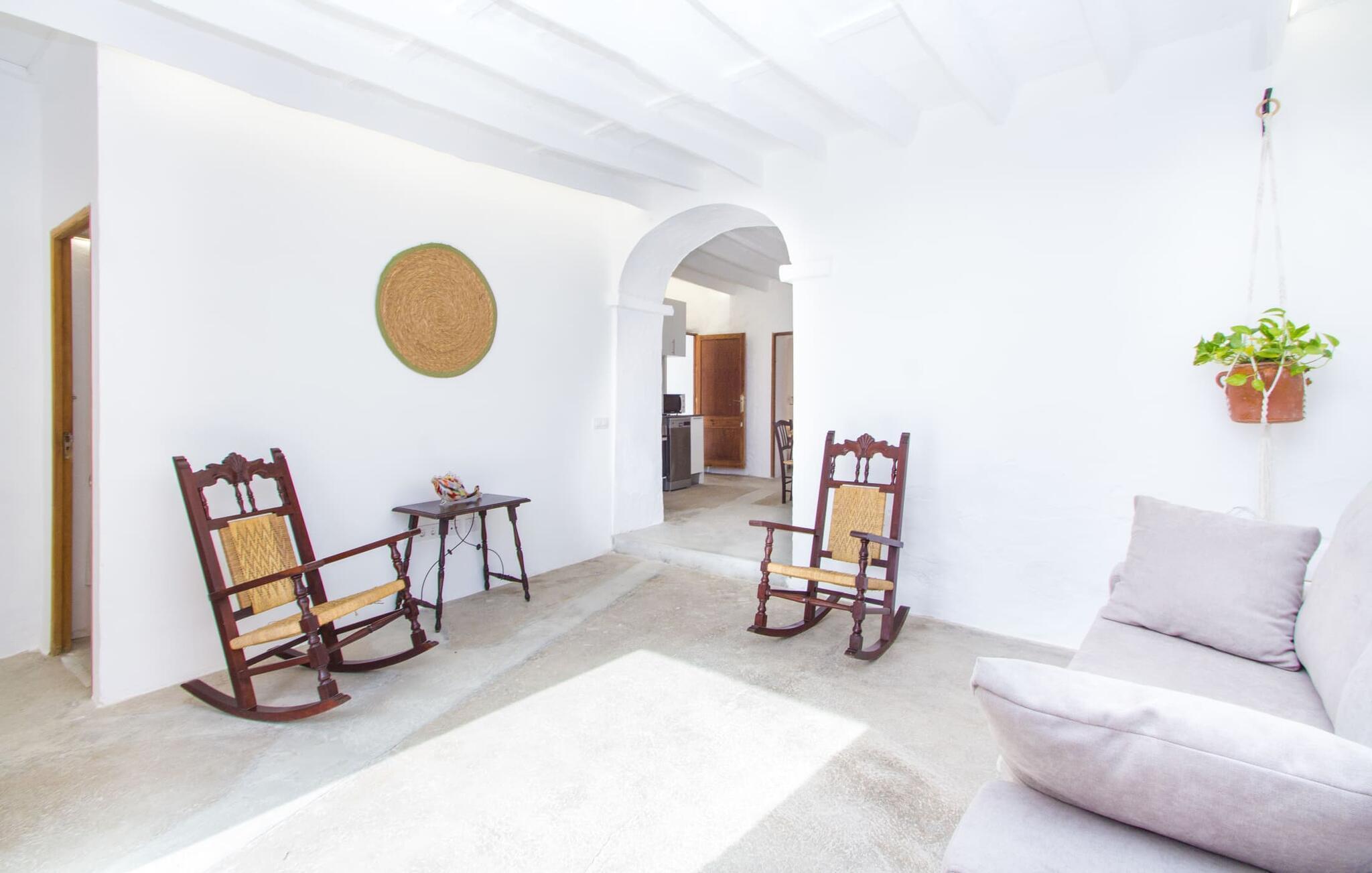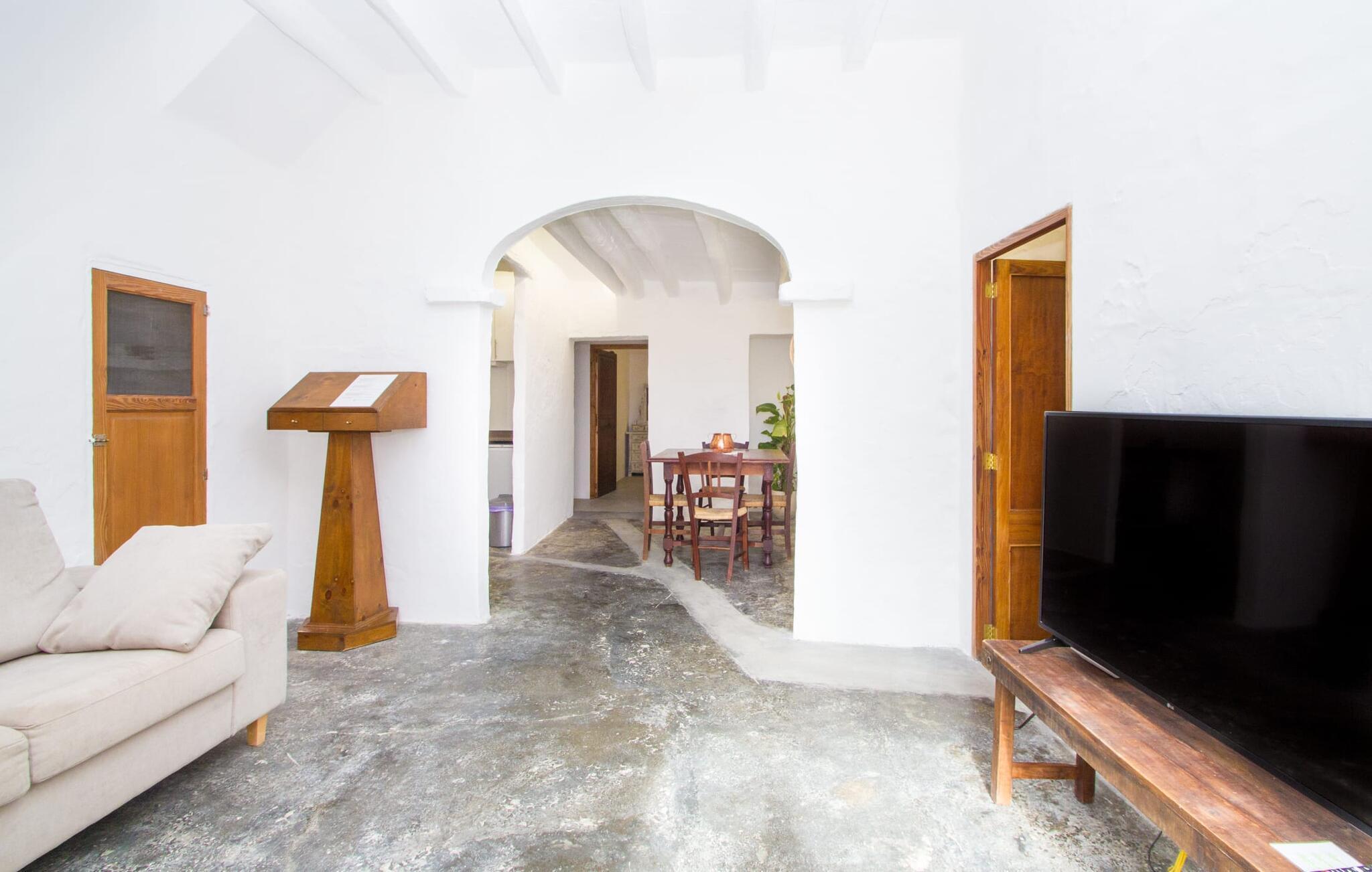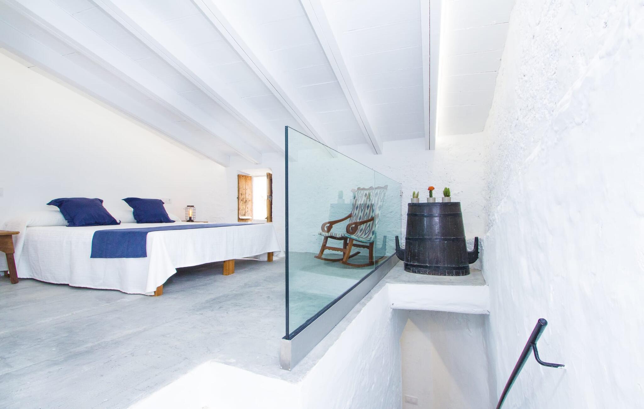 Der 215 m² große Innenraum des 1850 erbauten Bauernhauses zeichnet sich durch eine gelungene Kombination aus ursprünglichen Elementen und modernem Komfort aus. Die Räume sind auch bei hohen Temperaturen angenehm kühl und werden über zwei separate Eingänge erreicht. Im Erdgeschoss gibt es neben dem Wohnbereich mit mehreren Sitzecken einen Essbereich mit Tisch und zwei Küchen, eine davon mit einem weiteren Esstisch. Vier der fünf Schlafzimmer liegen ebenerdig; Auf einer Galerie im Obergeschoss befindet sich ein weiteres Schlafzimmer für zwei Gäste mit eigenem Bad. Auf der rechten Seite des Hauses befinden sich zwei Schlafzimmer für jeweils zwei Personen, während auf der linken Seite ein Doppelzimmer und ein Einzelzimmer vorhanden sind. In beide Bereiche wurden moderne Badezimmer mit großen Duschkabinen integriert. Eines der Zimmer verfügt über eine kleine private Terrasse. Das Ferienhaus ist mit WLAN und einem stabilen Mobilfunkempfang ausgestattet.