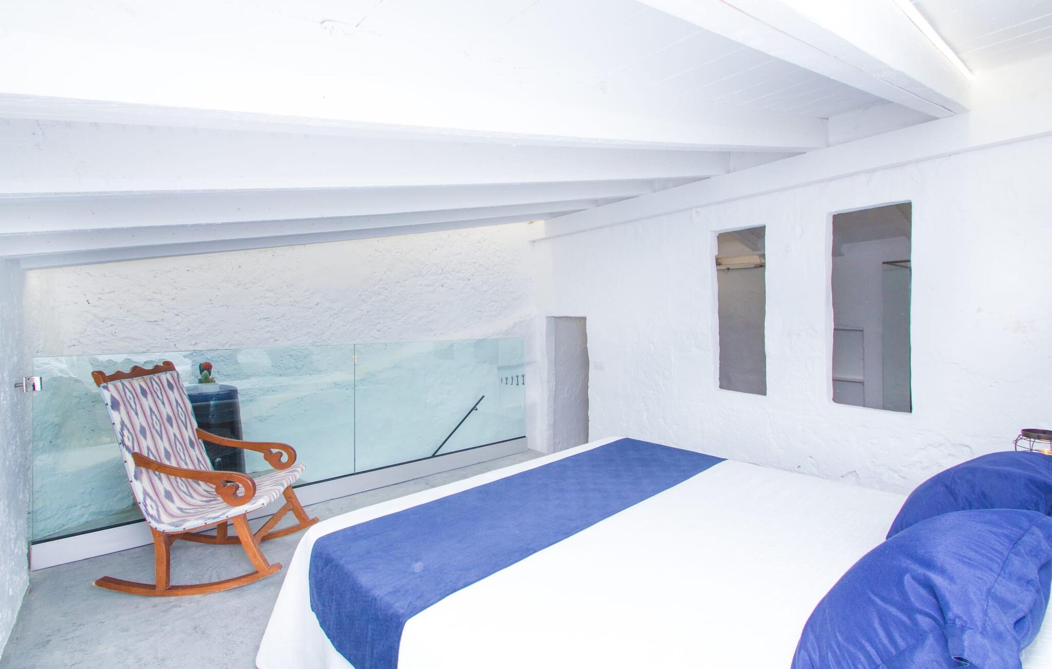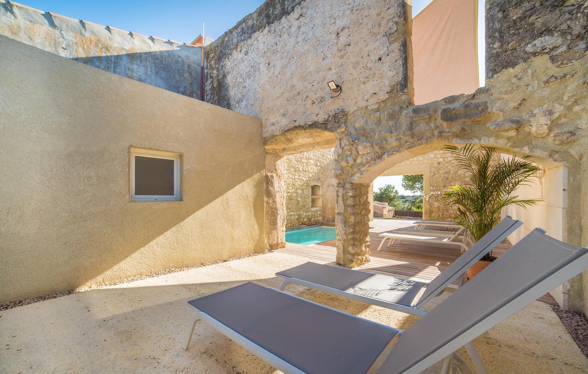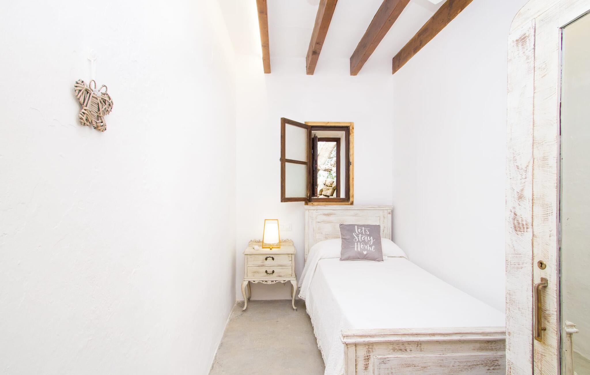 Der 215 m² große Innenraum des 1850 erbauten Bauernhauses zeichnet sich durch eine gelungene Kombination aus ursprünglichen Elementen und modernem Komfort aus. Die Räume sind auch bei hohen Temperaturen angenehm kühl und werden über zwei separate Eingänge erreicht. Im Erdgeschoss gibt es neben dem Wohnbereich mit mehreren Sitzecken einen Essbereich mit Tisch und zwei Küchen, eine davon mit einem weiteren Esstisch. Vier der fünf Schlafzimmer liegen ebenerdig; Auf einer Galerie im Obergeschoss befindet sich ein weiteres Schlafzimmer für zwei Gäste mit eigenem Bad. Auf der rechten Seite des Hauses befinden sich zwei Schlafzimmer für jeweils zwei Personen, während auf der linken Seite ein Doppelzimmer und ein Einzelzimmer vorhanden sind. In beide Bereiche wurden moderne Badezimmer mit großen Duschkabinen integriert. Eines der Zimmer verfügt über eine kleine private Terrasse. Das Ferienhaus ist mit WLAN und einem stabilen Mobilfunkempfang ausgestattet.