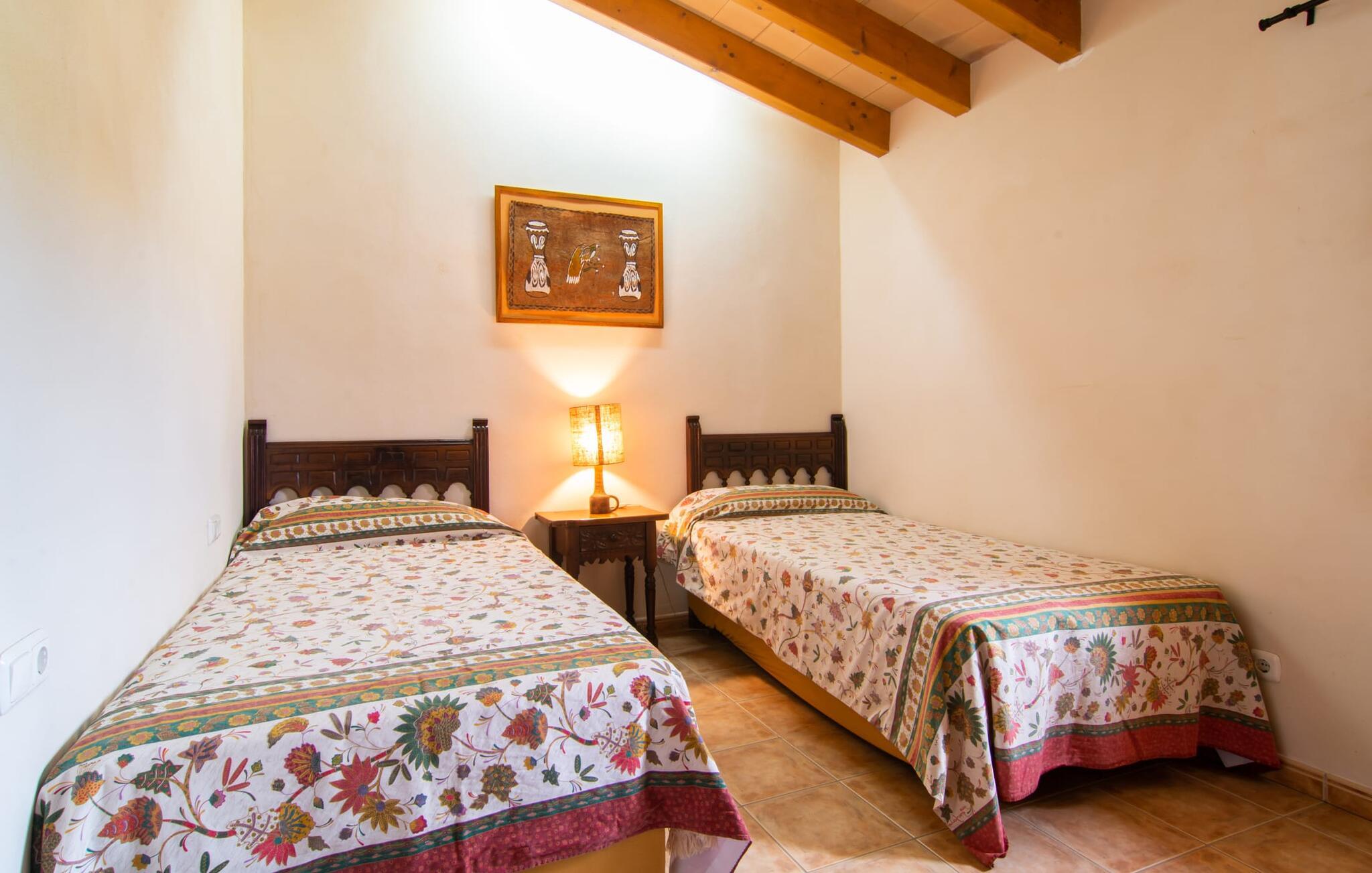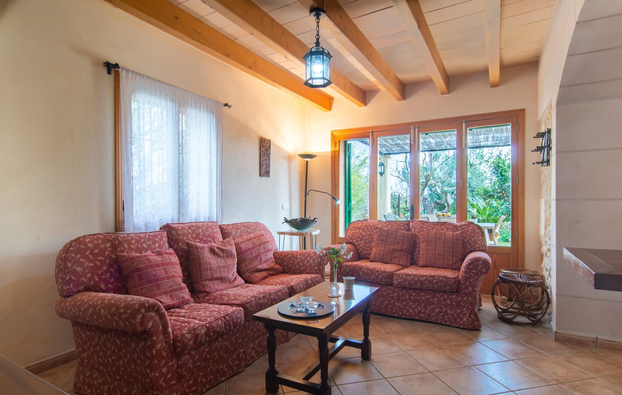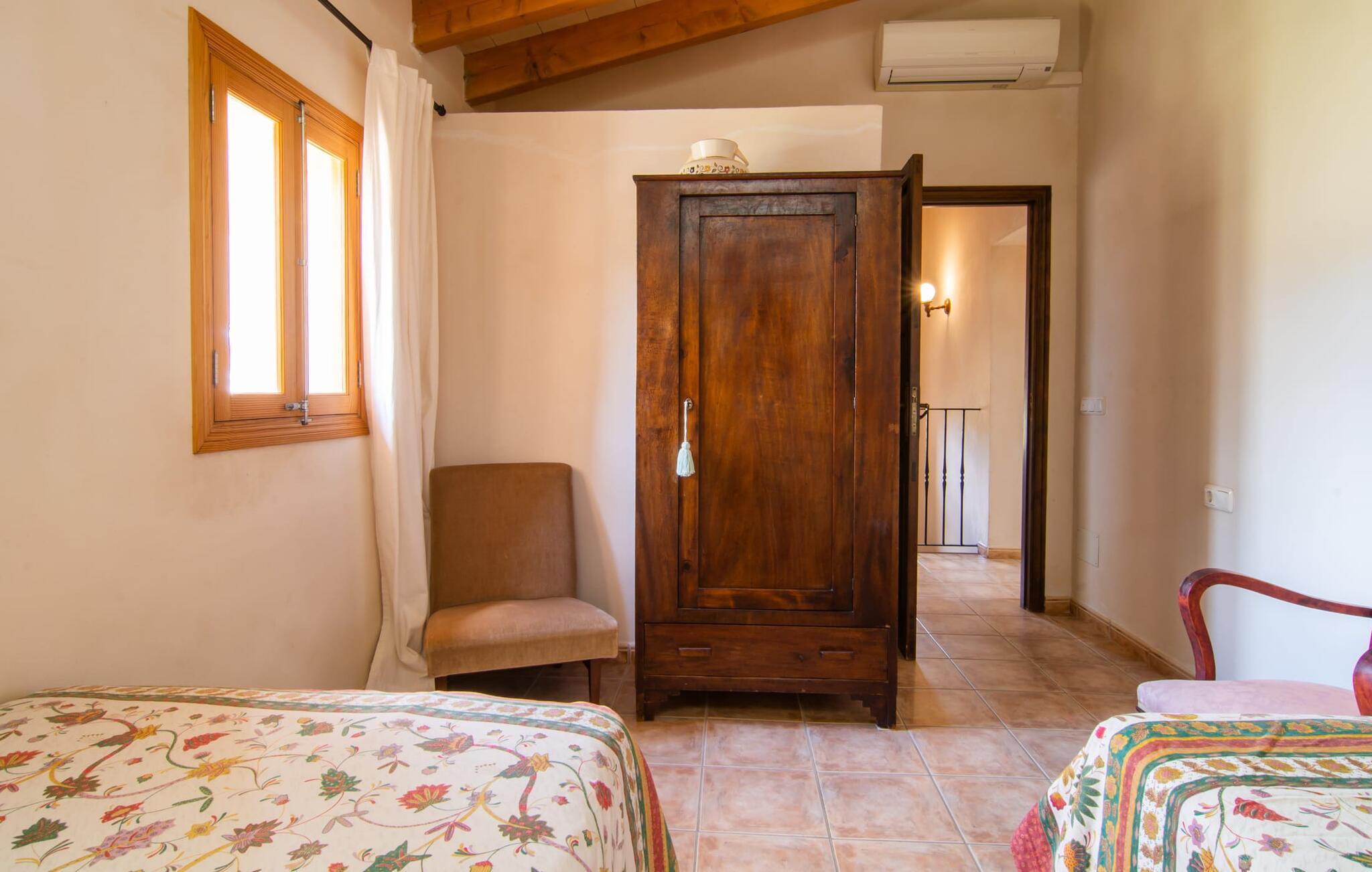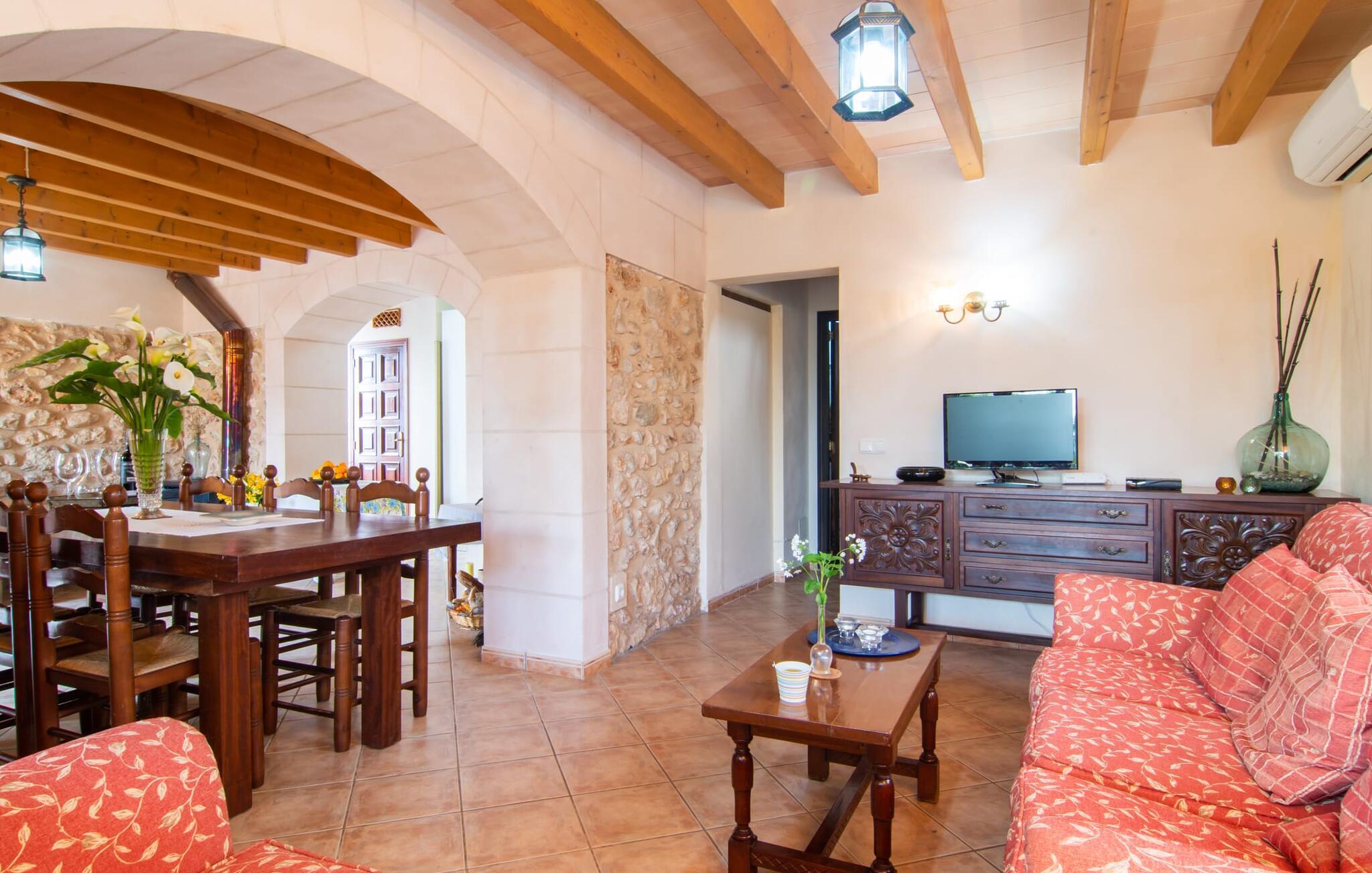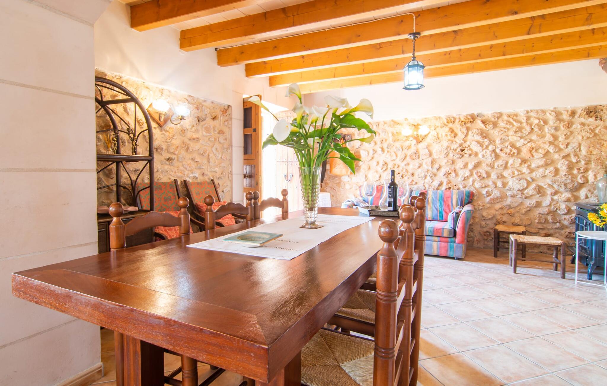 Die gemütliche Inneneinrichtung der Finca ist recht unprätentiös. Natursteinelemente setzen sich hier angenehm fort, harmonisch arrangiert mit Sichtbalkendecken, terrakottafarbenen Fliesen und hellen Wänden. Beeindruckend: der breite gewölbte Durchgang zwischen Wohn- und Essbereich. Auch im Innenbereich laden mehrere gemütliche Sitzgelegenheiten zum Entspannen ein. Der schöne große Esstisch eignet sich hervorragend zum Essen im Innenbereich und die voll ausgestattete Küche mit Backsteinelementen befindet sich direkt nebenan. Ein praktischer Abstellraum mit Waschmaschine sowie ein Badezimmer befinden sich ebenfalls im Erdgeschoss, die drei Schlafzimmer – zwei mit Einzelbetten von je 0,90 x 2,10 m, eines mit einem Doppelbett von 2 x 2,20 m – sowie ein weiteres Badezimmer sind im Obergeschoss untergebracht.