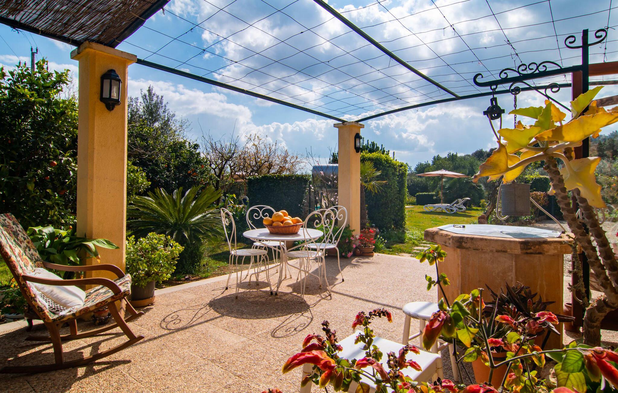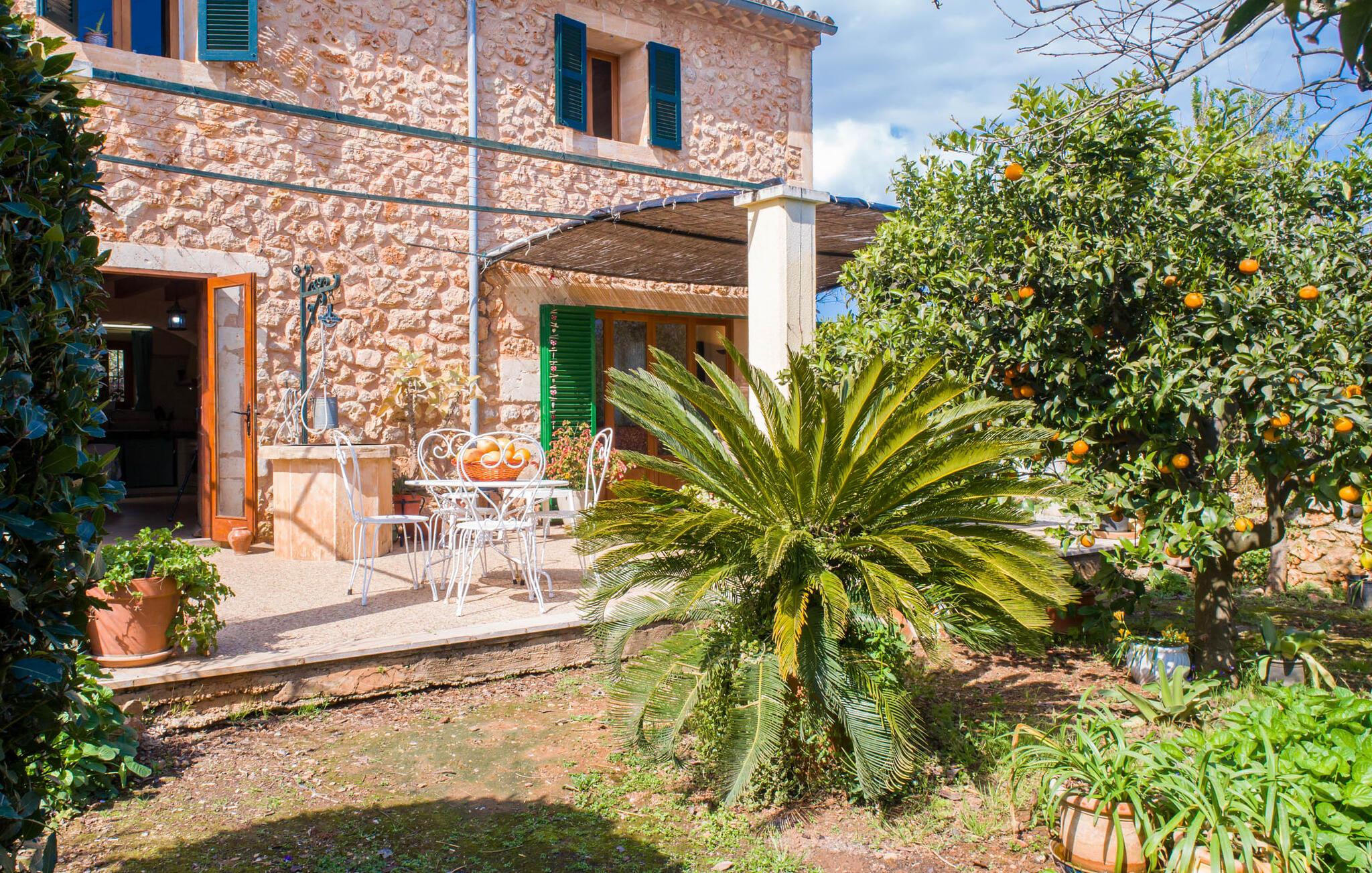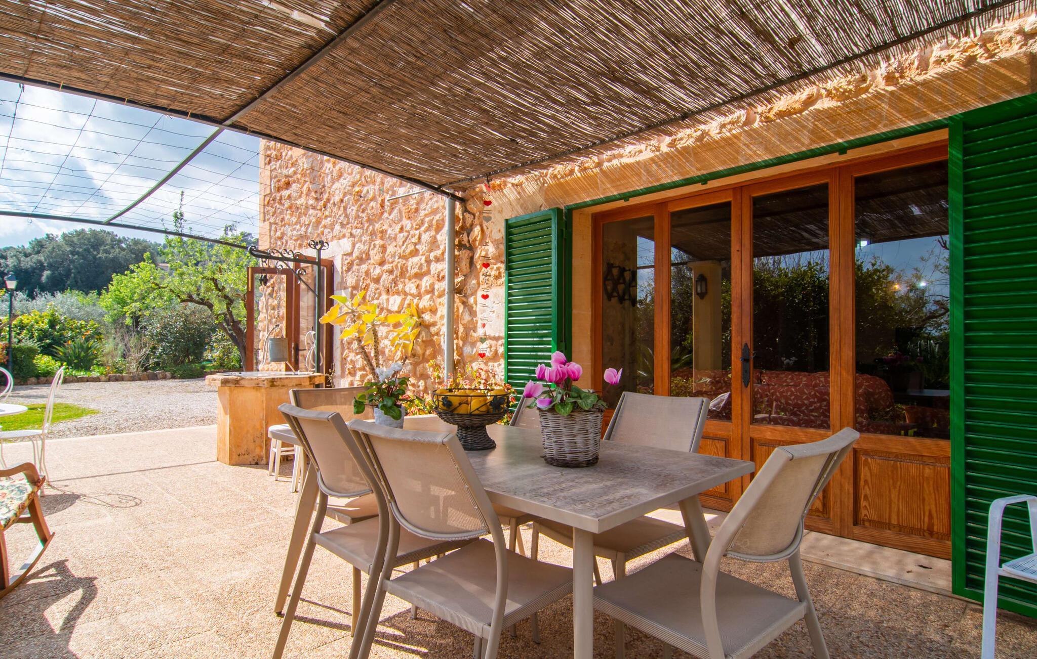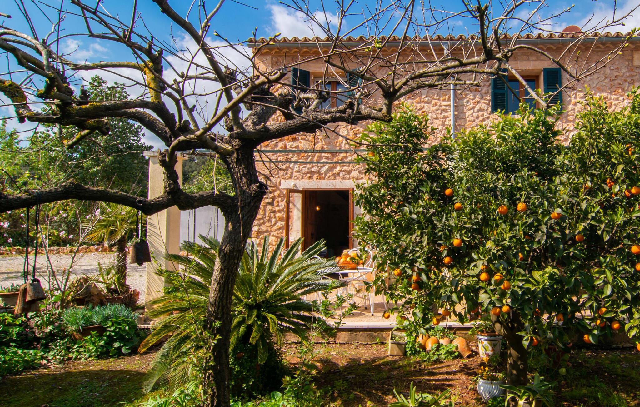 Mallorca, Finca, ländlich, Südlage, Pool – sind das Ihre Stichworte für die Suche nach einem Ferienhaus? Dann ist die Finca „Sa Mata Marina“ gleich in mehrfacher Hinsicht ein Volltreffer! Es erfüllt nicht nur alle diese Suchkriterien, sondern bringt auch noch eine ordentliche Portion Komfort und Charme mit. Das urige Häuschen mit seiner Natursteinfassade fügt sich perfekt in die malerische Landschaft ein und verfügt über ein üppig bewachsenes Grundstück, das sofort ein Gefühl von Behaglichkeit und Wohlbefinden hervorruft. Für die ersehnte Erfrischung an warmen Tagen sorgen nicht nur einladende Ruhebereiche in offener und überdachter Variante, sondern auch ein schöner, flacher Pool, der bequem über eine Treppe erreichbar ist. Natürlicher Schatten, Sonnenschirm oder direkt unter dem mediterranen Himmel – auf der Liegewiese rund um den 10 m langen Pool haben Sie die Qual der Wahl. Direkt neben dem Orangenbaum auf der Terrasse ist ein schöner Platz für gemeinsame Mahlzeiten – mit schönstem Blick ins Grüne. Die Wege ins Haus sind hier praktisch kurz, so dass Aufbau und Abdeckung im Handumdrehen erledigt sind. Der gemauerte Grill steht für herzhafte Grillabende mit üppigen mediterranen Köstlichkeiten bereit.