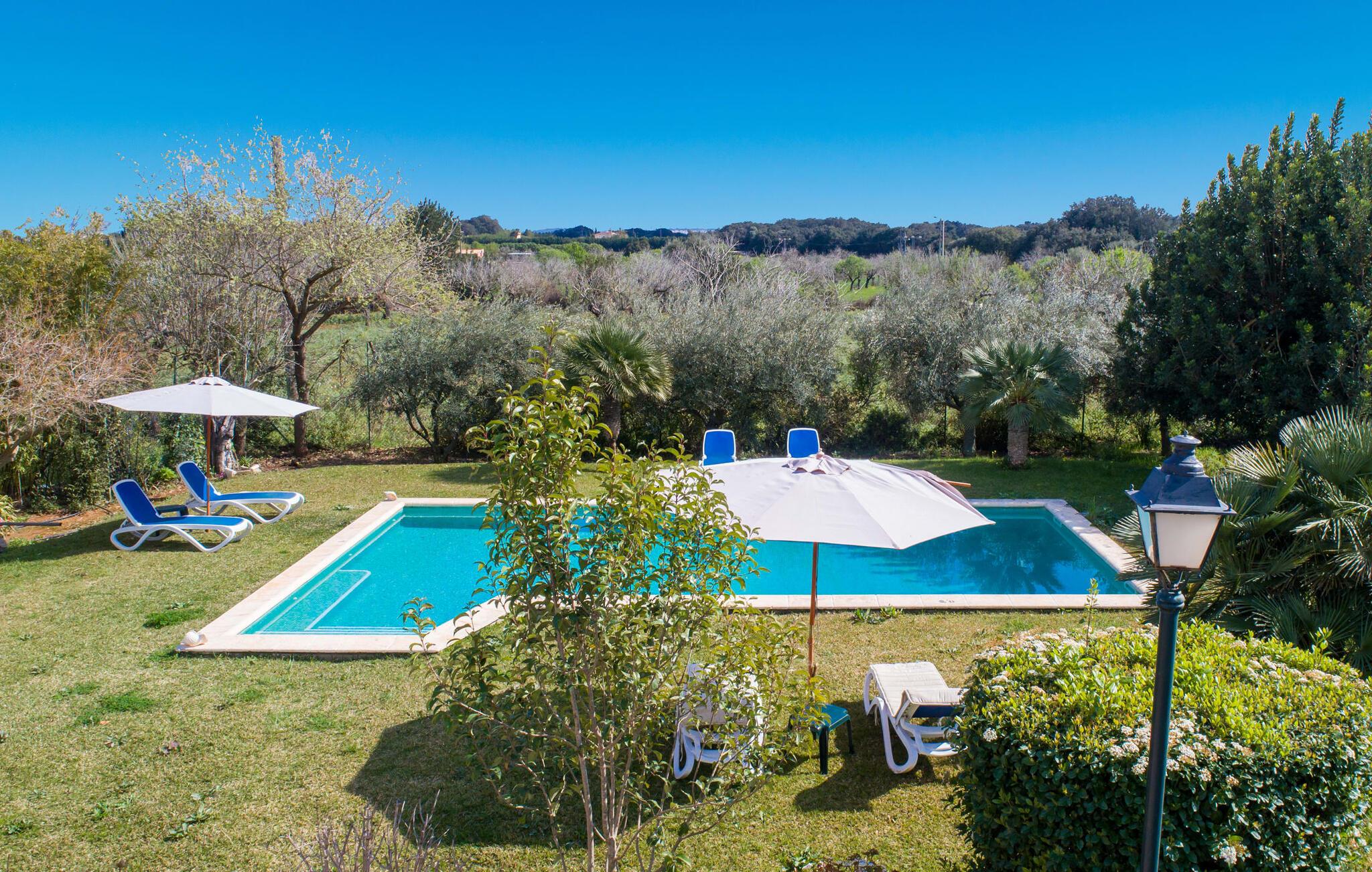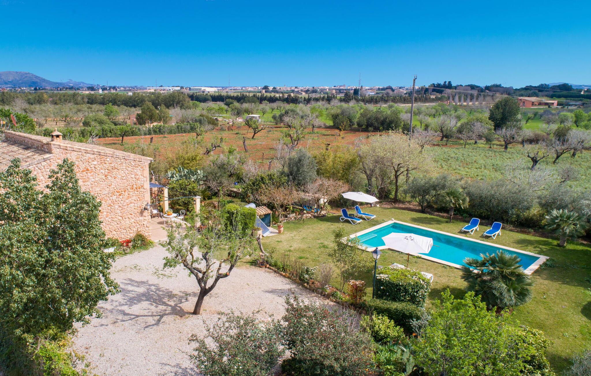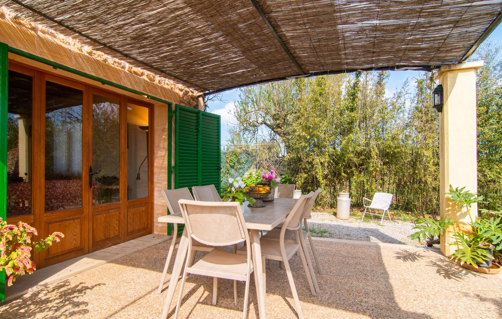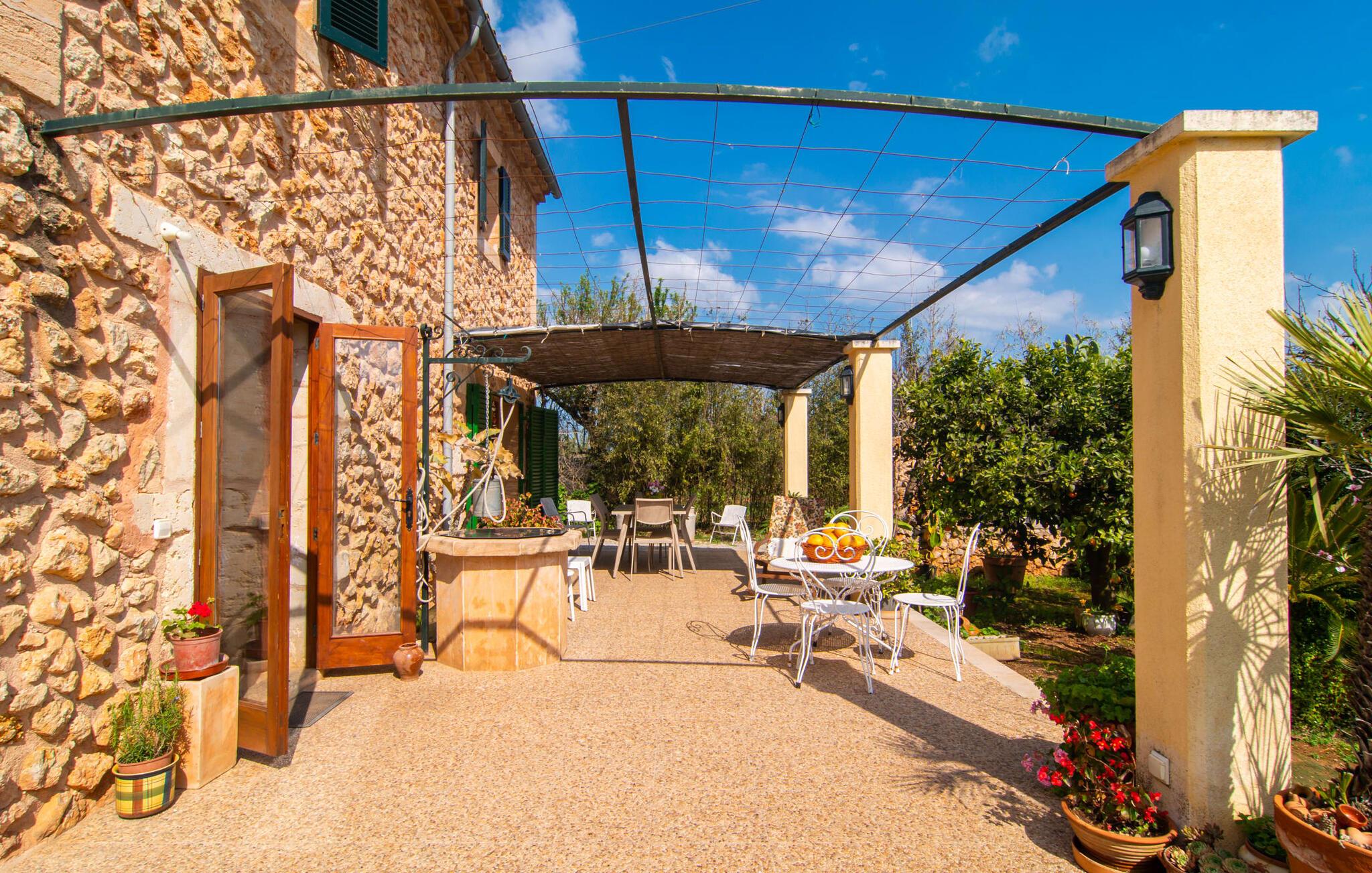 Mallorca, Finca, ländlich, Südlage, Pool – sind das Ihre Stichworte für die Suche nach einem Ferienhaus? Dann ist die Finca „Sa Mata Marina“ gleich in mehrfacher Hinsicht ein Volltreffer! Es erfüllt nicht nur alle diese Suchkriterien, sondern bringt auch noch eine ordentliche Portion Komfort und Charme mit. Das urige Häuschen mit seiner Natursteinfassade fügt sich perfekt in die malerische Landschaft ein und verfügt über ein üppig bewachsenes Grundstück, das sofort ein Gefühl von Behaglichkeit und Wohlbefinden hervorruft. Für die ersehnte Erfrischung an warmen Tagen sorgen nicht nur einladende Ruhebereiche in offener und überdachter Variante, sondern auch ein schöner, flacher Pool, der bequem über eine Treppe erreichbar ist. Natürlicher Schatten, Sonnenschirm oder direkt unter dem mediterranen Himmel – auf der Liegewiese rund um den 10 m langen Pool haben Sie die Qual der Wahl. Direkt neben dem Orangenbaum auf der Terrasse ist ein schöner Platz für gemeinsame Mahlzeiten – mit schönstem Blick ins Grüne. Die Wege ins Haus sind hier praktisch kurz, so dass Aufbau und Abdeckung im Handumdrehen erledigt sind. Der gemauerte Grill steht für herzhafte Grillabende mit üppigen mediterranen Köstlichkeiten bereit.