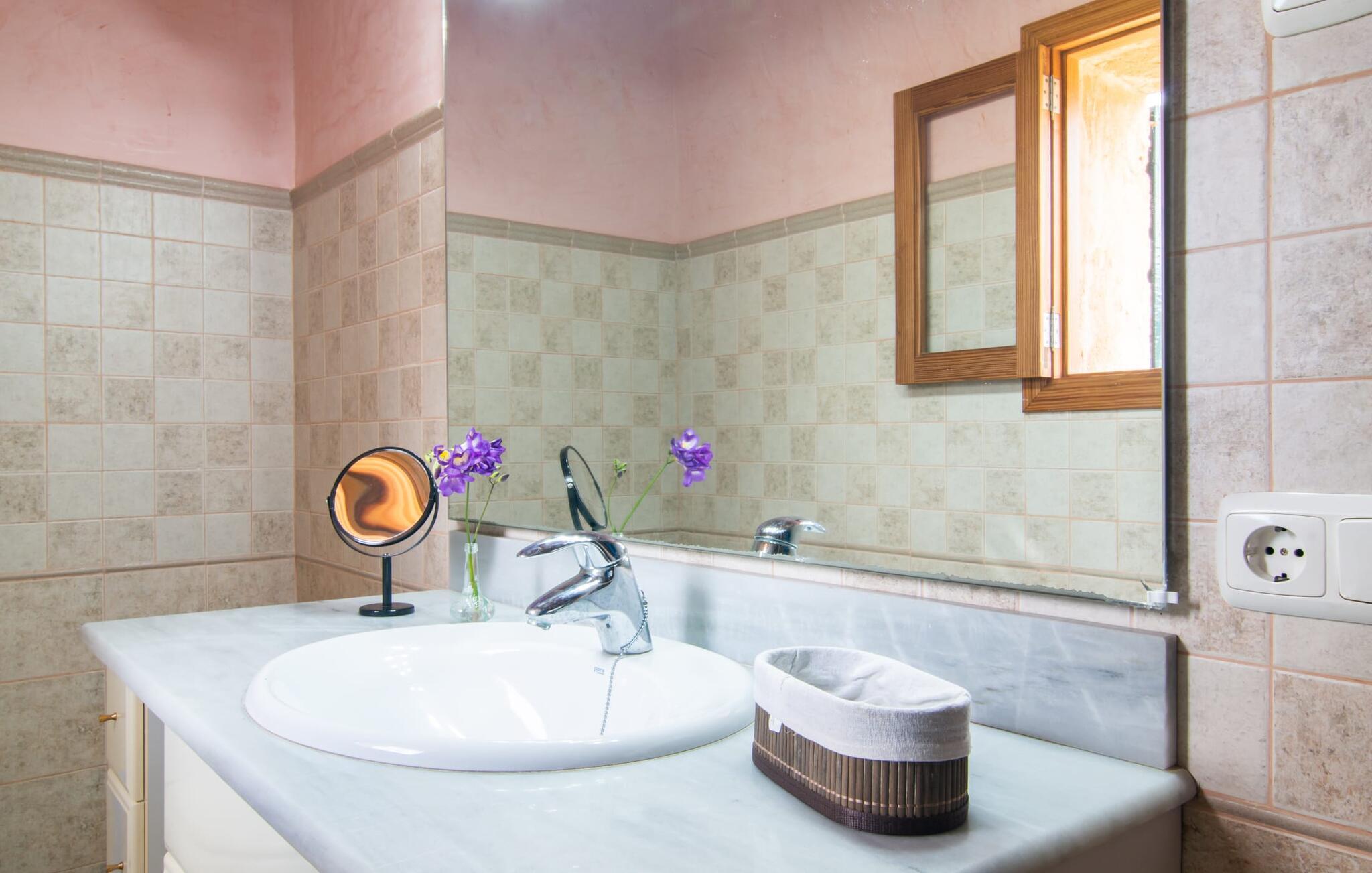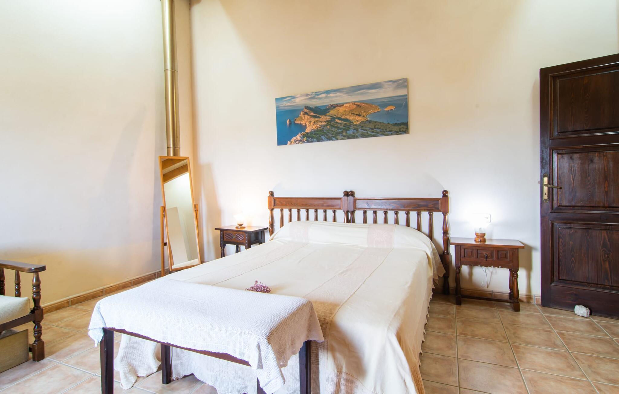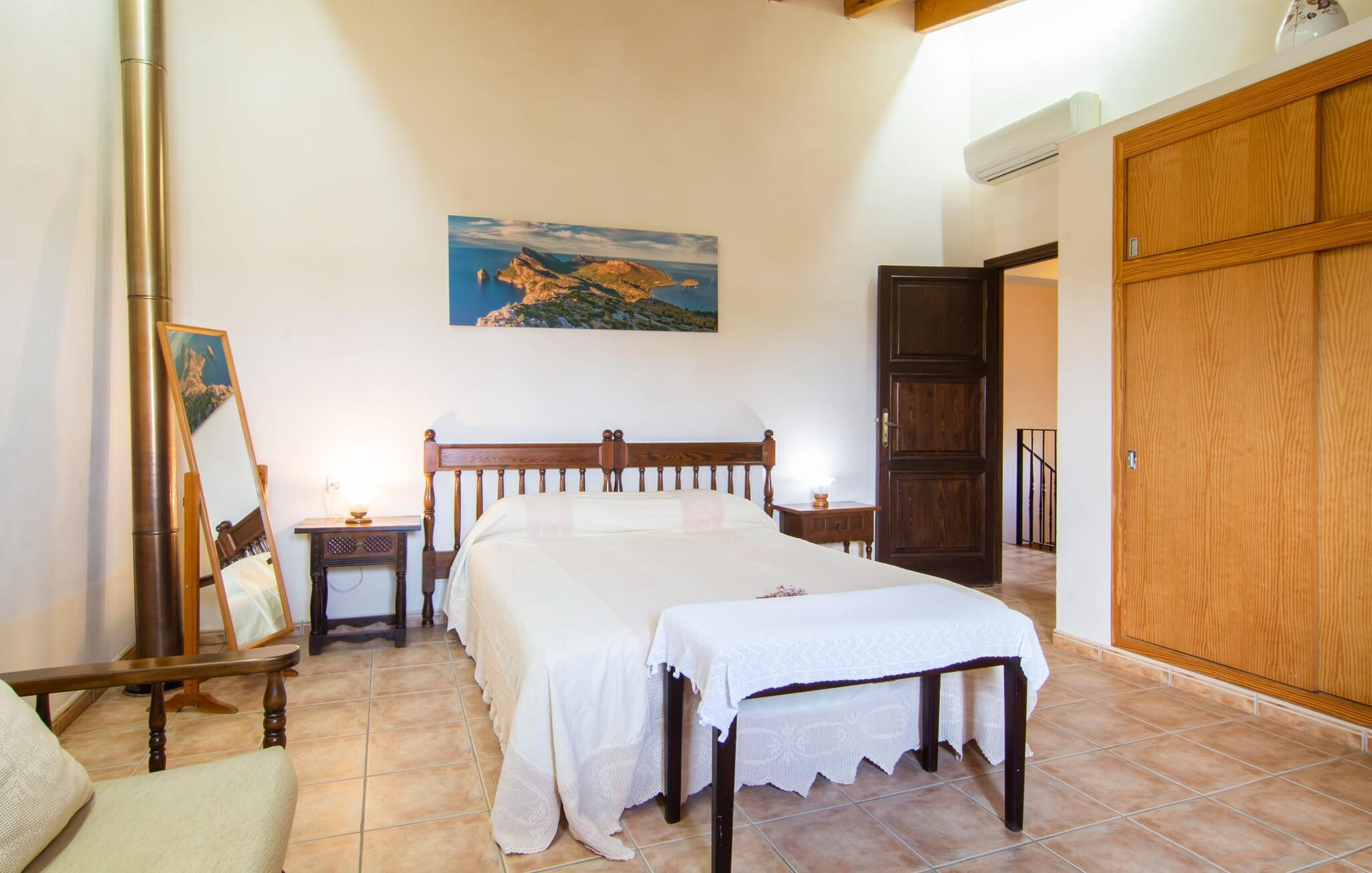 Nur gut 2 km vom kleinen Dörfchen Campanet am Fuße der Serra de Tramuntana entfernt, bietet die urig-charmante Finca „Sa Mata Marina“ bis zu sechs Gästen einen relaxten Urlaub auf Mallorca. Je nach Wind kann die in der Nähe gelegene Straße, die Sie perfekt in alle Himmelsrichtungen anbindet, akustisch wahrnehmbar sein. Wenn Sie Campanet entdeckt und den dortigen Wochenmarkt besucht haben, fahren Sie zum Beispiel mal nach Sa Pobla (10 Minuten) und schlängeln sich durch die Altstadt mit ihren Cafés, Restaurants und Lädchen. Etwa 16 km liegen zu den nächsten Stränden, etwa der langen Bucht von Alcúdia.