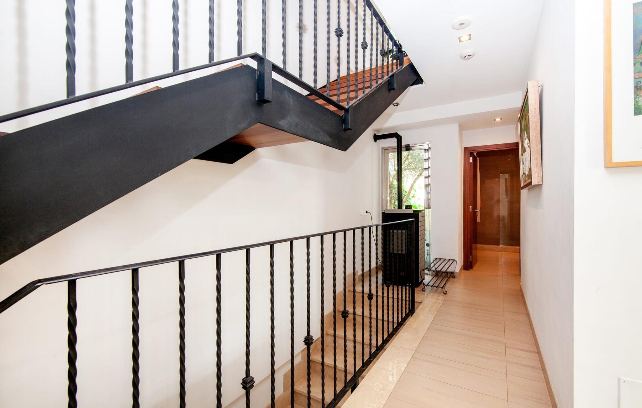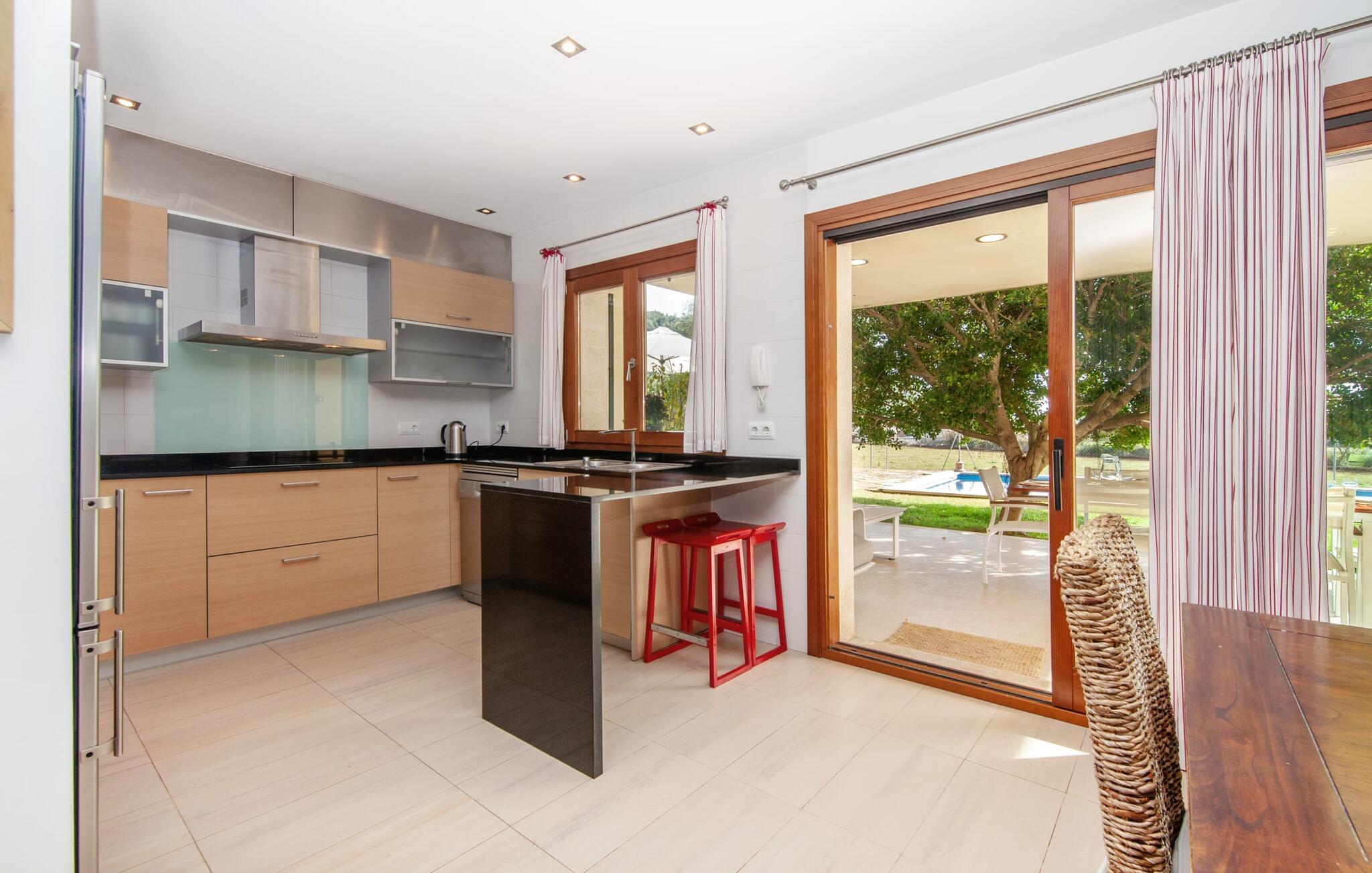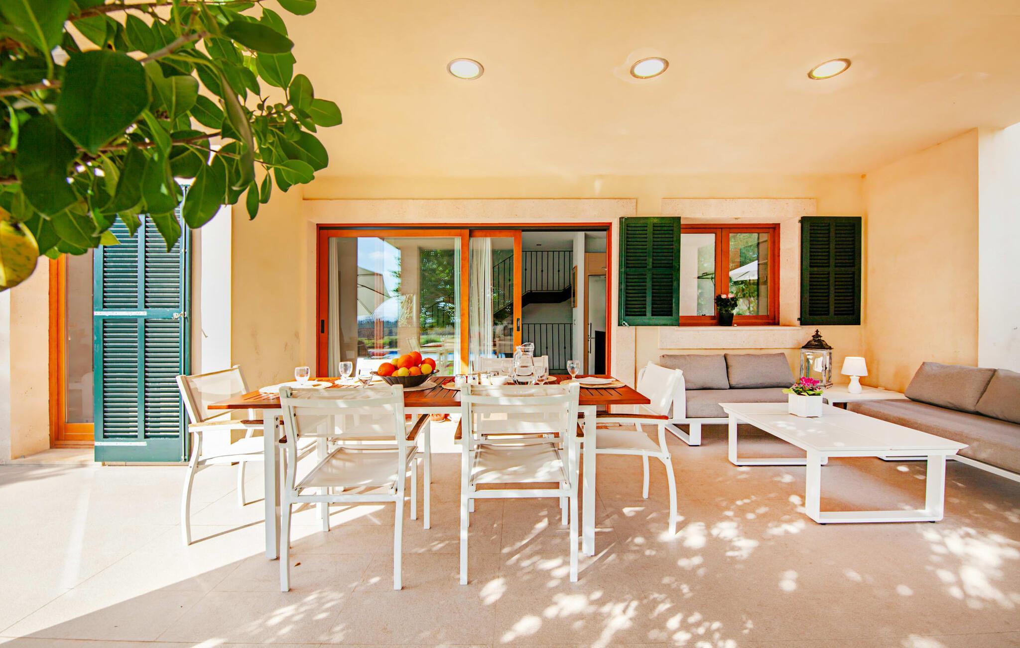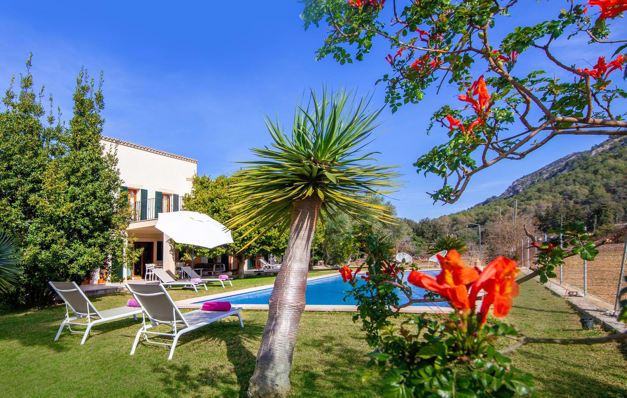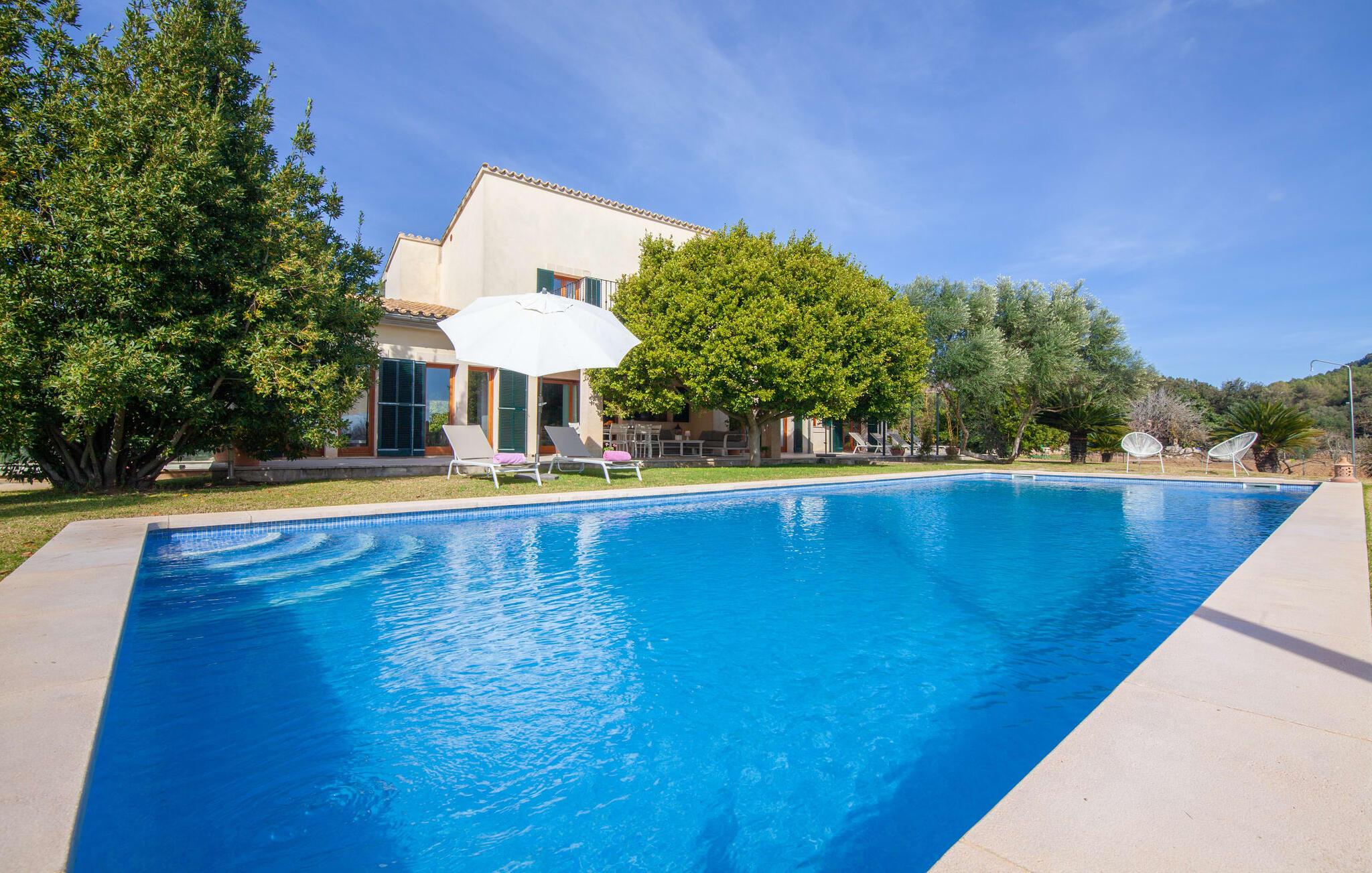 Dieses wunderschöne Ferienhaus auf Mallorca ist von herrlich üppigen Bäumen umgeben und der Blick von vorne auf die umliegende Landschaft könnte bezaubernder kaum sein. Neben der hohen Palme möchte man sofort sein Lager aufschlagen und auf einer der bequemen Liegen ein Buch und sein Lieblingsgetränk genießen. Fortfahren! Auf dem Rasen gibt es viel Platz zum Ausruhen für ausgedehnte Stunden der Entspannung, und die Kinder, die mitgekommen sind, werden sich bestimmt über den Platz zum Toben freuen! An warmen Tagen gibt es natürlich kein Halten für Erfrischung, das lange Becken lädt zu ein paar Bahnen oder zum Planschen ein. Der Pool ist über eine Ecktreppe sehr einfach zu erreichen und fällt dann angenehm ab. Schwimmen mit Bergblick! Die stilvoll eingerichteten, offenen oder überdachten Terrassenbereiche laden zum Entspannen direkt am Haus ein. Hier sind die Abstände zu Küche & Co. sind kurz, ohne Kompromisse bei der Aussicht ins Grüne einzugehen.