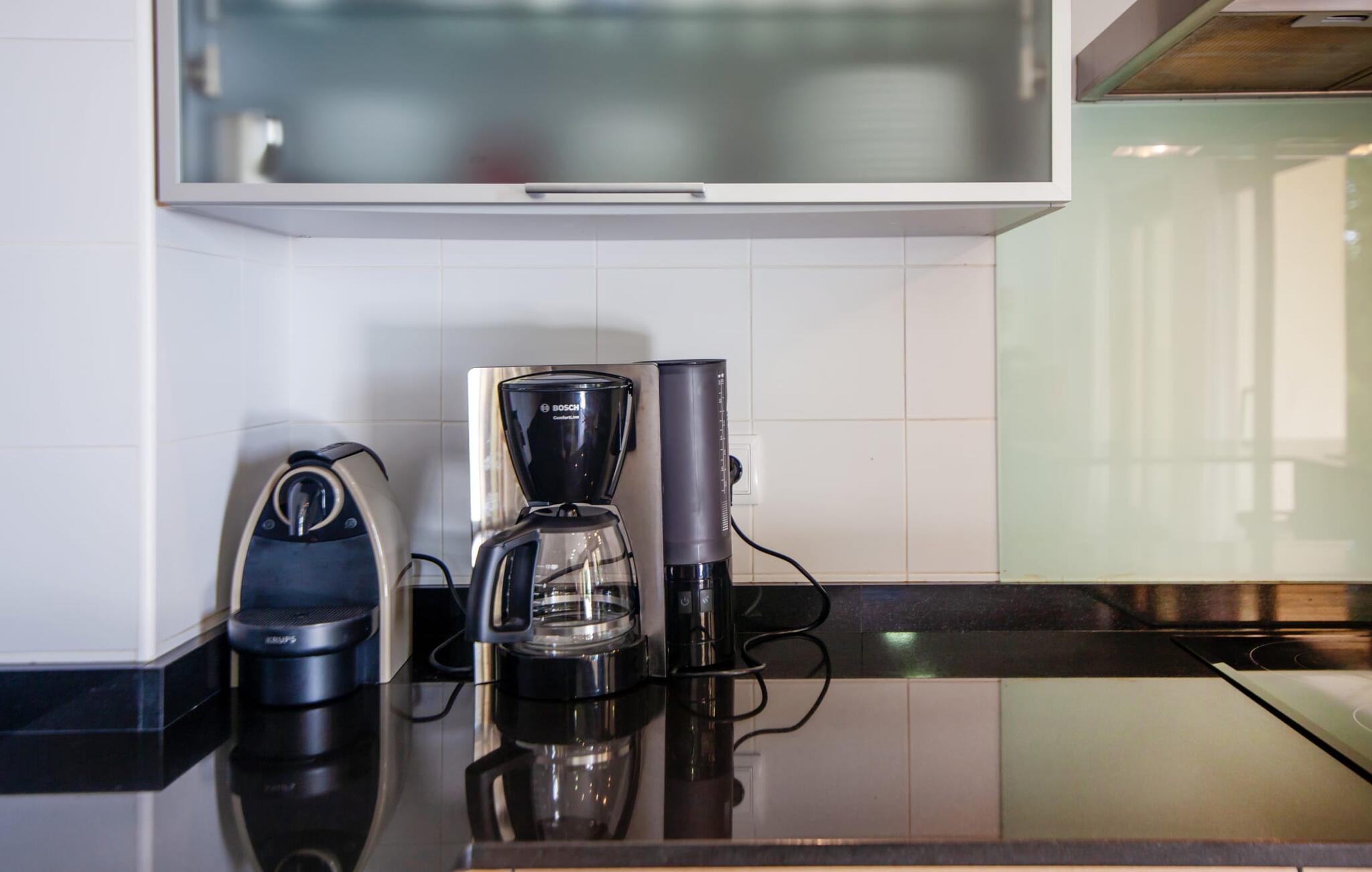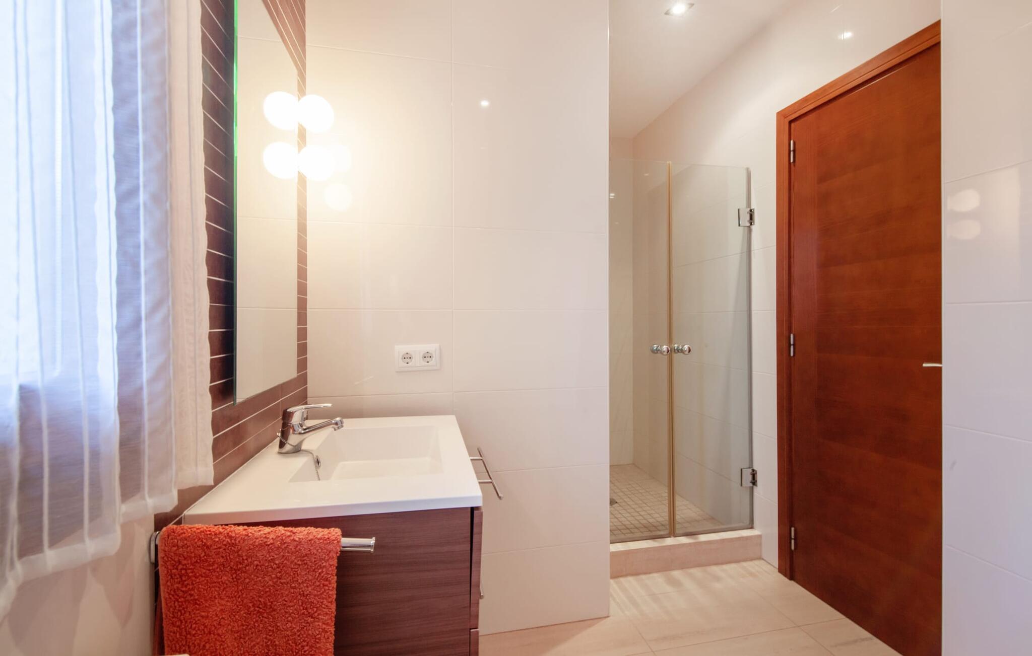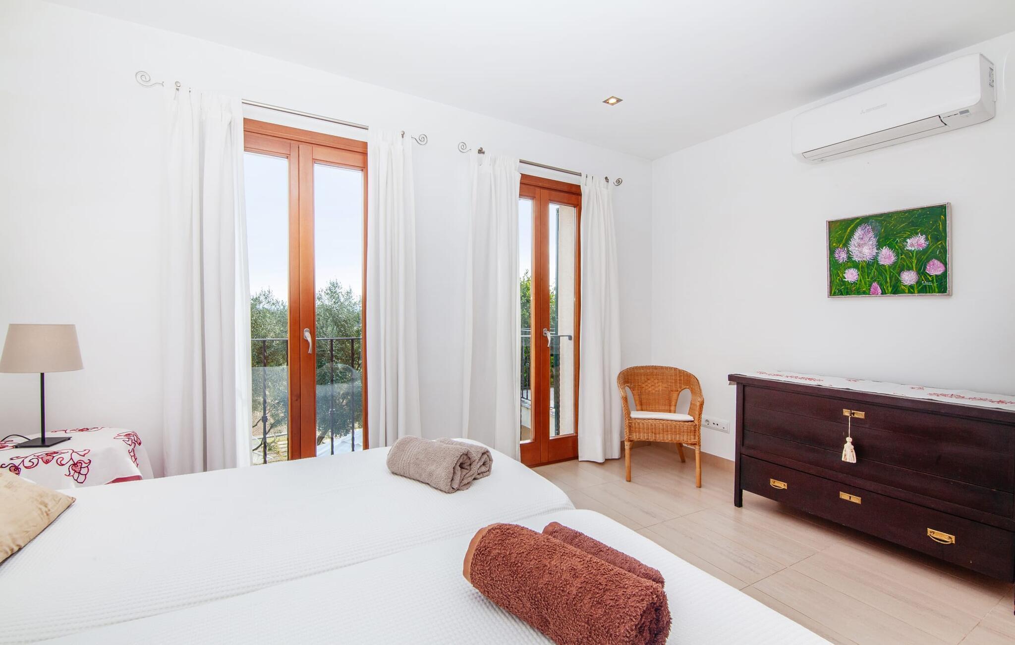 Auch das Innere des Hauses ist einladend: Viel Harmonie in Form absolut harmonisch arrangierter Formen, Materialien und Farben sowie viele lichtdurchflutete, bodentiefe Fenster schaffen eine Atmosphäre purer Behaglichkeit. Bequeme Polstermöbel laden dazu ein, die Entspannung drinnen mit einem schönen Blick nach draußen zu zelebrieren. Ob der Kamin oder der Fernseher (oder beides) an einem kühlen Abend für Gemütlichkeit sorgt, liegt ganz bei Ihnen. Vielleicht ist es ein gutes Gespräch und ein leckeres Glas Rotwein, die die gemeinsame Zeit noch angenehmer machen? Von hier aus gibt es einen fließenden Übergang zum Essbereich und der angrenzenden, voll ausgestatteten Küche, in der alles für die Selbstversorgung bereit steht. Auf dieser unteren Etage befinden sich außerdem ein Schlafzimmer mit Doppelbett und ein Badezimmer. Im Obergeschoss befinden sich drei weitere Schlafzimmer und zwei Badezimmer, eines davon en Suite. Auch die Schlafzimmer punkten mit bodentiefen Fenstern und einer superschönen Aussicht. Mittlerweile dürfte klar sein: Wer Wert auf Stil und Komfort legt und in seinem Urlaub die schönsten Landschaftsausblicke genießen möchte, ist auf dieser Finca auf Mallorca genau richtig!