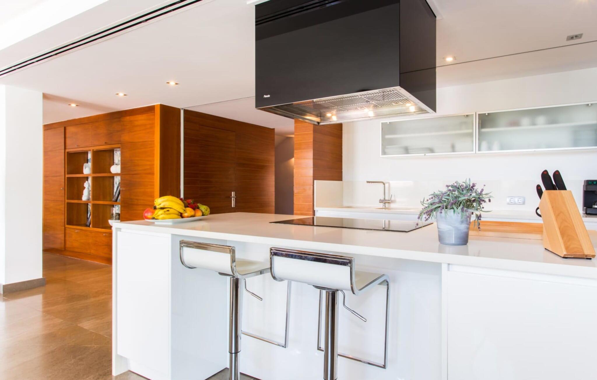 Von der Terrasse aus führen Glastüren in den geschmackvoll und hochwertig eingerichteten Innenraum der Ferienvilla. Im Erdgeschoss erwartet Sie ein helles, freundliches Wohnzimmer. Es ist zum Esszimmer und zur luxuriös ausgestatteten Küche mit Kochinsel und Frühstückstheke hin offen. Auf dieser Ebene befinden sich auch eines der drei gemütlichen Schlafzimmer und ein Badezimmer. Im Obergeschoss befinden sich ein weiteres Doppelzimmer mit eigenem Bad und ein elegantes Hauptschlafzimmer. Beide Zimmer haben Zugang zu einer Sonnenterrasse mit herrlichem Meerblick. Das Haus ist komplett mit Klimaanlage und Heizung ausgestattet. Gerne können Sie bei Bedarf auch Home-Office-Arbeit erledigen. Es gibt eine stabile WLAN-Verbindung und ein Glasfasernetz.