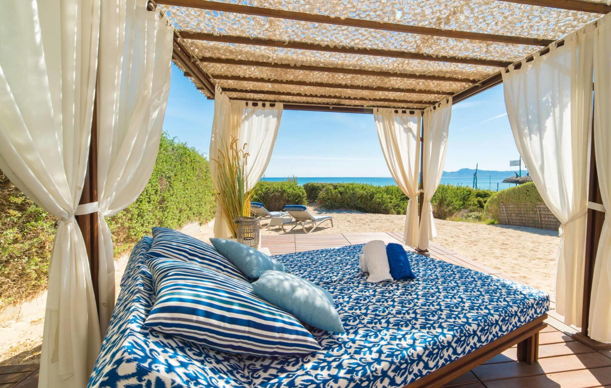 Von hier aus führt ein kurzer Weg über die Dünen direkt zum flachen, türkisblauen Wasser der Playa de Muro an der Ostküste. Sie können die wunderschönen Sonnenaufgänge entweder von Ihrem Bett aus oder von der herrlichen Liege in Ihrem Strandgarten aus genießen. Genießen Sie Ihre Mahlzeiten auf der überdachten Terrasse am Haus. Es bietet einen sensationellen Blick auf das Meer. Bei Bedarf kann der Schattenbereich durch eine Markise erweitert werden.
