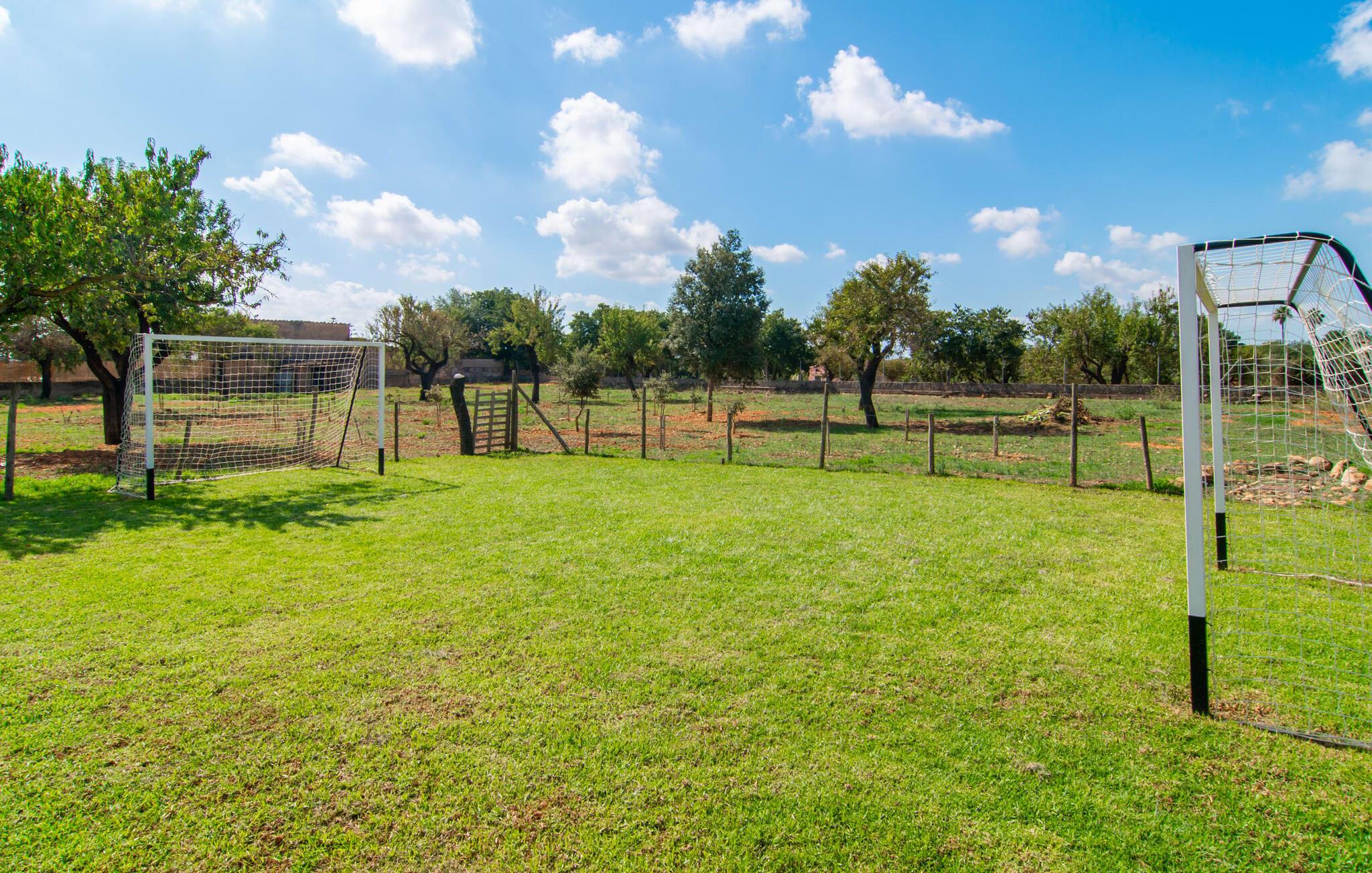 In freundlichem, sonnigem Gelb und mit braunen Fensterläden aus Holz ragt die Villa „Sa Tanqueta“ in den wunderschönen blauen Himmel über dem ländlichen Zentrum Mallorcas. Das Haus liegt auf einem gepflegten Grundstück von über 5.000 m², das insbesondere Familien mit Kindern viel Abwechslung bietet. Während die Erwachsenen auf der überdachten Terrasse sitzen oder auf den Sonnenliegen entspannen, träumen und in die Ferne blicken, können die Kleinen im abschüssigen Pool oder auf dem angrenzenden Fußballplatz spielen und sich anschließend auf der Schaukel austoben. Später können sich alle in der gut ausgestatteten Außenküche neben dem Pool, eingerahmt von im Wind wiegenden Vorhängen, versammeln und die frisch auf dem Grill zubereiteten Köstlichkeiten genießen – ein perfekter Tag für Jung und Alt.