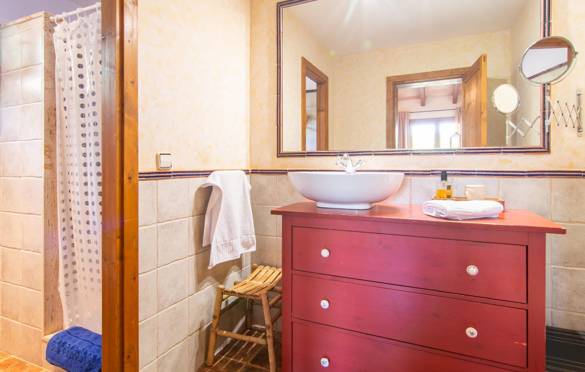 Warm, einladend und intim: So lässt sich das Interieur von „Sa Tanqueta“ am besten beschreiben – einem wunderschönen, gemütlichen Zuhause auf Zeit. Die Villa besticht durch ihr ländlich-rustikales Ambiente, gekonnt kombiniert mit modernen Möbeln und hübschen Dekorationsdetails. Im Erdgeschoss finden Sie das großzügige Esszimmer, inklusive großem Holz-Esstisch mit passenden bequemen Stühlen, sowie die gemütliche Küche, wo ein weiterer Tisch für gemeinsame Mahlzeiten auf Sie wartet. Zum Erdgeschoss gehören auch die drei Doppelschlafzimmer, davon ein Kinderzimmer mit Etagenbett und eigenem Schreibtisch, sowie zwei zum Stil des Hauses passende Badezimmer, eines davon mit Badewanne. Eine sanft geschwungene Treppe führt in die obere Etage, wo sich das Wohnzimmer mit Sofa, Sessel, Kamin und Fernseher befindet. Um sicherzustellen, dass Sie einen Platz für Ihre abendlichen Snacks und ein Glas Inselwein haben, verfügt dieser Raum auch über einen größeren Couchtisch aus Glas.