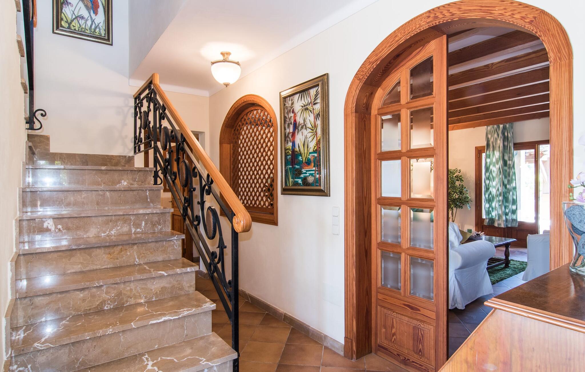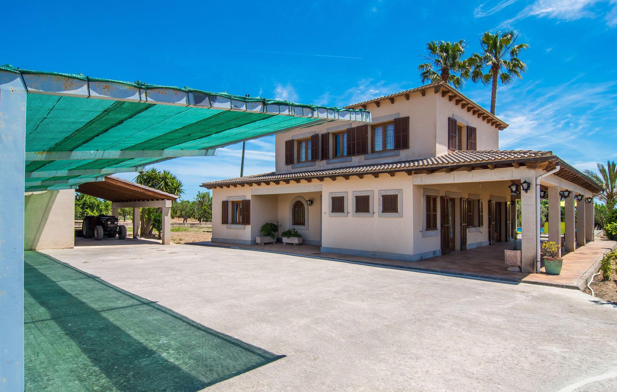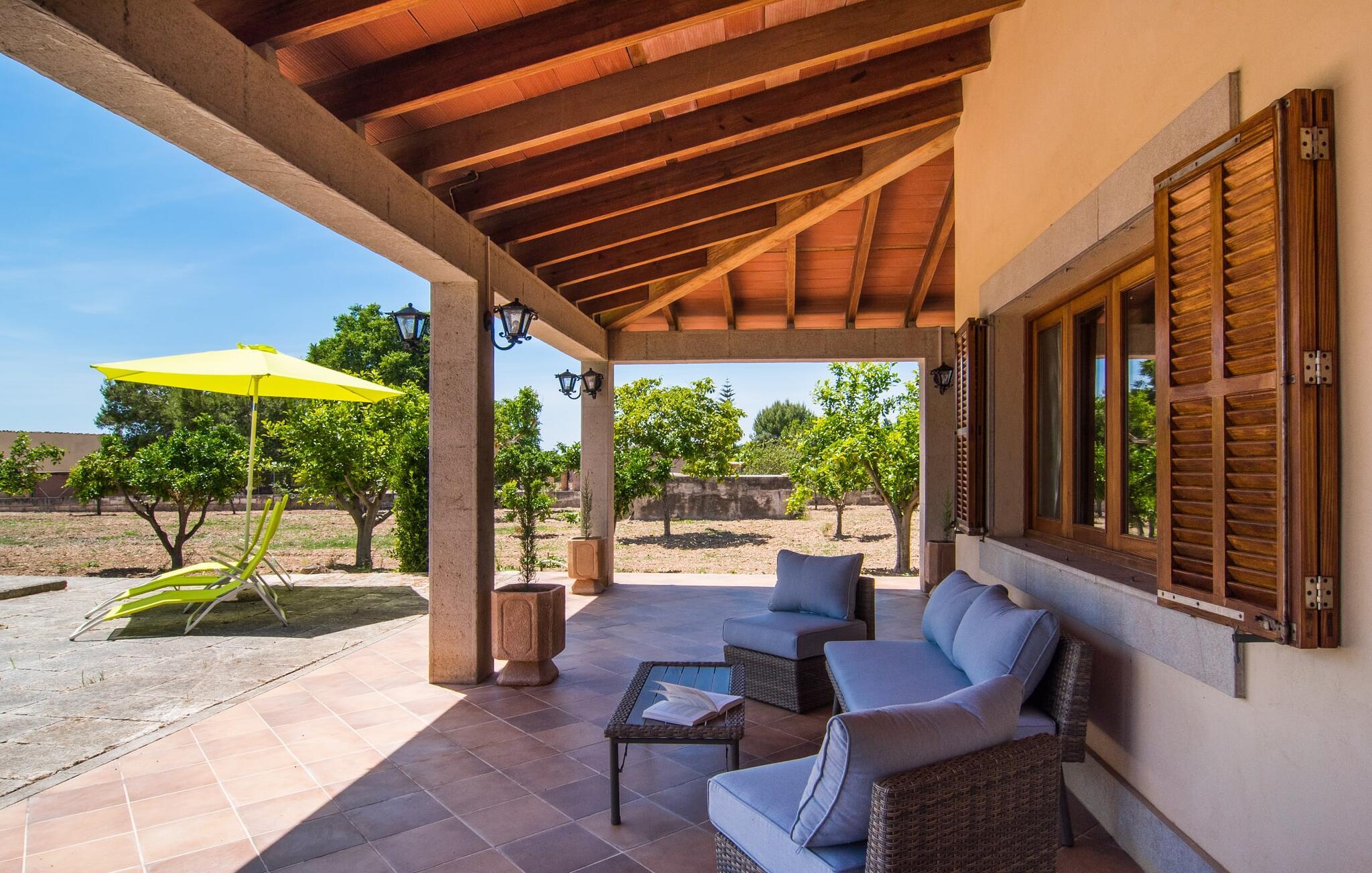 Der Urlaub hat einen anderen Zeitrahmen – das langsamere Tempo und die Zeit, die man mit Familie und Freunden verbringt, hilft einem, Abstand vom Stress des Alltags zu gewinnen. In einer vom Tourismus weitgehend unberührten ländlichen Region lassen sich offene Fragen manchmal einfach dadurch lösen, dass man sie in entspannter Atmosphäre mit Freunden oder der Familie bespricht. Die Villa „Sa Terra Grosa“ ist ein Anwesen, das den perfekten Ausgangspunkt für einen erholsamen Urlaub dieser Art darstellt und durch die Lage inmitten einer wunderschönen Landschaft mit sanften Hügeln noch mehr zu bieten hat. Die elfenbeinfarbene Villa liegt am Stadtrand von Binissalem und ist von einem Obstgarten und riesigen Palmen umgeben. Sie werden es lieben, Ihre Zeit auf den großzügigen, überdachten Terrassen und auf der sonnendurchfluteten Dachterrasse zu verbringen. Das Landhaus bietet angenehmen Privatraum auf einem abgelegenen Grundstück und man kann von der Veranda aus fast direkt in den Pool springen und das kühle Nass genießen – ganz in der Natur, wenn man so möchte. Anschließend können Sie sich auf den stilvollen Sonnenliegen sonnen (bei Bedarf auch im Schatten des Sonnenschirms). Wenn ein täglicher Grillabend zu einem gelungenen Urlaub gehört, werden Sie vom eingebauten, überdachten Grill begeistert sein. Es befindet sich praktischerweise direkt an einem Ende einer hochwertigen Essgruppe aus synthetischem Rattan, wo Sie das Essen servieren können. Wenn es etwas kühler wird oder die Schlafenszeit naht, verlassen Sie diesen rundum erholsamen Bereich und ziehen sich in Ihr einladendes Urlaubszuhause zurück.