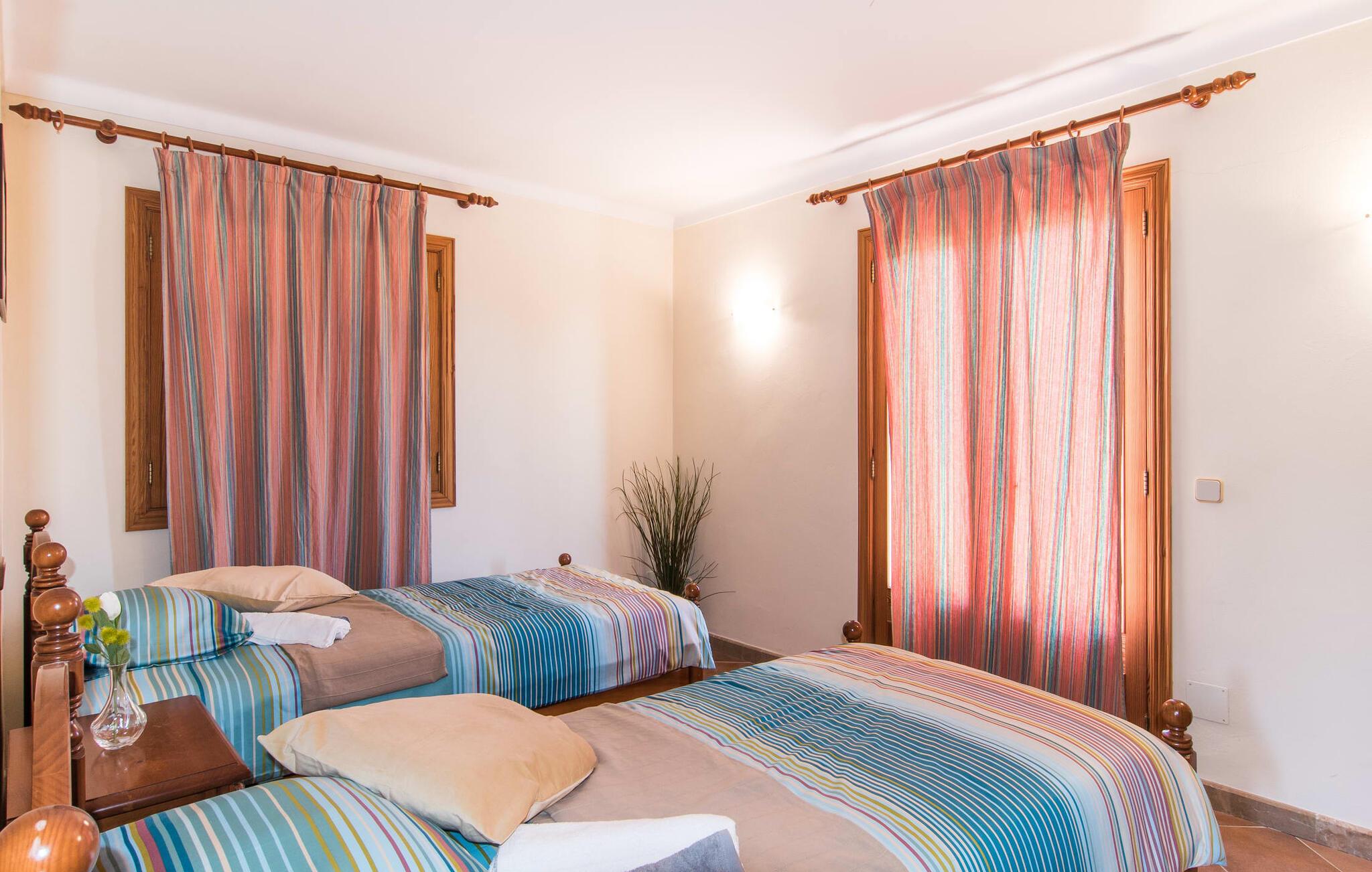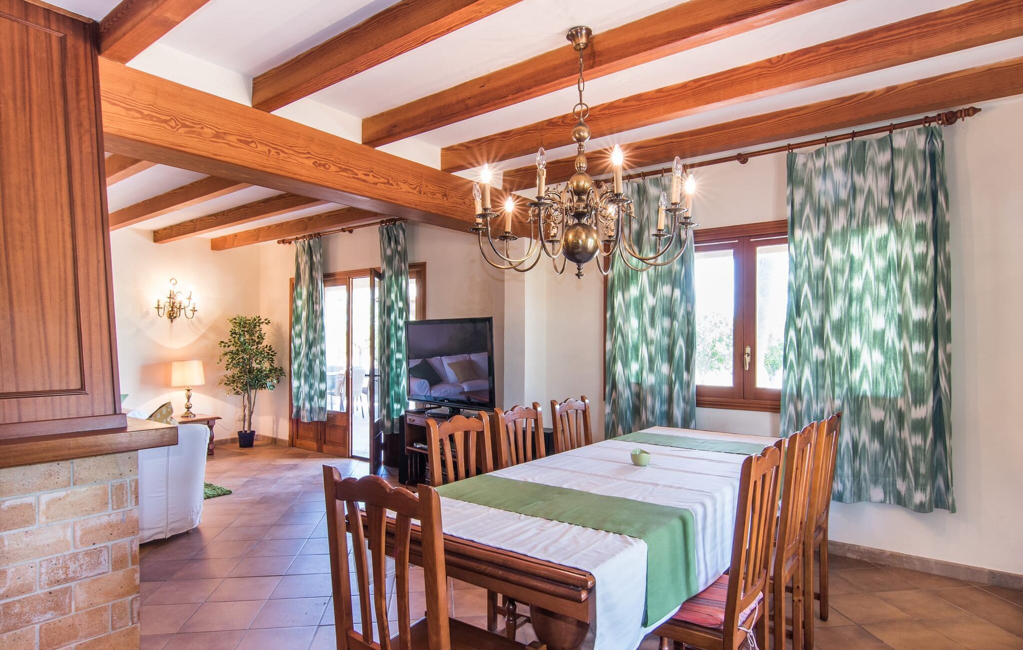 Das Innere des rustikalen Gebäudes wurde einem Facelift unterzogen, das die traditionellen Attribute des mallorquinischen Designs mit einem modernen Landhausstil verbindet – und man kann mit Fug und Recht sagen, dass diese Kombination gelungen ist. Allein das große Wohnzimmer mit seiner harmonischen Farbpalette, hochwertigen Holzmöbeln, dunklen Keramikfliesen, Wänden in hellen, dezenten Farben und einigen dekorativen Details in einem wohnlichen Moosgrün, das sich in den Textilien widerspiegelt, macht schon Eindruck Bilder aufhängen. Die Wahl der Farben drückt die Nähe und Verbundenheit zur Natur aus – und wenn Sie Kamine lieben, passt der offene Kamin in der Mitte des Raumes perfekt ins Bild. Die angrenzende, rustikale Landhausküche besticht durch authentischen Bauerncharme und verfügt gleichzeitig über alle technischen Annehmlichkeiten für einen unbeschwerten Selbstversorger-Urlaub. Die Raumaufteilung ist auch ideal für zwei Familien mit insgesamt bis zu acht Personen. Auf jeder Etage befinden sich zwei klimatisierte Doppelzimmer und ein Badezimmer mit Badewanne. Die Kinder haben in den beiden Zimmern mit Einzelbetten ihren eigenen Bereich; Die beiden Queensize-Betten eignen sich ideal als gemütliches Elternschlafzimmer. Da es im Obergeschoss auch einen kleinen Wohnbereich mit zwei Sofas gibt, ist es fast so, als hätte man zwei getrennte Unterkünfte – wunderbar für einen Mehrgenerationenurlaub. Nicht zu vergessen: Dank der Zentralheizung und dem gemütlich knisternden Kamin verliert „Sa Terra Grosa“ auch in den kühleren Monaten des Jahres nichts von seinem besonderen Charme.
