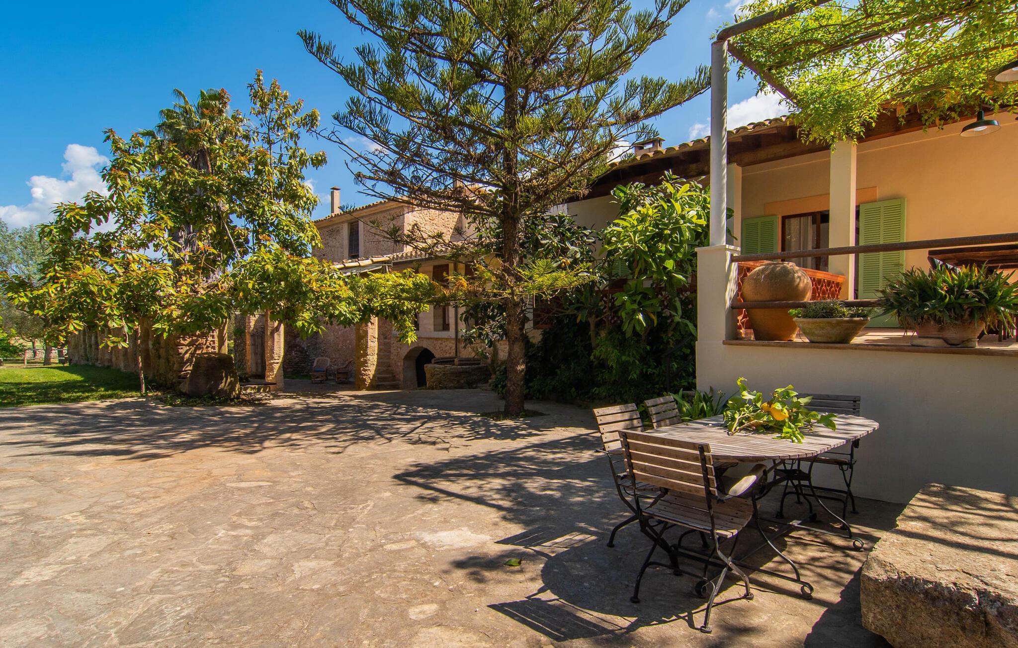 Als Neuankömmling in der Villa „Sa Teulera“ werden Sie sofort von der beeindruckenden, üppigen Grünanlage verzaubert sein, die das ebenso imposante Gebäude weitläufig umgibt. Gepflegte Rasenflächen, hohe Palmen und andere mediterrane Pflanzen prägen den Ausblick ebenso wie abwechslungsreiche, einladende Terrassenbereiche, Treppen, Mäuerchen und originelle Dekorationen. Zahlreiche Sitzmöglichkeiten im luftigen Schatten oder unter freiem Himmel laden zum Vergnügen des Nichtstuns ein und bieten Ihnen komfortable Möglichkeiten für eine rundum schöne Zeit unter freiem Himmel. In der überdachten, halboffenen ehemaligen Scheune können Sie gemütlich sitzen oder Tischtennis spielen. Die malerischen Rundbogenfenster und die alten landwirtschaftlichen Geräte vermitteln hier ein unglaublich rustikales Flair. Der leicht erhöhte Pool bietet an warmen Tagen die Möglichkeit zu einem erfrischenden Bad. Der Pool ist über eine Leiter erreichbar und mit einem Loungebereich ausgestattet. Insgesamt sechs Poolliegen laden zum ausgiebigen Sonnenbaden ein. Je nach Tageszeit finden Sie auf dem Anwesen auch schöne Schattenplätze, die zum Entspannen und Entspannen einladen. Was die Suche nach Lieblingsorten angeht, sind auf diesem Anwesen keine Grenzen gesetzt. An lauen Abenden können Sie sich genau einen dieser Plätze aussuchen und in geselliger Runde ein kulinarisches Barbecue feiern. Köstliche regionale Zutaten können idealerweise auf einem der nahegelegenen Märkte erworben werden.