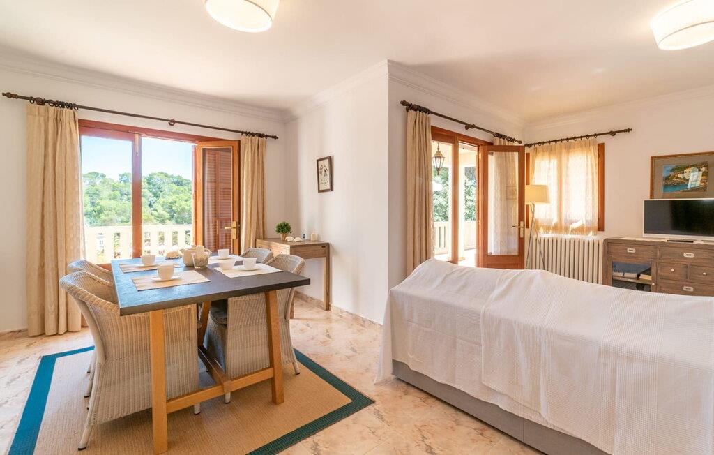 Diese riesige, zweistöckige Villa liegt direkt in der Bucht von Cala Santanyi. Es ist mitten in der Bucht gebaut. Es entsteht eine vielschichtige Terrassenlandschaft auf verschiedenen Ebenen. Das Haus liegt auf einem Grundstück mit filigranen Bruchsteinmauern, umgeben von üppiger grüner mediterraner Flora mit Pinien und Olivenbäumen. Auch der Ausblick auf das azurblaue Meerwasser und den weißen Sandstrand ist paradiesisch. Auf einen Pool muss man an diesem Ort wahrlich nicht verzichten, denn das Domizil hat noch viel mehr zu bieten: Über eine in Stein gemeißelte Treppe gelangt man ohne Umwege in die Bucht. Auf der unteren Terrasse gibt es aber eine sehr praktische Außendusche mit hübschen blauen Mosaikfliesen, sodass Sie nach einem Bad im Meer duschen können, ohne hineingehen zu müssen. Anstatt sich einen guten Platz am Strand reservieren zu müssen, können Sie sich auf einer der vielen hauseigenen Liegen auf dem Grundstück entspannen. Genug von der Sonne? Schnappen Sie sich ein gutes Buch und ein kühles Getränk und dann ab in den Schatten der überdachten Terrassen.