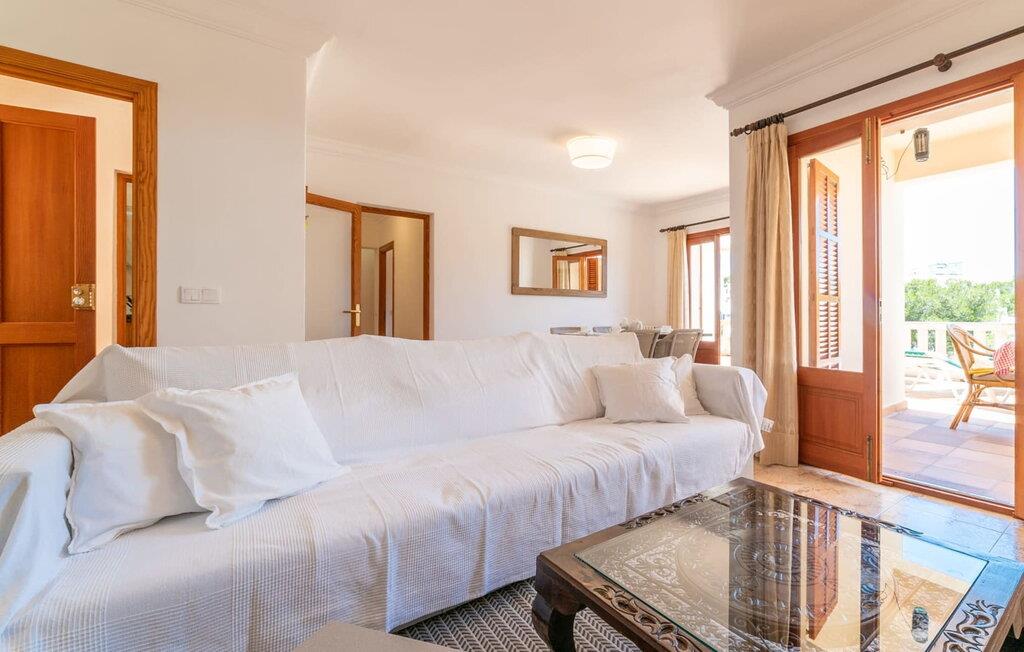 Das elegante weiße Gebäude verfügt über zwei separate Wohneinheiten, jede mit eigener Küche und Wohnzimmer. Es bietet Platz für eine Reisegruppe von bis zu 12 Personen. Im Erdgeschoss befinden sich vier Schlafzimmer mit drei Badezimmern. Darüber hinaus befindet sich hier das schöne Wohnzimmer in typisch mallorquinischer, pflegeleichter Einrichtung mit Bodenfliesen und einer schönen Essecke am rustikalen Holztisch. Entspannen können Sie auf den bequemen Rattanmöbeln im Wohnbereich (mit deutschem Sat-TV-Empfang). Die voll ausgestattete Küche mit Herd, Geschirrspüler und vielem mehr lädt zum vergnüglichen Kochen ein. Antike Bettgestelle in den Schlafzimmern mit ausreichend Stauraum für die Urlaubsgarderobe bieten gemütliche Schlafplätze. Im Obergeschoss befinden sich zwei weitere Schlafzimmer mit Bad und ein zusätzliches Gäste-WC. Auch hier gibt es ein gemütliches Wohnzimmer mit offenem Essbereich und eine voll ausgestattete Küche. Auch für den Urlaub auf dem Balkon eignet sich der Urlaub: Ein Außensitzplatz und mehrere Sonnenliegen laden zum ausgiebigen Sonnenbaden vor dem Sprung ins Meer ein. Ein ideales Feriendomizil für zwei Familien oder eine Reise mit mehreren Generationen – Sie haben das Haus ganz für sich und dennoch eine leicht gewahrte Privatsphäre auch innerhalb der Reisegruppe. Die äußerst freundlichen Vermieter bieten das Haus zu einem sehr günstigen Preis an – für eine Gruppe von bis zu acht Personen können wir sogar einen reduzierten Preis anwenden.