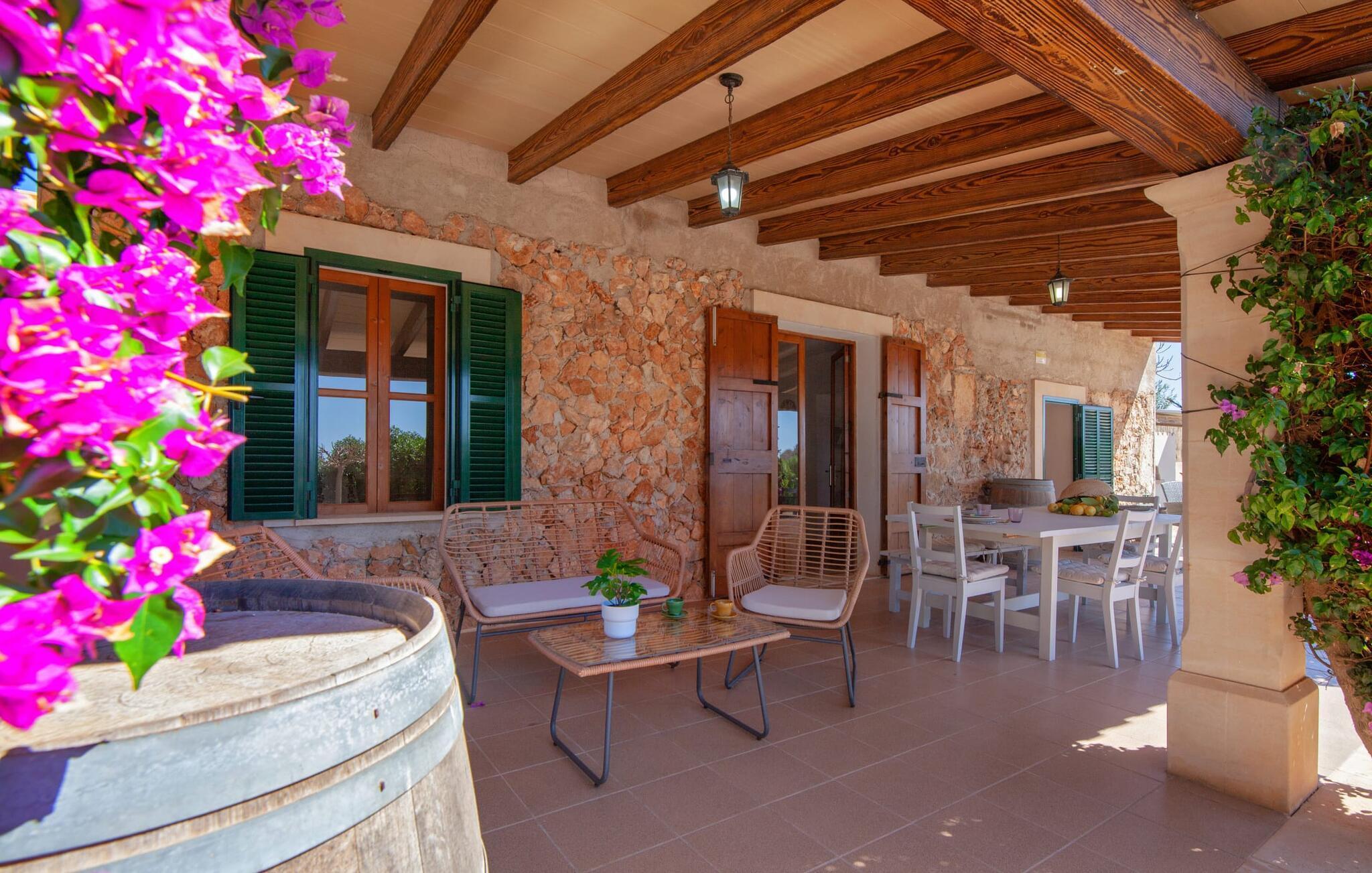 Ursprünglichkeit, Privatsphäre und Weite – wenn Ihnen das gefällt und Sie auf der Suche nach einem charmanten Zuhause für ein Paar sind, sollten Sie dieses Objekt fest im Auge behalten. Denn die Villa „Sa Vela“ vereint diese Elemente auf eine wirklich einladende Weise Weg und stellt einen Zufluchtsort der besonderen Art dar. Zu beachten ist, dass Villen für zwei Personen auf Mallorca kaum zu finden sind, da Ferienhäuser in der Regel deutlich größer gebaut werden. Das 6.000 m² große Anwesen bietet vielfältige Outdoor-Möglichkeiten für einen angenehmen Urlaubsaufenthalt. Das teilweise umzäunte Grundstück ist in Naturbereiche, einen hübschen Kiesbereich am Pool und den gefliesten Terrassenbereich direkt am Haus unterteilt. Der 4 x 3 m große Pool liegt umgeben von einer Natursteinmauer und ist über wenige Stufen bequem zu erreichen. Zum ausgiebigen Entspannen unter dem mediterranen Himmel stehen zwei bequeme Liegen zur Verfügung, ebenso ein Sonnenschirm, wenn die Sonnenstrahlen zu stark werden. Idealerweise gibt es in diesem Raum auch einen überdachten Bereich, in dem Sie etwas luftigen Schatten finden können. Auf dem hier platzierten Tisch haben Sie außerdem die Möglichkeit, eine Ihrer Mahlzeiten oder auch nur ein kühles Getränk zu genießen und dabei den schönen Blick in die Ferne zu genießen. Noch mehr Platz und Atmosphäre finden Sie auf der überdachten Terrasse direkt am Gebäude. Hier stehen zwei weitere Tische bereit, so dass ankommende Gäste trotz der Schlichtheit dieses kleinen Lokals den Luxus vollkommener Geräumigkeit genießen können. Wer möchte, kann sich hier nach Lust und Laune ausbreiten und sich jeden Tag einen neuen Lieblingsplatz suchen. Die freiliegenden Balken, Säulen, Fliesen und Natursteinwände zaubern ein rustikales Ambiente, das durch die hübschen Kletterblumen dekorativ aufgewertet wird. Der Großteil des verhältnismäßig großen Anwesens erstreckt sich vor Ihnen und ermöglicht Ihnen, Freiheit und Weite nach Herzenslust zu erleben, angefangen bei einem erfrischenden Frühstück am Morgen bis hin zu einem herzhaften Barbecue am Abend. bei dem Sie köstliche, frische Zutaten aus der Region genießen können.