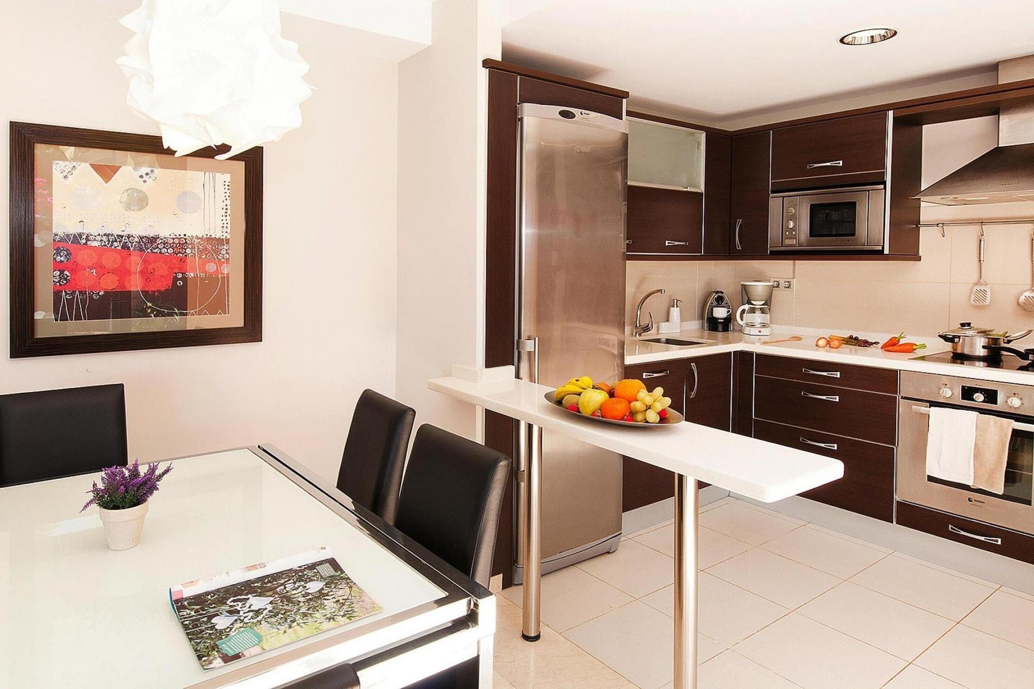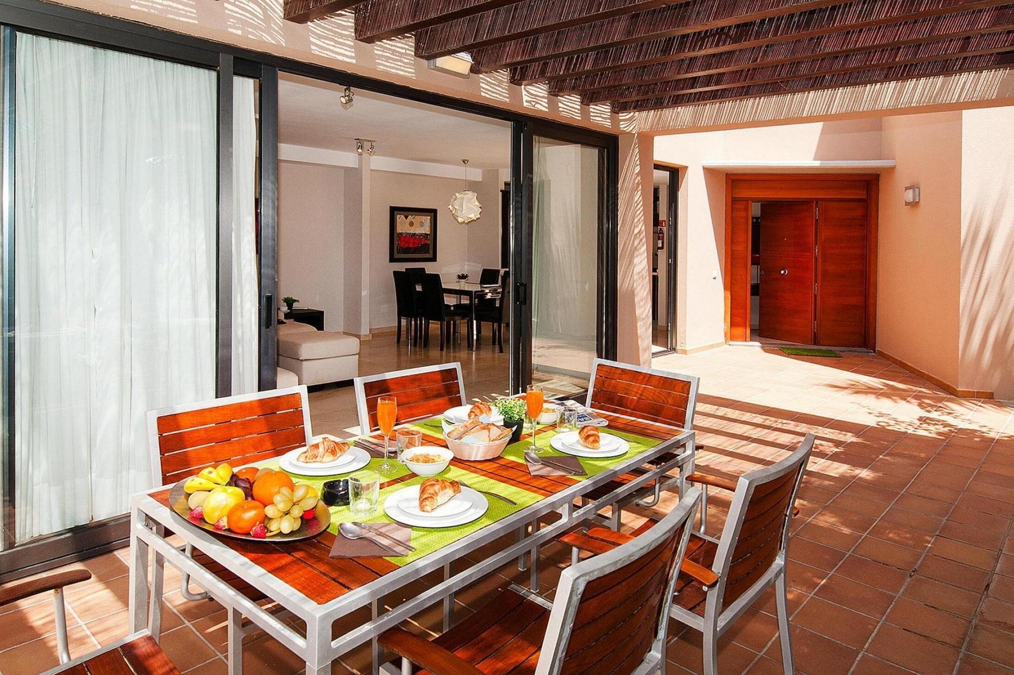 Hier ist alles perfekt für Ihren komfortablen Urlaub in einer sehr privaten Atmosphäre: Angefangen beim spektakulären Blick auf die Berge von Maspalomas, über den exklusiven Service des noblen Resorts bis hin zur stilvollen Einrichtung Ihrer Villa. Ihr privater Pool vor der Terrasse lädt Sie zu einer Erfrischung ein, wann immer Sie möchten. Die üppigen Sträucher und Blumen im Garten spenden Ihnen angenehmen Schatten und schützen Sie vor etwaigen Blicken der Nachbarn. Selbstverständlich ist die Küche perfekt ausgestattet, sodass gemeinsames Kochen zum gelungenen Abschluss für ereignisreiche Tage wird. Genießen Sie die Abende stilvoll mit einem Glas Wein auf Ihrer Terrasse. Mit seiner einzigartigen Architektur schmiegt sich dieser charmante Wohnkomplex wunderbar in die Berglandschaft von Maspalomas. Sie wohnen in direkter Nachbarschaft zu mehreren ähnlichen Villen am Rande des exklusiven Golf Resorts Salobre. Für den täglichen Bedarf können Sie sich im kleinen Supermarkt in unmittelbarer Nähe versorgen, ein Restaurant verwöhnt Sie mit kulinarischen Köstlichkeiten. Die beliebten Touristenzentren Maspalomas und Playa del Ingles erreichen Sie mit dem Auto in knapp zehn Minuten.