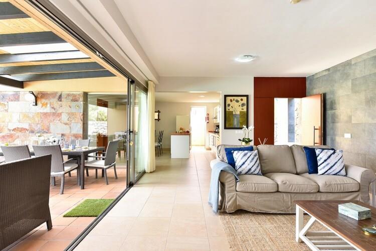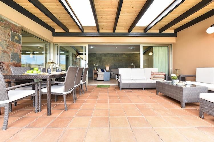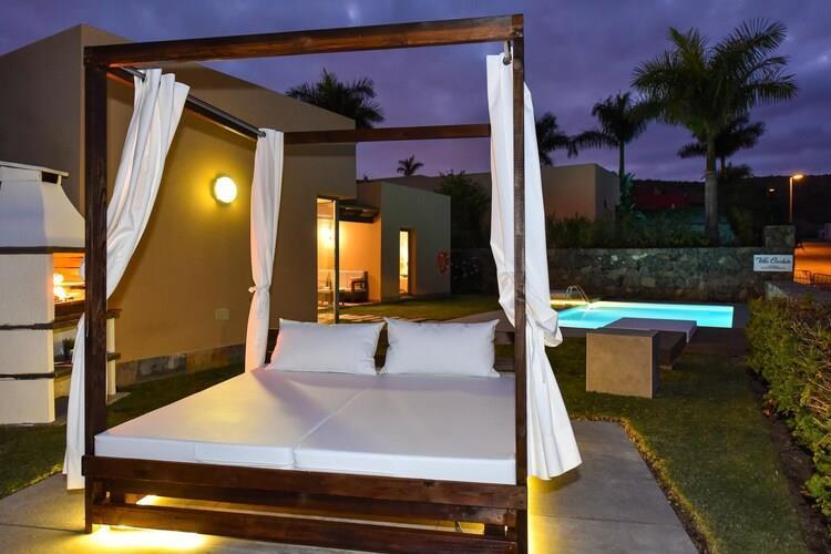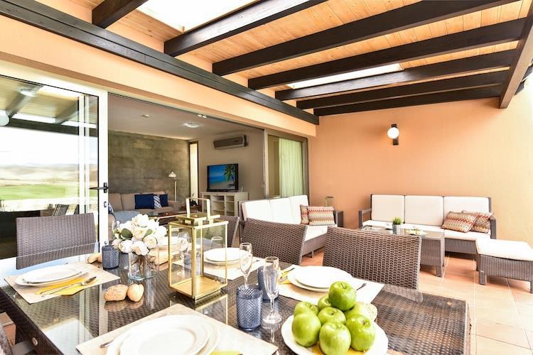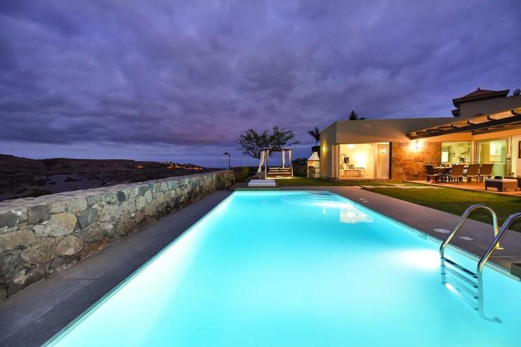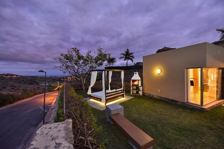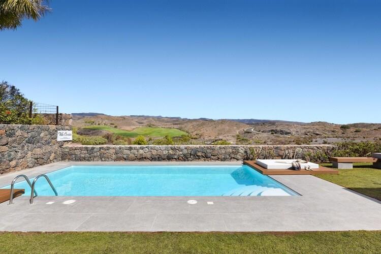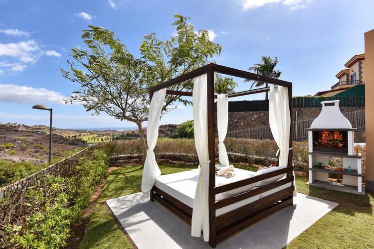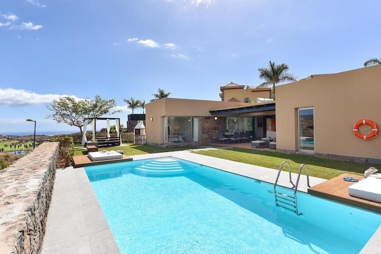 Die Villa mit privatem Außenpool beeindruckt mit Ihrer modernen Bauweise und einem schönen Garten. Die moderne einstöckige Villa liegt in einem exklusiven Komplex auf Gran Canaria. Genießen Sie die exklusive Lage und lassen Sie sich zum Beispiel mit dem täglichen Brötchenservice verwöhnen. Eine der größten Attraktionen ist die große Terrasse mit Gartensofas, um die spektakuläre Aussicht in angenehmer Gesellschaft zu genießen. In den Bergen von Maspalomas ist in einer einzigartigen Landschaft dieser exklusive Wohnkomplex am Rande des Golf Resorts entstanden. In unmittelbarer Nähe können Sie sich im Supermarkt für den täglichen Bedarf versorgen, ein Restaurant verwöhnt Sie mit kulinarischen Köstlichkeiten. Die beliebten Touristenzentren Maspalomas und Playa del Ingles erreichen Sie mit dem Auto in knapp zehn Minuten. Gäste der Villen können den Golfplatz Nord und Süd nutzen. Der Golfplatz Süd (18-Loch) hat auf einer Lauflänge von 6.112 m ein Par von 71 Schlägen, der Golfplatz Nord (18-Loch) verfügt über eine Lauflänge von 5.524 m und hat ein Par von 72 Schlägen. Gäste der Villen erhalten eine Greenfee-Ermäßigung.