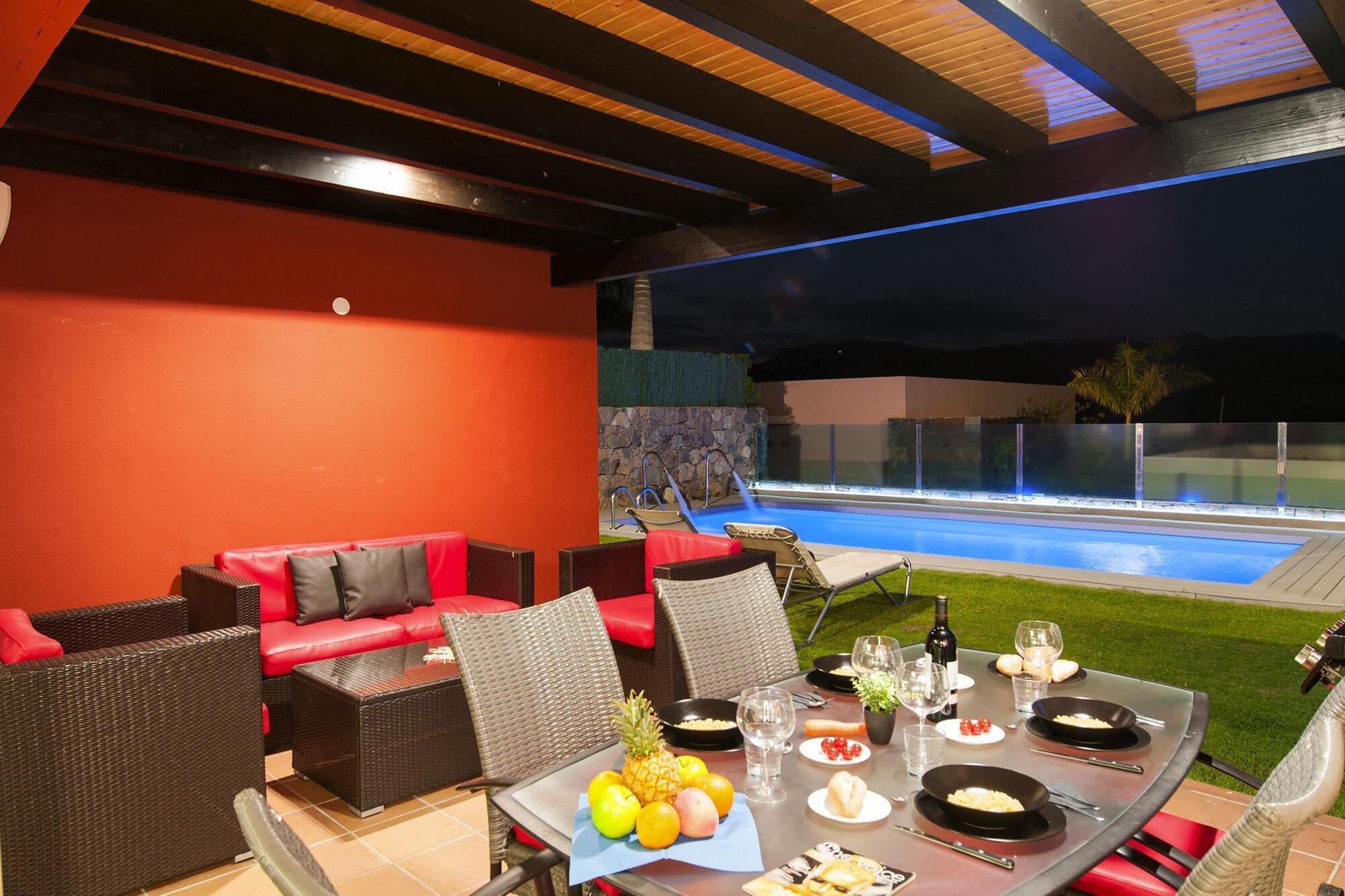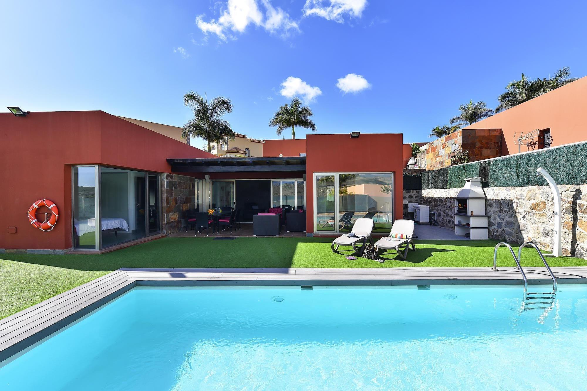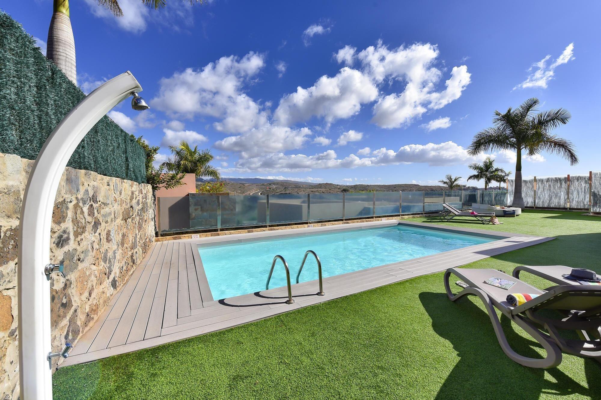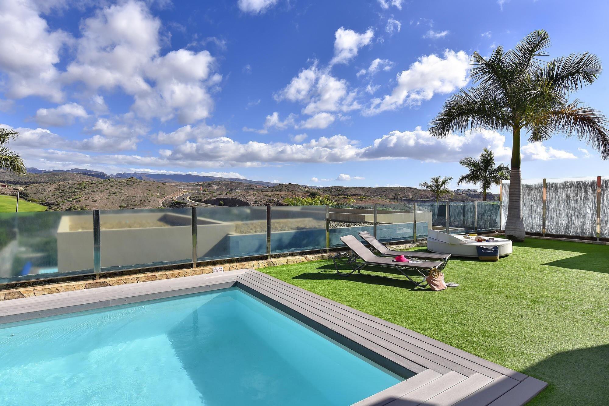 Die einstöckige Villa beeindruckt mit Ihrem modernen Sill und einem wunderschönen Garten mit weitem Ausblick. Sie garantiert zweifellos einen ganz besonderen Urlaub auf Gran Canaria. Genießen Sie die Sonne am Pool oder auf der Terrasse. Die Villa ist mit WLAN (gegen Gebühr), Klimaanlage und SAT-TV ausgestattet, sodass einem unbeschwerten Aufenthalt nichts im Wege steht. In den Bergen von Maspalomas ist in einer einzigartigen Landschaft dieser exklusive Wohnkomplex am Rande des Golf Resorts entstanden. In unmittelbarer Nähe können Sie sich im Supermarkt für den täglichen Bedarf versorgen, ein Restaurant verwöhnt Sie mit kulinarischen Köstlichkeiten. Die beliebten Touristenzentren Maspalomas und Playa del Ingles erreichen Sie mit dem Auto in knapp zehn Minuten. Gäste der Villen können den Golfplatz Nord und Süd nutzen. Der Golfplatz Süd (18-Loch) hat auf einer Lauflänge von 6.112 m ein Par von 71 Schlägen, der Golfplatz Nord (18-Loch) verfügt über eine Lauflänge von 5.524 m und hat ein Par von 72 Schlägen. Gäste der Villen erhalten eine Greenfee-Ermäßigung.
