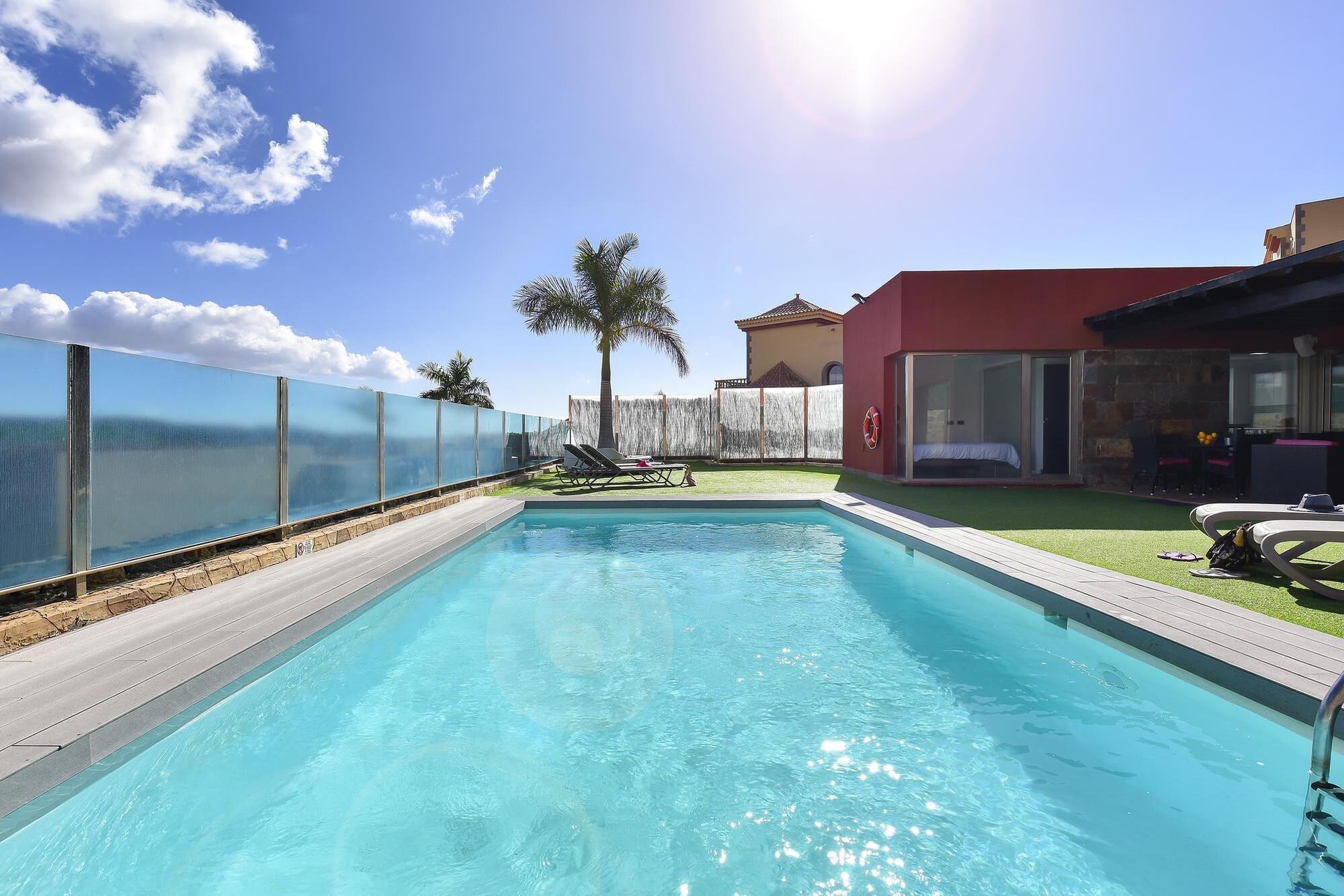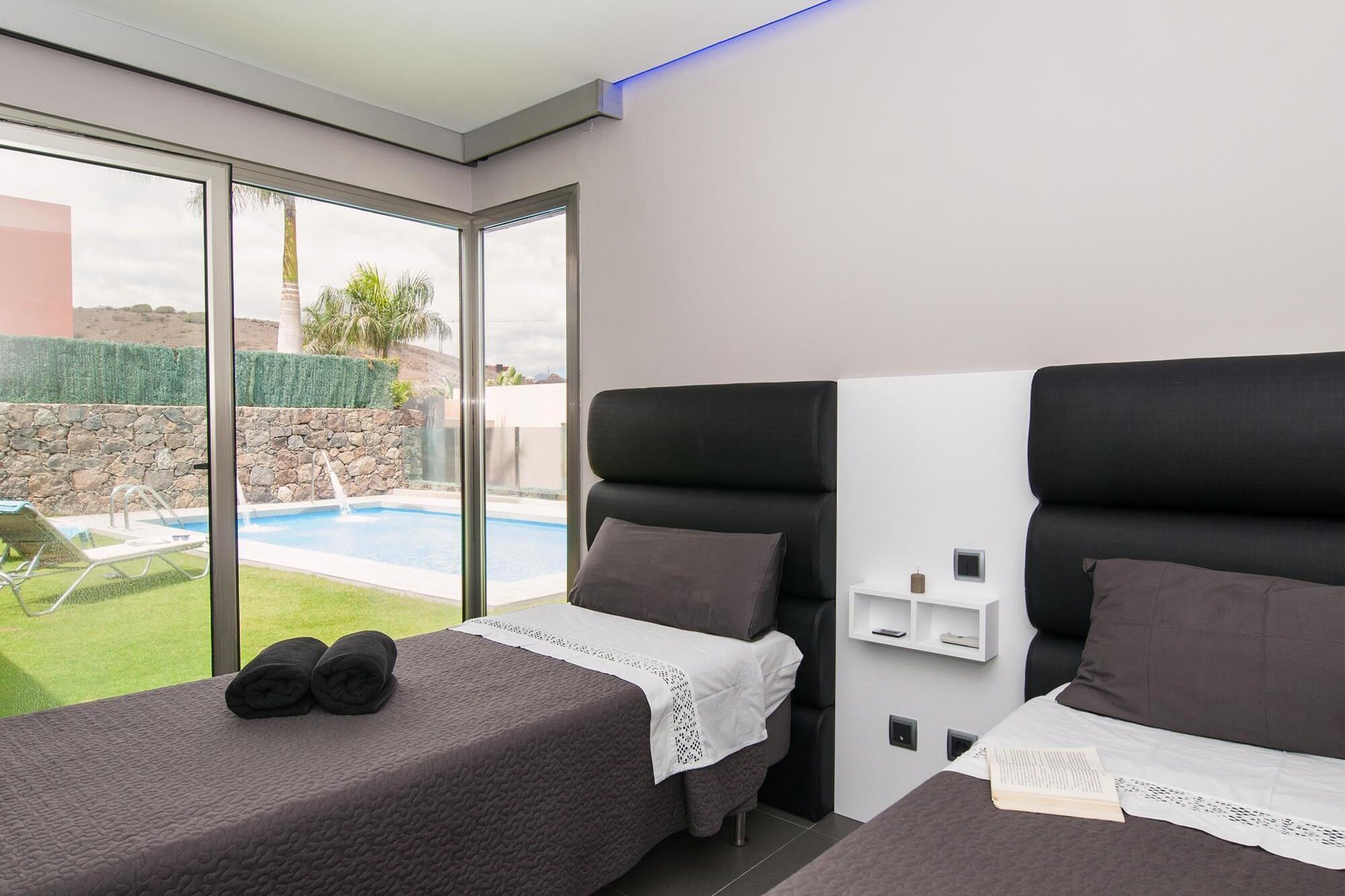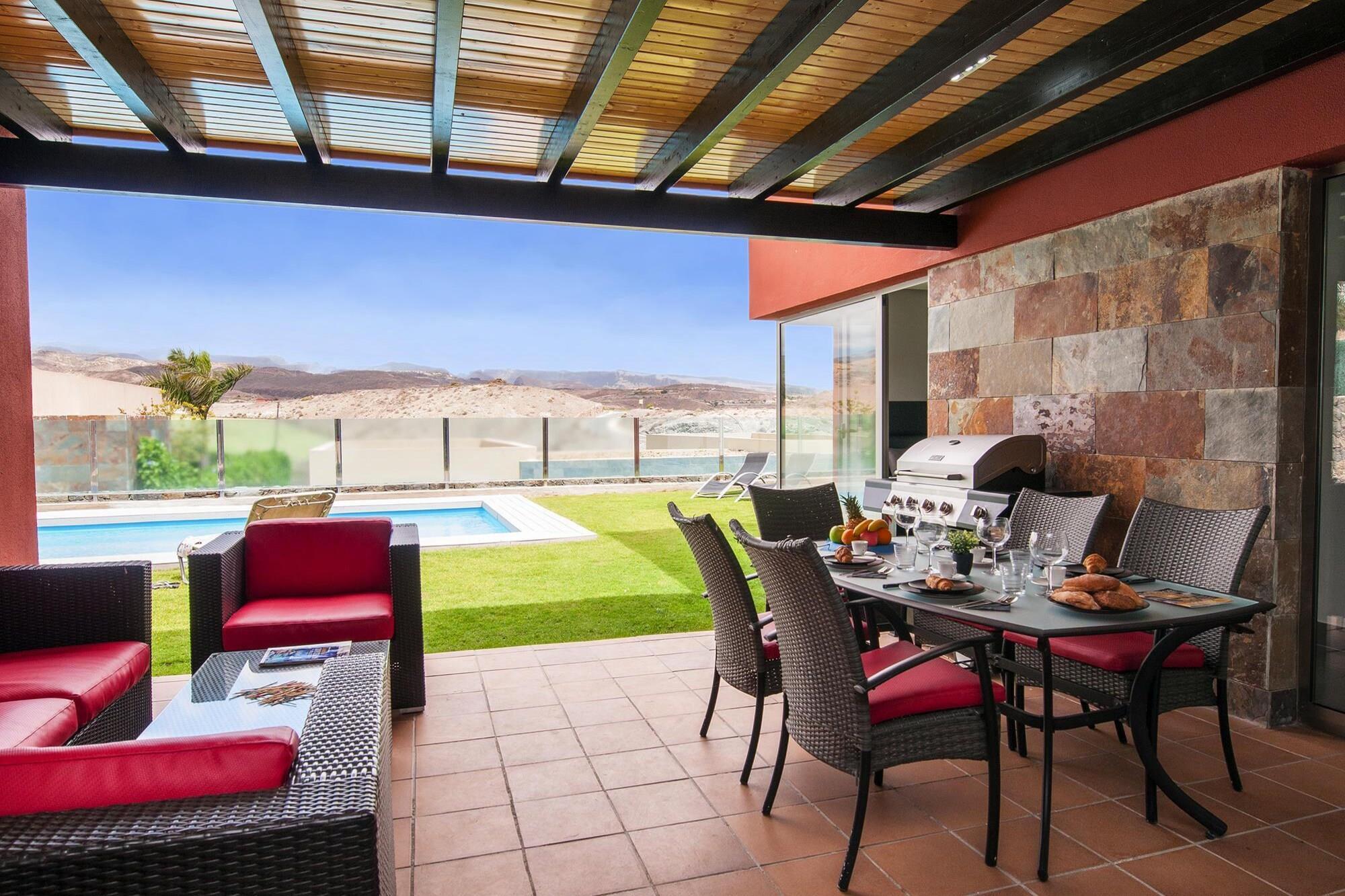 Die einstöckige Villa beeindruckt mit Ihrem modernen Sill und einem wunderschönen Garten mit weitem Ausblick. Sie garantiert zweifellos einen ganz besonderen Urlaub auf Gran Canaria. Genießen Sie die Sonne am Pool oder auf der Terrasse. Die Villa ist mit WLAN (gegen Gebühr), Klimaanlage und SAT-TV ausgestattet, sodass einem unbeschwerten Aufenthalt nichts im Wege steht. In den Bergen von Maspalomas ist in einer einzigartigen Landschaft dieser exklusive Wohnkomplex am Rande des Golf Resorts entstanden. In unmittelbarer Nähe können Sie sich im Supermarkt für den täglichen Bedarf versorgen, ein Restaurant verwöhnt Sie mit kulinarischen Köstlichkeiten. Die beliebten Touristenzentren Maspalomas und Playa del Ingles erreichen Sie mit dem Auto in knapp zehn Minuten. Gäste der Villen können den Golfplatz Nord und Süd nutzen. Der Golfplatz Süd (18-Loch) hat auf einer Lauflänge von 6.112 m ein Par von 71 Schlägen, der Golfplatz Nord (18-Loch) verfügt über eine Lauflänge von 5.524 m und hat ein Par von 72 Schlägen. Gäste der Villen erhalten eine Greenfee-Ermäßigung.