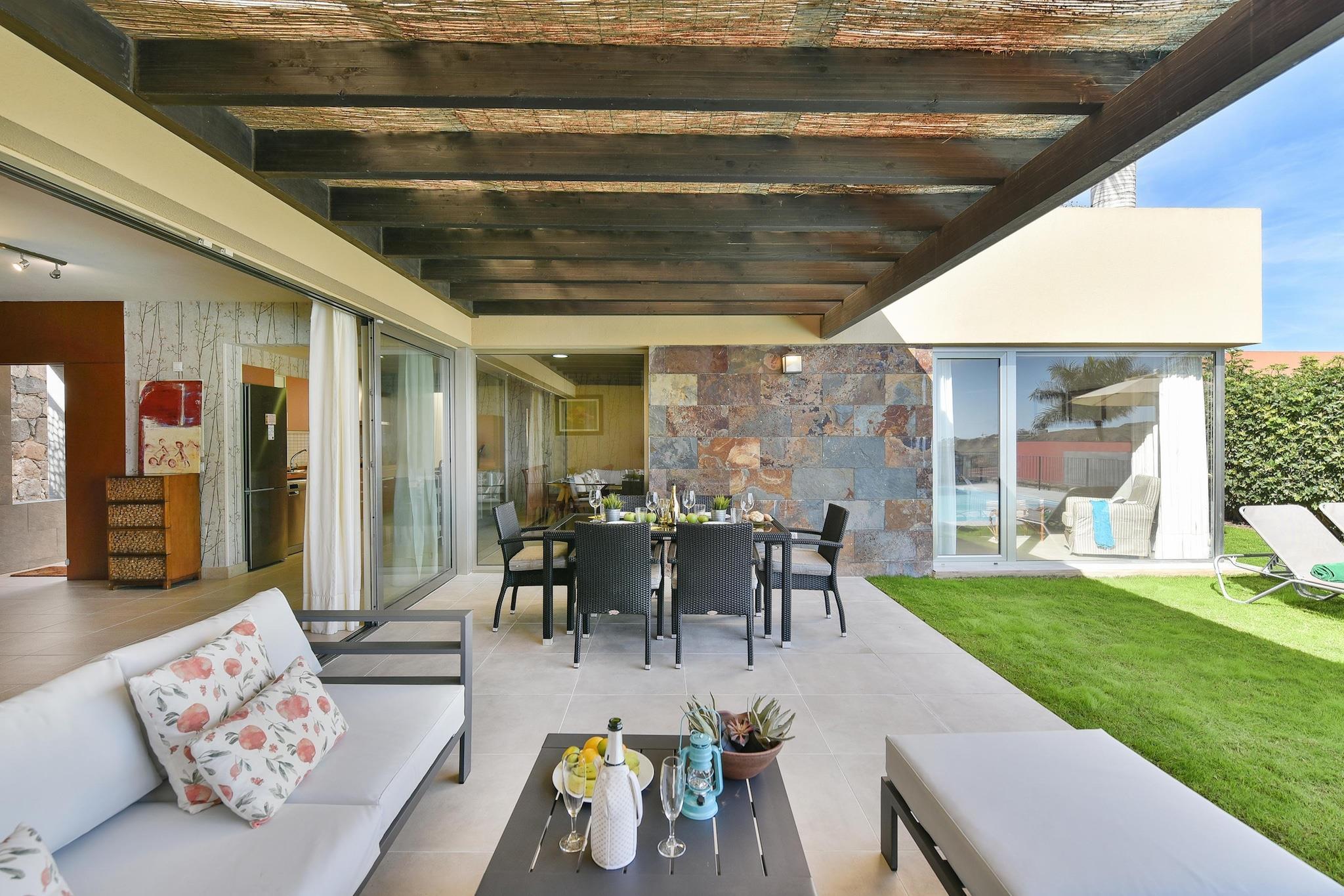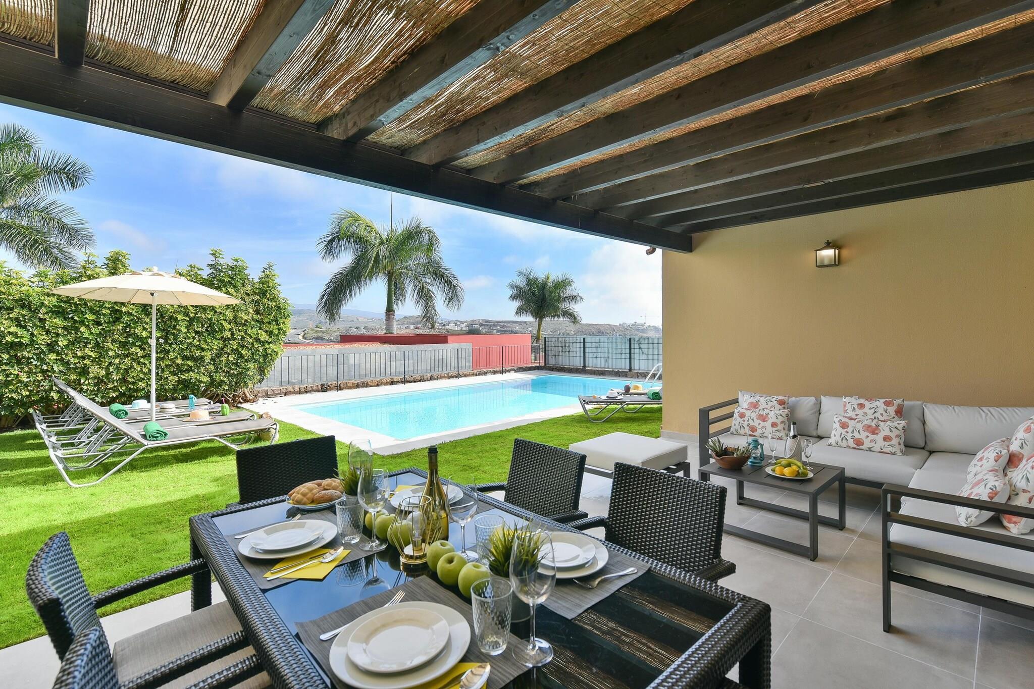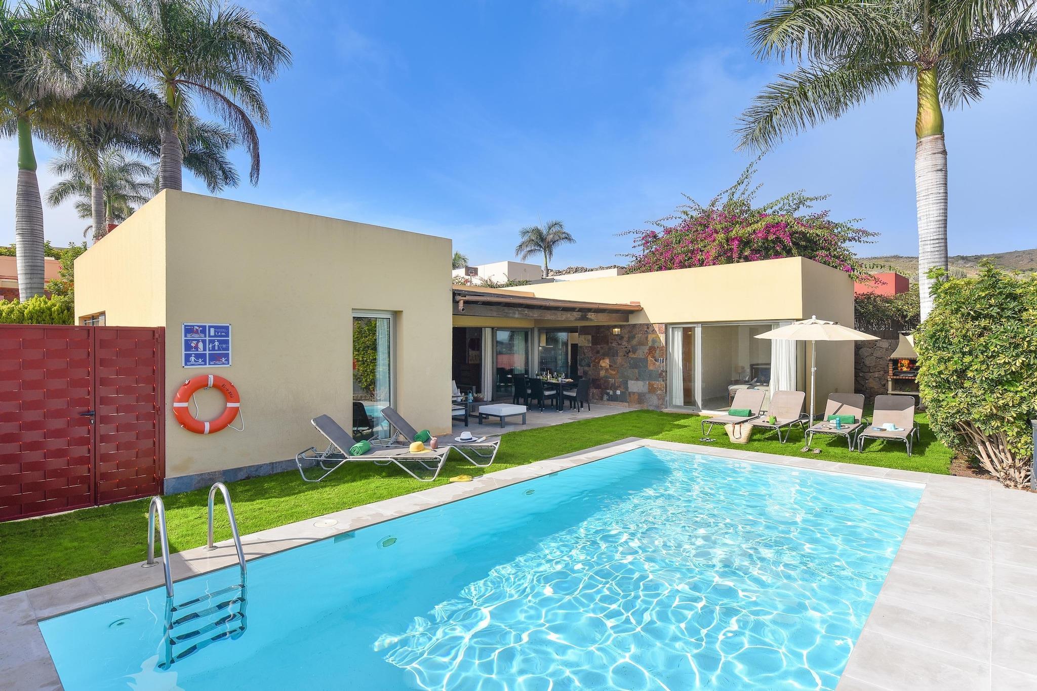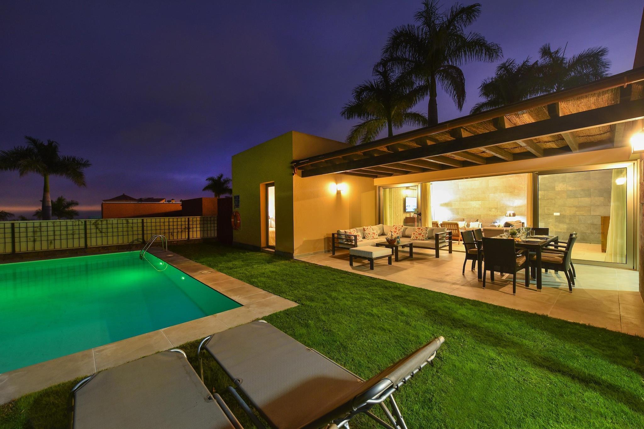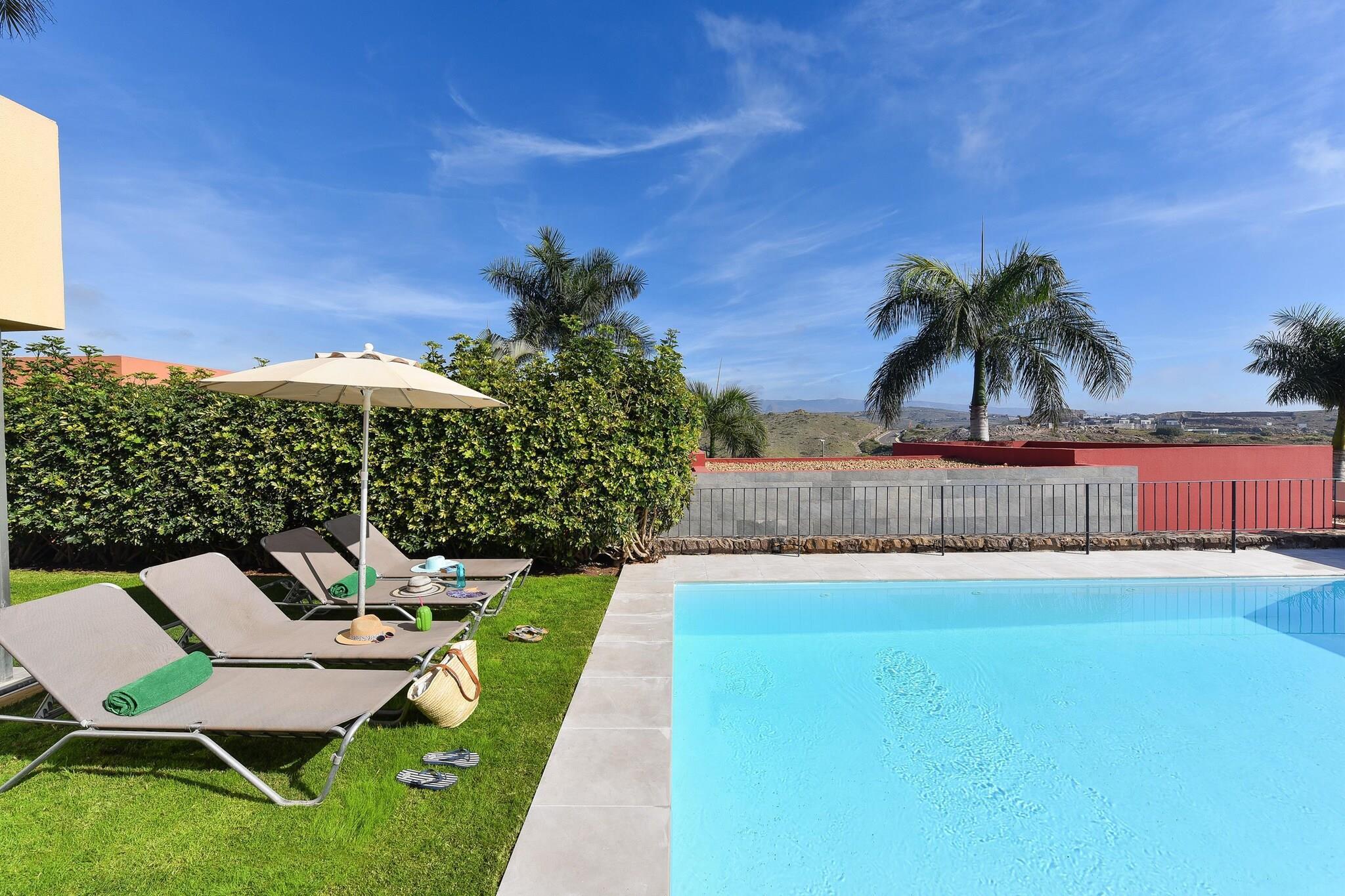 Die Villa mit ihrem modernen und doch gemütlichen Design sorgt dafür, dass Sie sich wie zu Hause fühlen. Entspannen Sie sich auf der großen Terrasse mit mehreren Sitzbereichen und Liegestühlen mit Blick auf den Garten und den privaten Pool von 8 x 4 m. Genießen Sie nachmittags einen Grillabend und beobachten Sie den Sonnenuntergang über den Bergen! Lassen Sie sich außerdem vom täglichen Brötchenservice verwöhnen. In den Bergen von Maspalomas ist in einer einzigartigen Landschaft dieser exklusive Wohnkomplex am Rande des Golf Resorts entstanden. In unmittelbarer Nähe können Sie sich im Supermarkt für den täglichen Bedarf versorgen, ein Restaurant verwöhnt Sie mit kulinarischen Köstlichkeiten. Die beliebten Touristenzentren Maspalomas und Playa del Ingles erreichen Sie mit dem Auto in knapp zehn Minuten. Gäste der Villen können den Golfplatz Nord und Süd nutzen. Der Golfplatz Süd (18-Loch) hat auf einer Lauflänge von 6.112 m ein Par von 71 Schlägen, der Golfplatz Nord (18-Loch) verfügt über eine Lauflänge von 5.524 m und hat ein Par von 72 Schlägen. Gäste der Villen erhalten eine Greenfee-Ermäßigung.