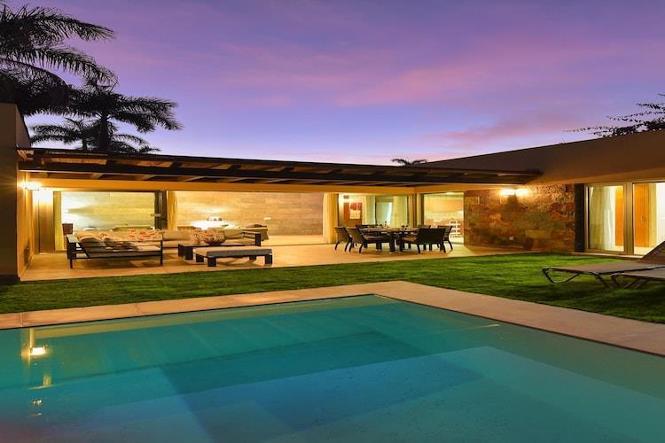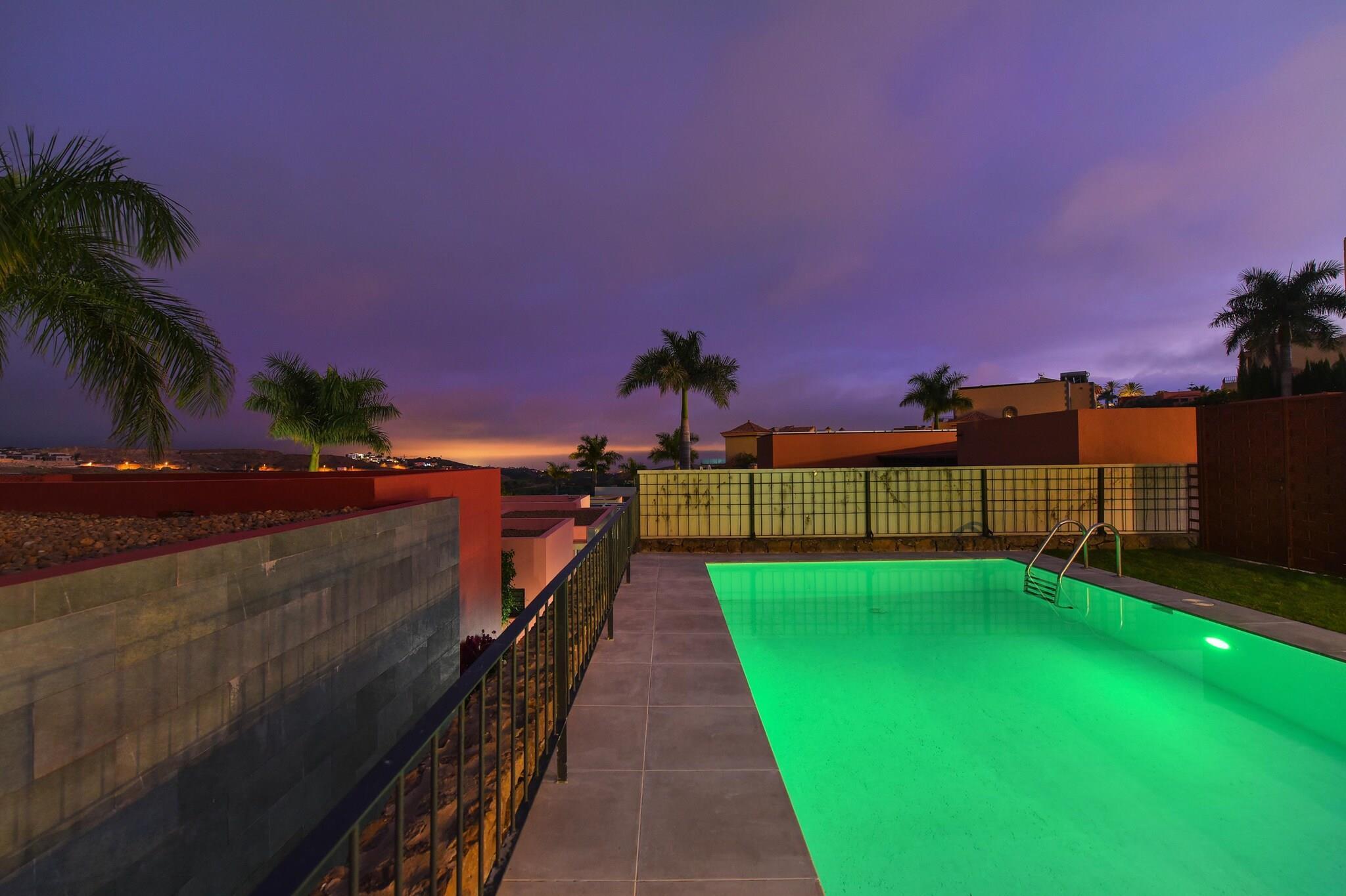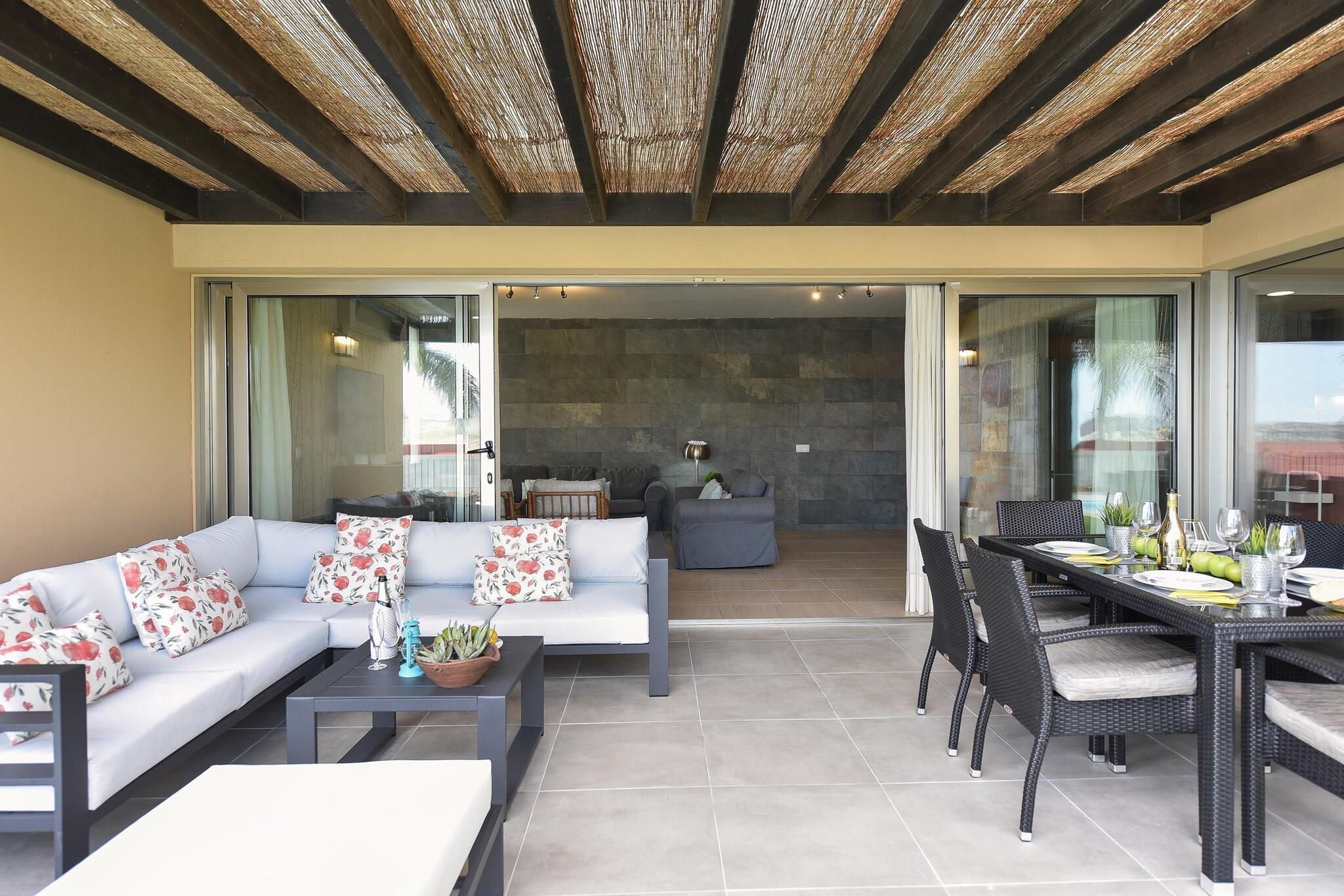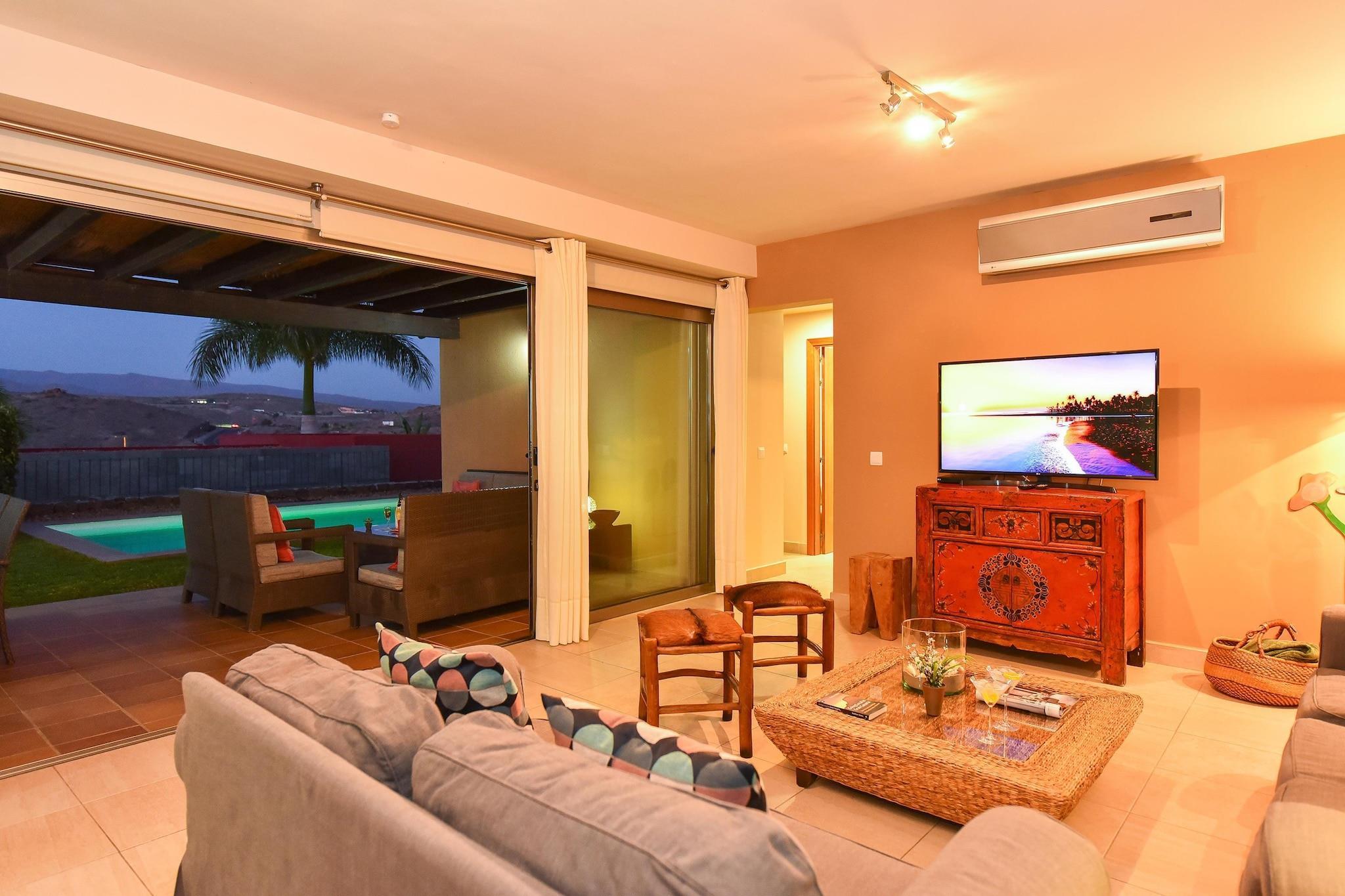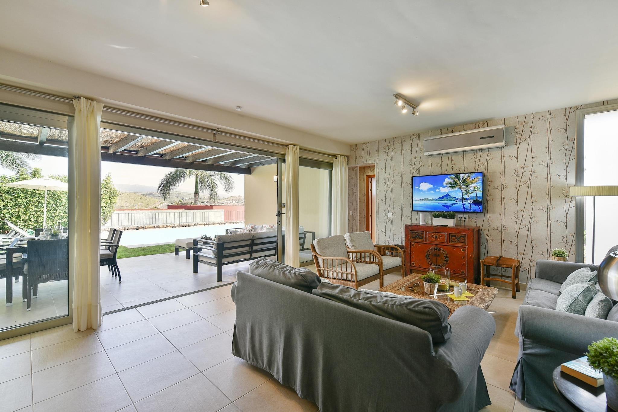 Die Villa mit ihrem modernen und doch gemütlichen Design sorgt dafür, dass Sie sich wie zu Hause fühlen. Entspannen Sie sich auf der großen Terrasse mit mehreren Sitzbereichen und Liegestühlen mit Blick auf den Garten und den privaten Pool von 8 x 4 m. Genießen Sie nachmittags einen Grillabend und beobachten Sie den Sonnenuntergang über den Bergen! Lassen Sie sich außerdem vom täglichen Brötchenservice verwöhnen. In den Bergen von Maspalomas ist in einer einzigartigen Landschaft dieser exklusive Wohnkomplex am Rande des Golf Resorts entstanden. In unmittelbarer Nähe können Sie sich im Supermarkt für den täglichen Bedarf versorgen, ein Restaurant verwöhnt Sie mit kulinarischen Köstlichkeiten. Die beliebten Touristenzentren Maspalomas und Playa del Ingles erreichen Sie mit dem Auto in knapp zehn Minuten. Gäste der Villen können den Golfplatz Nord und Süd nutzen. Der Golfplatz Süd (18-Loch) hat auf einer Lauflänge von 6.112 m ein Par von 71 Schlägen, der Golfplatz Nord (18-Loch) verfügt über eine Lauflänge von 5.524 m und hat ein Par von 72 Schlägen. Gäste der Villen erhalten eine Greenfee-Ermäßigung.