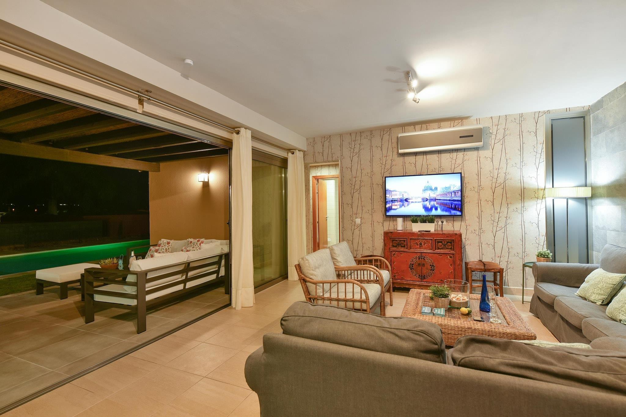 Wohnzimmer(TV(Satellit), DVD-Spieler), offene Küche(Esstisch, Wasserkocher, Toaster, Kochherd, Kaffeemaschine, Backofen, Mikrowelle, Spülmaschine, Kühl-/Gefrierkombination), Schlafzimmer(Doppelbett), Schlafzimmer(Einzelbett, Einzelbett), Schlafzimmer(Einzelbett, Einzelbett), Badezimmer(Dusche, Toilette, Föhn), Badezimmer(Dusche, Toilette, Föhn), Trockner, Waschmaschine, Klimaanlage, Terrasse(überdacht), Gartenmöbel, Liegen, Grill, Parkplatz, Sonnenschirm, Pool(alleinige Nutzung, im Garten, beheizbar), Hochstuhl, Babybett (kostenlos)