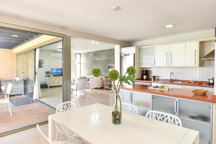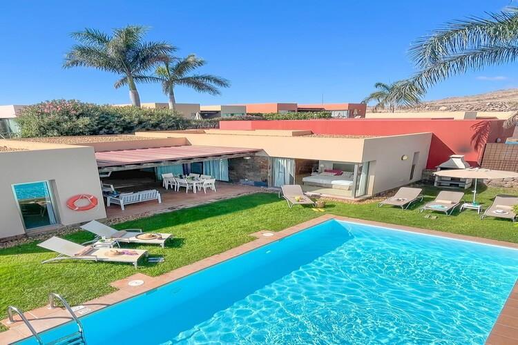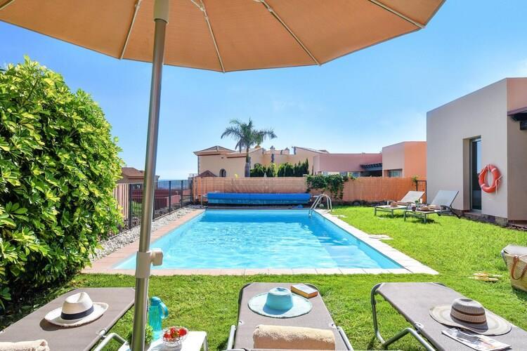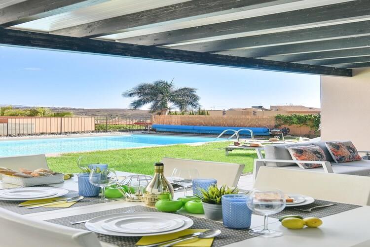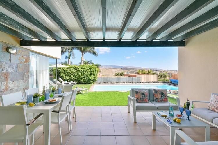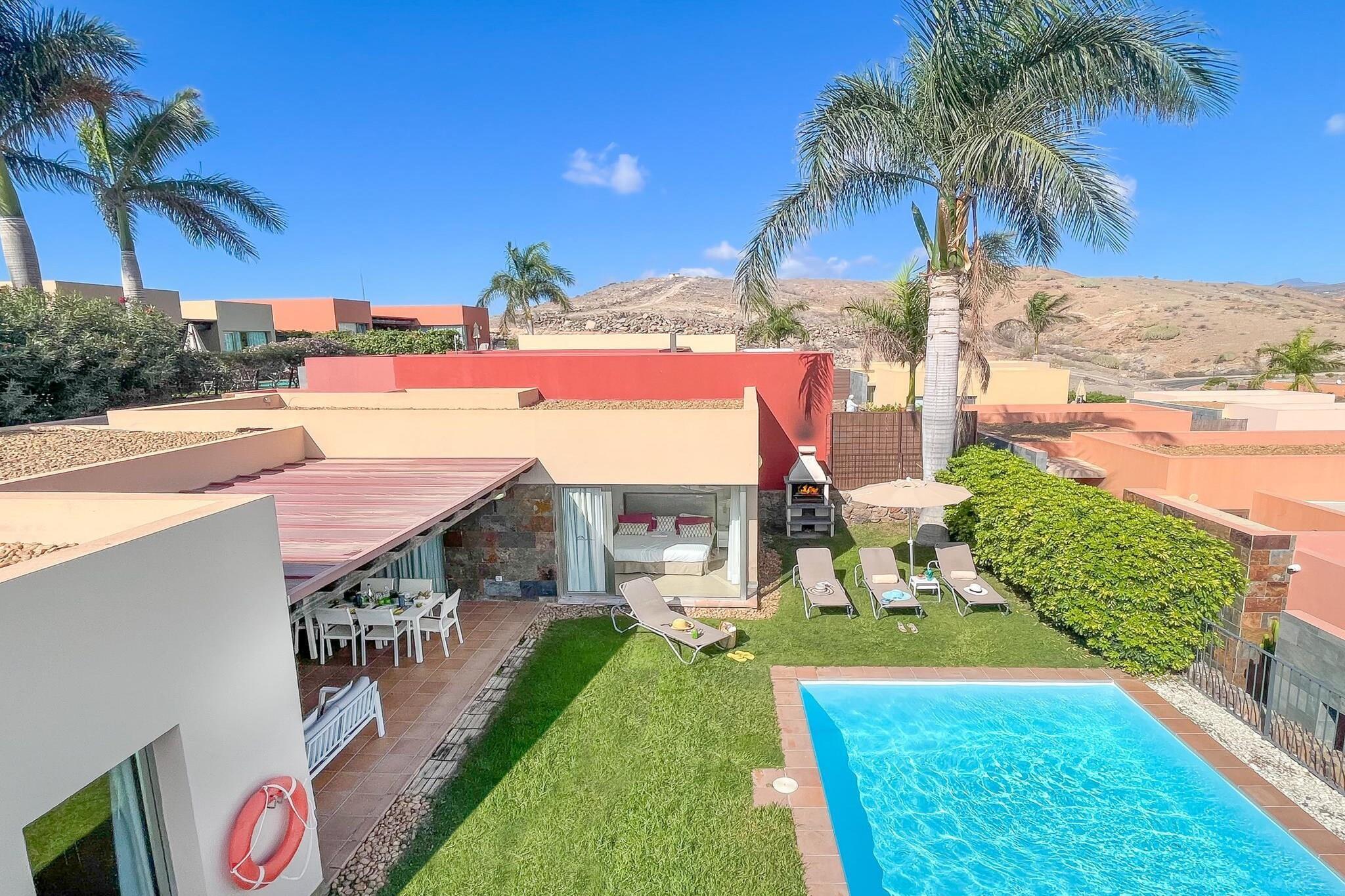 Die Villa mit privatem Außenpool beeindruckt mit Ihrer modernen Bauweise und einem weiten und offenen Wohnbereich. Genießen Sie die exklusive Lage der ebenerdigen Villa. Entspannen Sie außerdem am beheizbaren Pool oder auf der überdachten Terrasse mit Blick auf die Berge und den Golfplatz. Vom Hauptschlafzimmer mit direktem Zugang zum Garten und einem außergewöhnlichen Panoramablick können Sie den Sonnenaufgang direkt von Ihrem Bett aus sehen. In den Bergen von Maspalomas ist in einer einzigartigen Landschaft dieser exklusive Wohnkomplex am Rande des Golf Resorts entstanden. In unmittelbarer Nähe können Sie sich im Supermarkt für den täglichen Bedarf versorgen, ein Restaurant verwöhnt Sie mit kulinarischen Köstlichkeiten. Die beliebten Touristenzentren Maspalomas und Playa del Ingles erreichen Sie mit dem Auto in knapp zehn Minuten. Gäste der Villen können den Golfplatz Nord und Süd nutzen. Der Golfplatz Süd (18-Loch) hat auf einer Lauflänge von 6.112 m ein Par von 71 Schlägen, der Golfplatz Nord (18-Loch) verfügt über eine Lauflänge von 5.524 m und hat ein Par von 72 Schlägen. Gäste der Villen erhalten eine Greenfee-Ermäßigung.