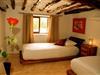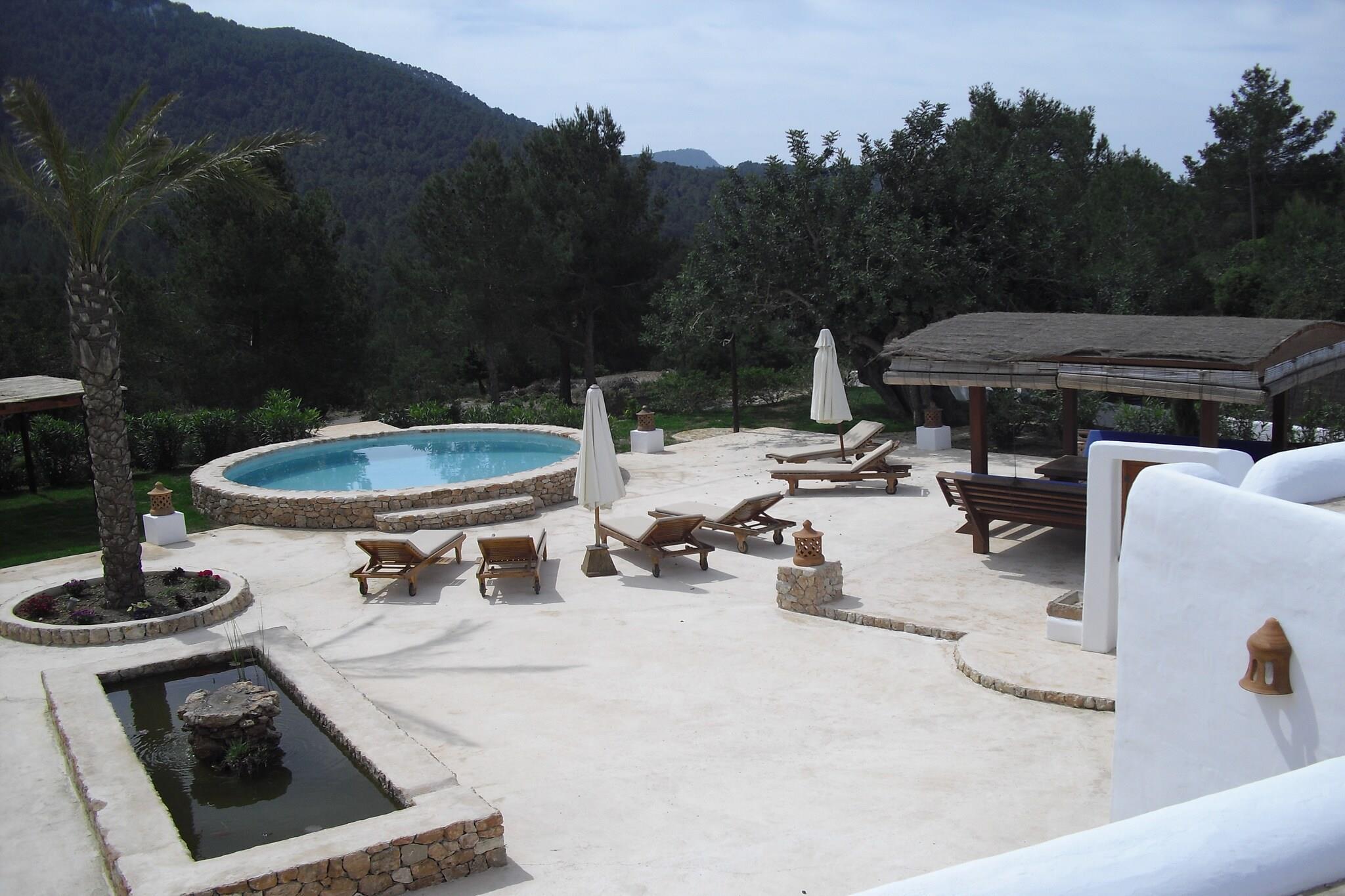 Can Vadella ist eine einzigartige Finca (ein Grundstück von ca. 40.000 M²) mit wunderschönem Blick auf die Berggipfel der Ses Roques Altes und dem Tal von Es Canal de Sa Torre; hier haben Sie volle Privatsphäre und Ruhe und können Sie genießen von der Natur. Die Finca ist 300 Jahre alt und mit den traditionellen Materialien und Techniken, mit viel Holz und Naturstein renoviert. Vor dem Haus liegt eine sehr großzügige Terrasse mit Chillout Pergola, überdachter Außenküche mit Grill, Teich und Schwimmbad (ungefähr 7 Durchmesser und ungefähr 1,60 M. tief) mit Liegestühlen. Die Finca liegt in einem wunderschönen Naturgebiet in Cala Vadella, 4 km vom pittoresken Dorf San Jose entfernt, 2 km vom Strand von Cala Vadella und in unmittelbarer Nähe der Strände Cala d'Hort, Cala Tarida und Cala Conta. Innen finden Sie ein lauschiges Wohnzimmer mit rustikalem Mobiliar, Holzofen, Sitzecke, ausgerüstet mit Satellitenfernsehen, Dvd-Player, Wifi und I-pod-Anschluss. Dahinter befinden sich die Küche (komplett ausgerüstet mit Herd, Mikrowelle, Spülmaschine, Kühl-Gefrierkombination, und das stimmungsvoll eingerichtete Esszimmer mit wunderschönem Holztisch. Die Schlafzimmer sind feervol en ook hier zijn de houten accenten ruim aanwezig. In het hoofdhuis is een grote slaapkamer met een tweepersoonsbed en badkamer en suite. Via aparte ingang komt u in de tweede slaapkamer met twee eenpersoonsbedden, ook deze heeft een eigen badkamer. In het gastenhuisje, een paar meter verwijderd van het hoofdhuis zijn nog twee slaapkamers elk met een tweepersoonsbed en een badkamer en suite. Al deze slaapkamers hebben airco. De vier bijbehorende badkamers hebben douche wastafel en toilet. Via een grappig trapje achter het huis komt u in een vijfde slaapkamer, ook met aparte ingang, deze kleine extra slaapkamer met 2 eenpersoonsbedden, heeft een erg laag plafond, geen airco en deelt de badkamer uit het hoofdhuis.