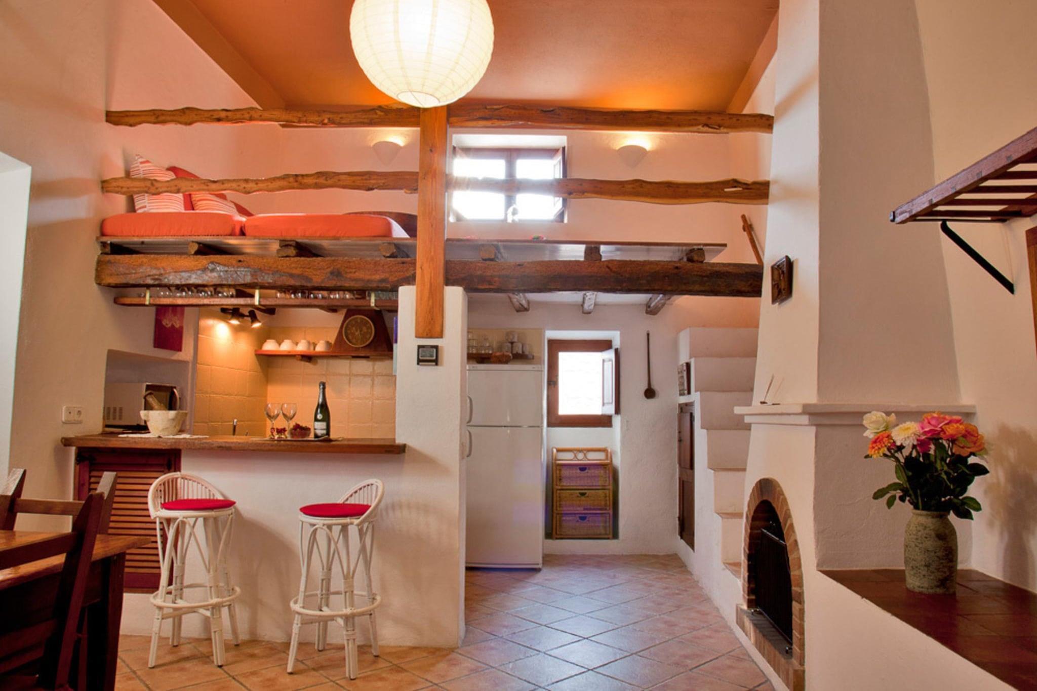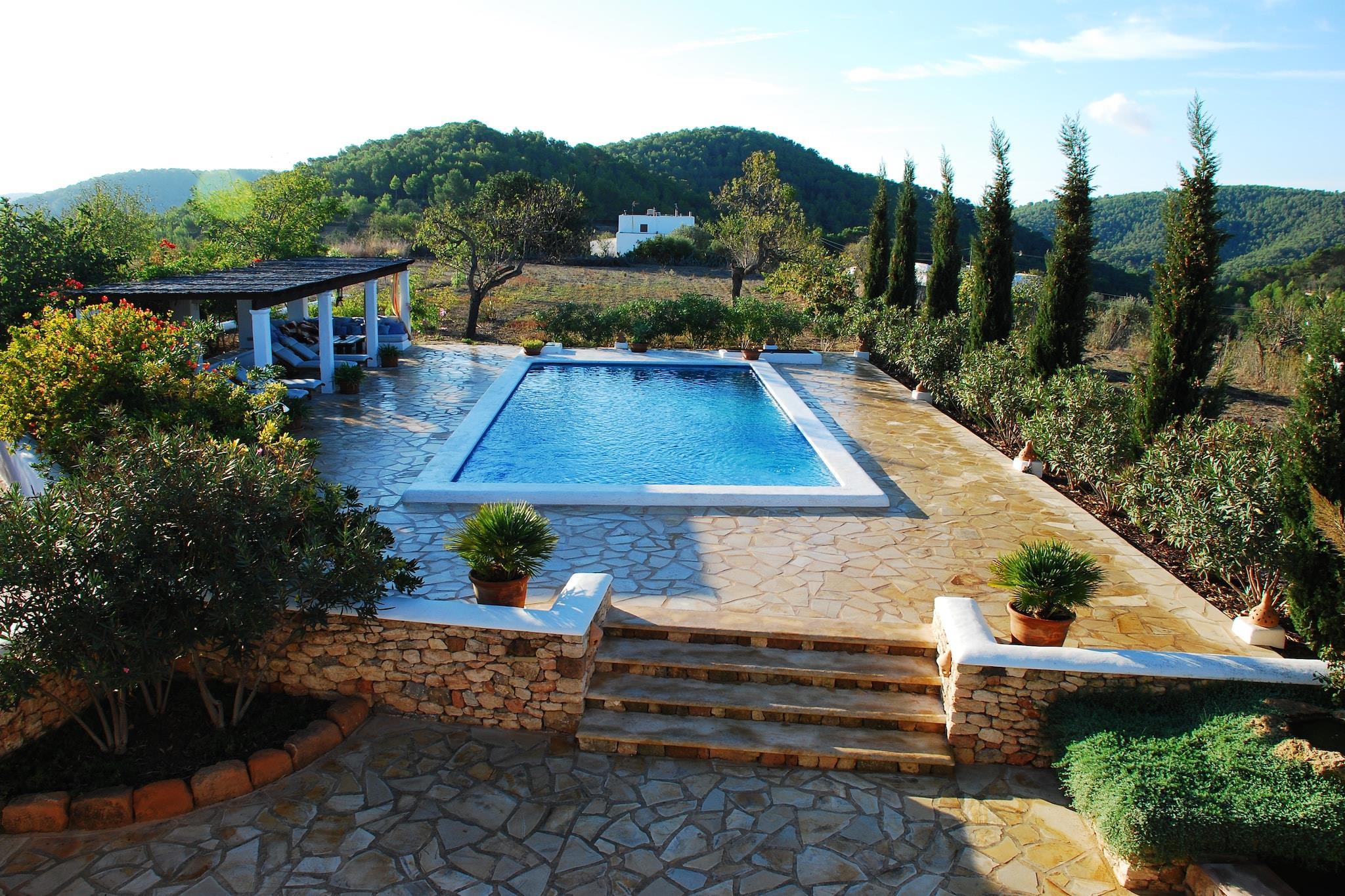 Can Palau ist eine einmalige Finca ganz in der Nähe des Dorfes San José mit seinen gemütlichen Terrassen, Restaurants und Geschäften. In der Umgebung befinden sich die schönen Strände Cala Jondal, La Cala Virgen und Es Torrent. Die Finca hat eine enorm große Natursteinterrasse mit Pool (10 x 4 m), einem überdachten chillout mit Liegestühlen und einem Sitzbereich mit Außenküche und Grill. Auch ein Teich ist vorhanden. Über Flügeltüren gelangt man in den rustikal eingerichteten Salon mit L-förmigem Sofa, Holzofen, Satellitenfernsehen und WLAN-Internetanschluss. Die offene Küche hat eine Bar und einen offenen Kamin und ist ausgestattet mit Gasherd, Mikrowelle, Spülmaschine und Kühl-/Gefrierkombination. Im Essbereich befindet sich eine Stereoanlage. Über der Küche befindet sich noch ein kleiner Chillout-Raum. Eine Treppe führt hinauf in das Hauptschlafzimmer mit Doppelbett, Antikmöbeln, Zugang zur Dachterrasse und eigenem Badezimmer mit Dusche. Unten befinden sich zwei Schlafzimmer mit je zwei Einzelbetten und ein Schlafzimmer mit einem Doppelbett und eingebauter antiker Weinpresse.