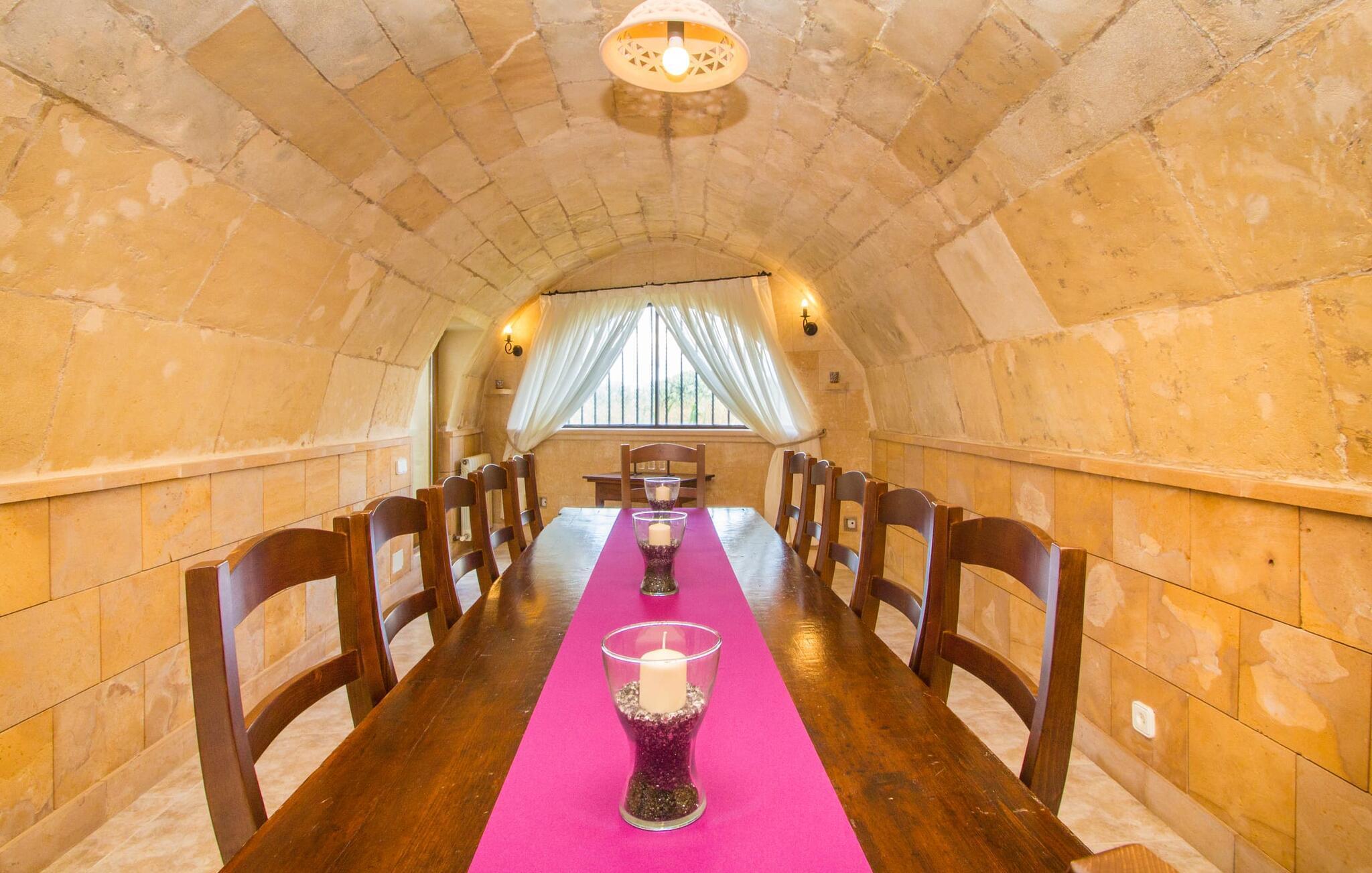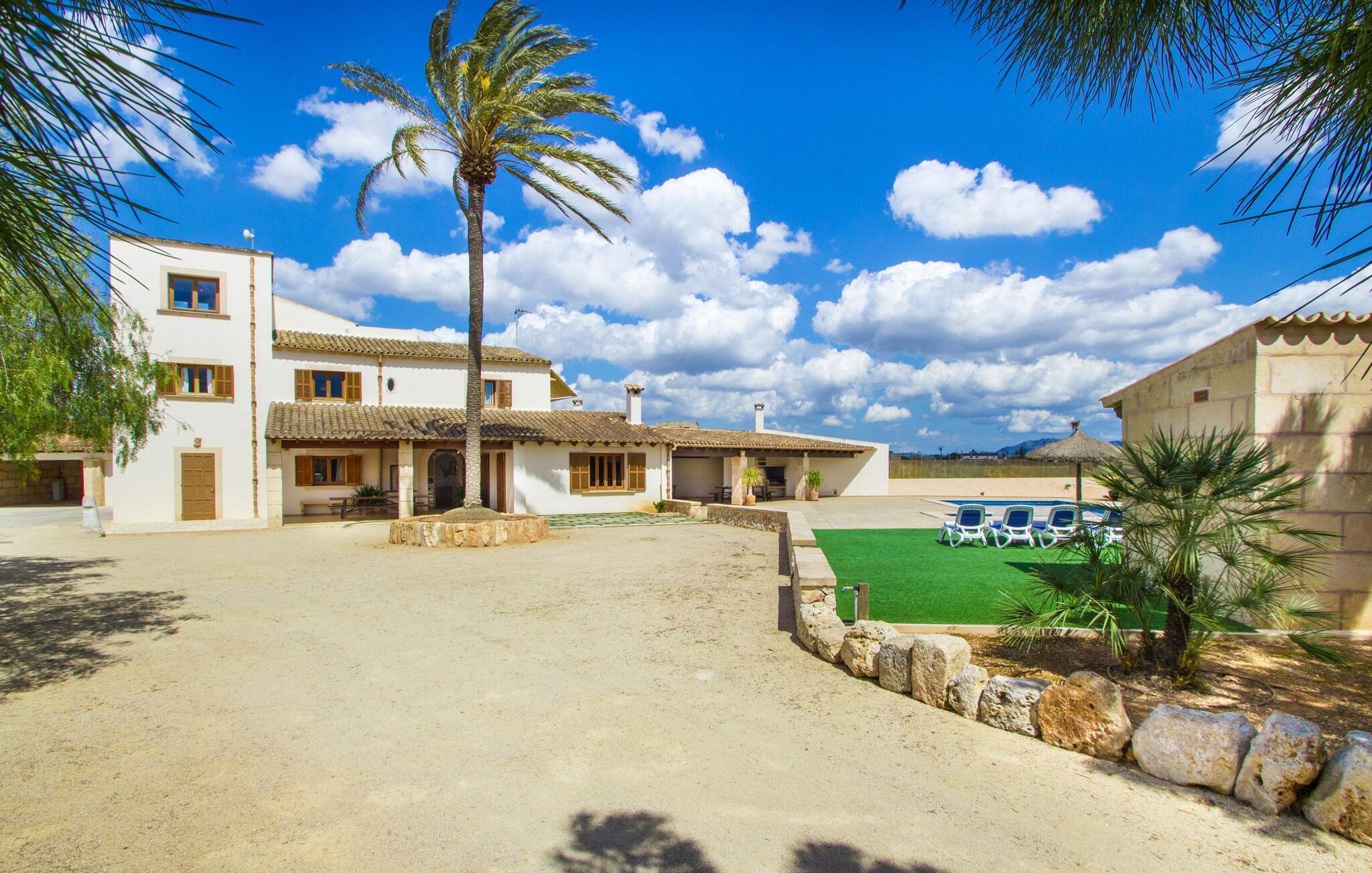 Sobald Sie Ihre Villa „Sant Blai Nou“ nach einer 40-minütigen Fahrt von Palma aus erreicht haben, werden Sie von der Größe des Anwesens staunen: Mit einer unglaublichen Fläche von 12.474 m² kommen Sie mit Sicherheit nicht in jedes hinein Andersherum, auch wenn Sie zu neunt im Haus wohnen. Beeindruckend sind auch die Abmessungen des 12 x 6 m großen Pools, sodass Sie bei Sonnenaufgang mit ein paar Bahnen schwimmend in den Tag starten können. Ein Teil der den Pool umgebenden Terrasse ist mit Kunstrasen bedeckt – hier können Sie es sich auf bequemen Liegen gemütlich machen und die reichliche Sonne der Insel genießen. Dank der guten Infrastruktur des Außenbereichs – neben einem Außenbad finden Sie auch eine überdachte Außenküche – können Sie problemlos die meiste Zeit an der frischen Luft verbringen. Und genießen Sie unvergessliche Grillabende bis spät in die Nacht. Die Alleinlage gewährleistet ein hohes Maß an Privatsphäre. Eine hohe Palme dominiert den Vorplatz der Villa – hier finden Sie auch ein Relikt aus einer Zeit, als Pferde für die Landwirtschaft auf der Insel noch unverzichtbar waren.