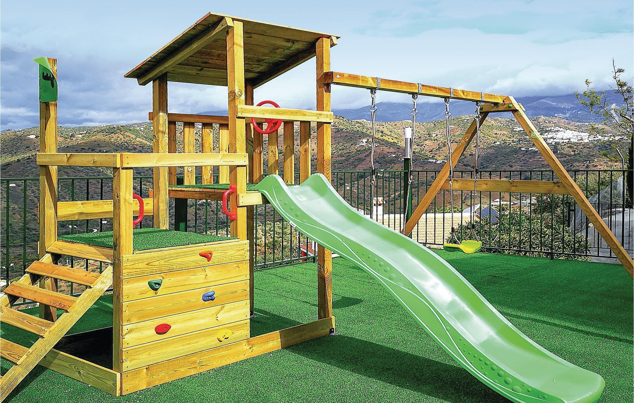 Diese Traumvilla bietet 6 Schlafzimmer mit jeweils eigenem Bad, einen geräumigen Wohn-/Essbereich und eine gut ausgestattete, moderne Küche. Der große Pool verspricht Erfrischung an heißen Tagen und ist zur Sicherheit der kleinen Gäste eingezäunt. Genießen Sie im überdachten Bereich mit Bar, Tischen und Stühlen auf dem Steingrill zubereitete Köstlichkeiten oder verbringen Sie im Schatten auf den Sofas der Veranda eine entspannte Auszeit mit Ihren Liebsten. Die Ausstattung mit einem Babybett, Hochstuhl und Buggy (für Kinder von ca. 3 Jahren) macht das Haus ideal für Familien mit Kleinkindern. Auf der obersten Etage erwartet Sie ein toller Ausblick auf die Sierra. Von Sayalonga 800 m entfernt, davon sind knapp 200 m unbefestigte Strecke, die aber problemlos befahren werden kann.