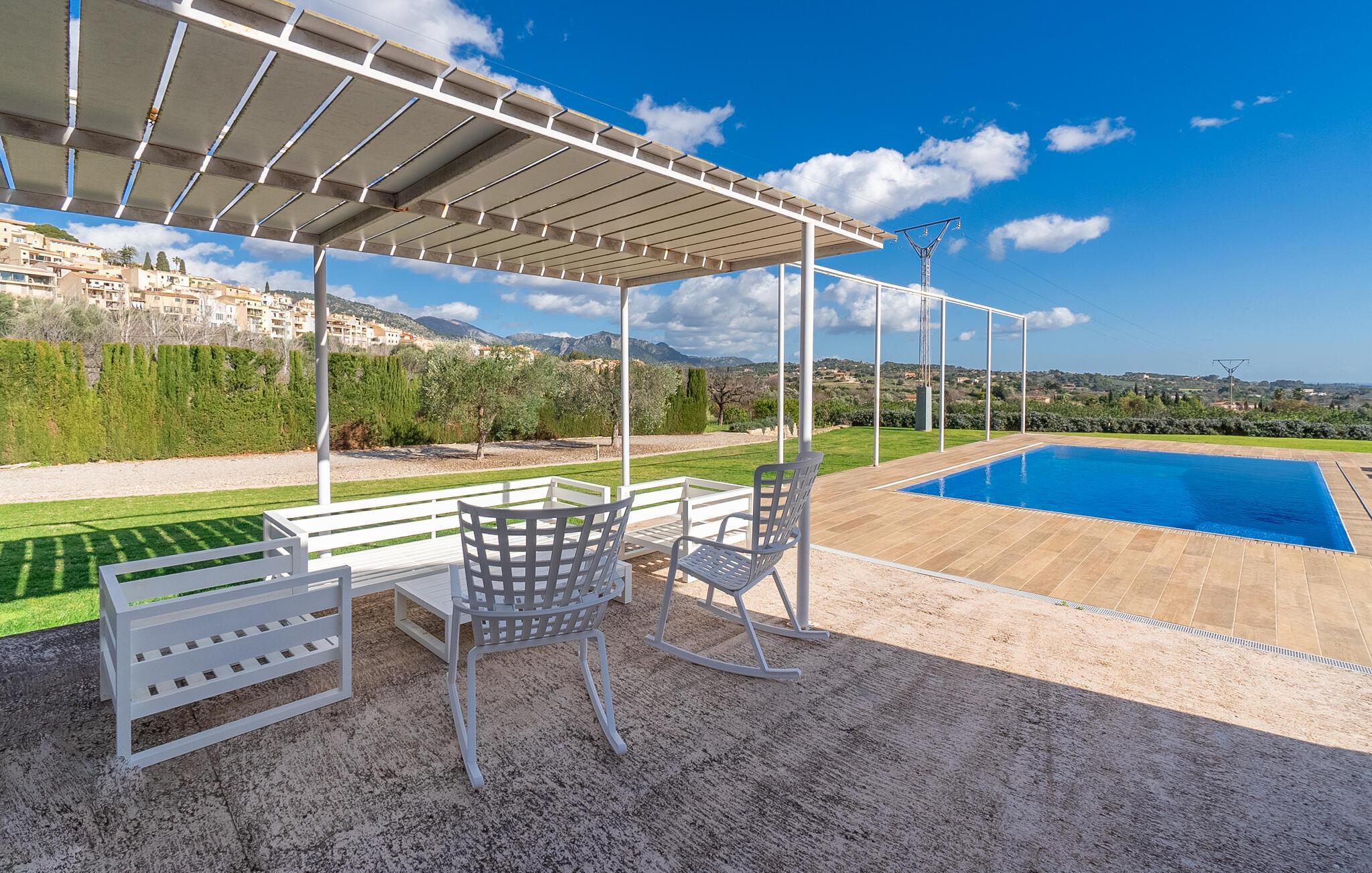 Genießen Sie die große überdachte Terrasse mit Blick in den weitläufigen Garten oder erfrischen Sie sich im einladenden Swimmingpool. Hier erleben Sie mediterrane Gelassenheit in einem außergewöhnlichen Ambiente.