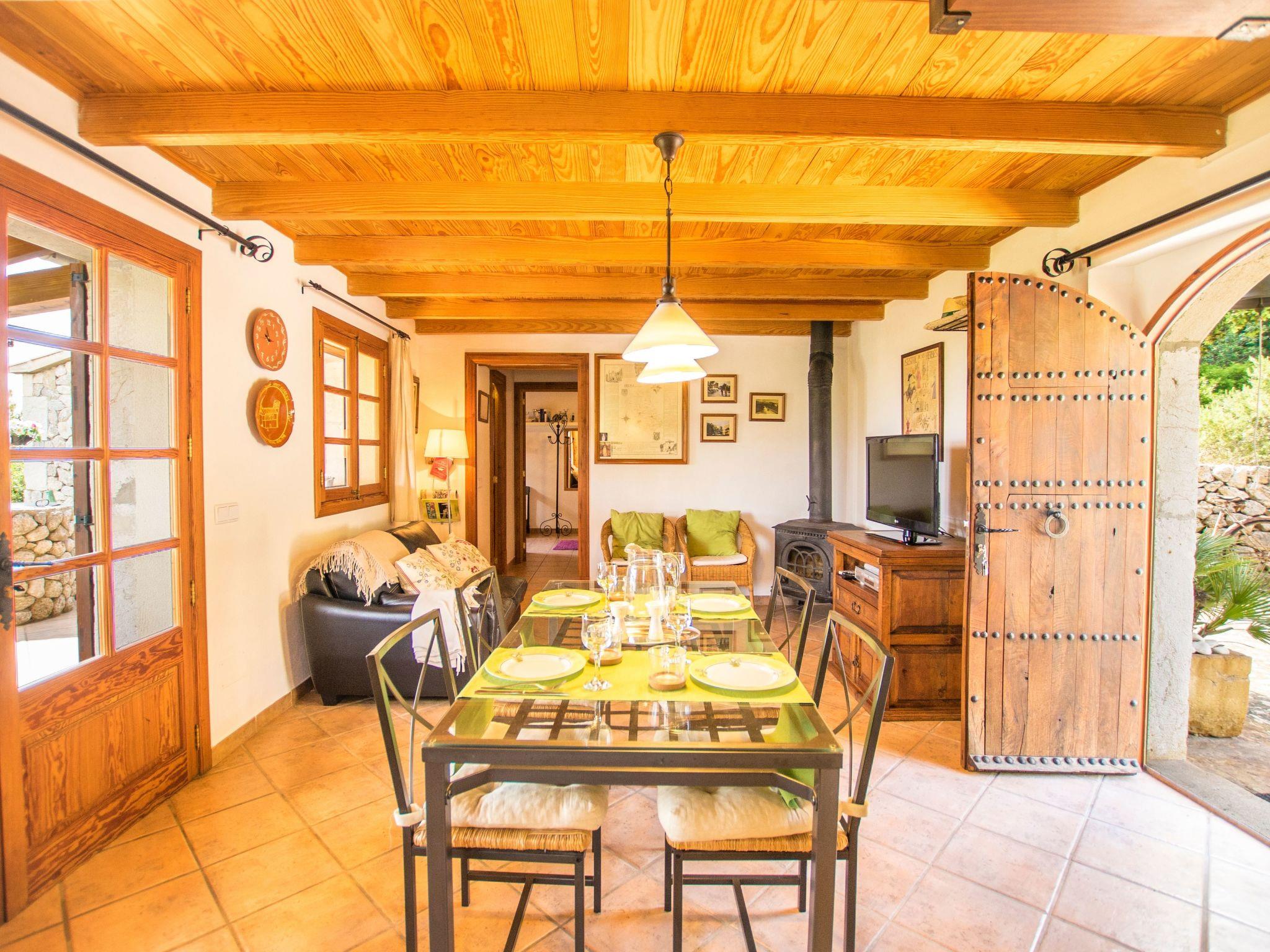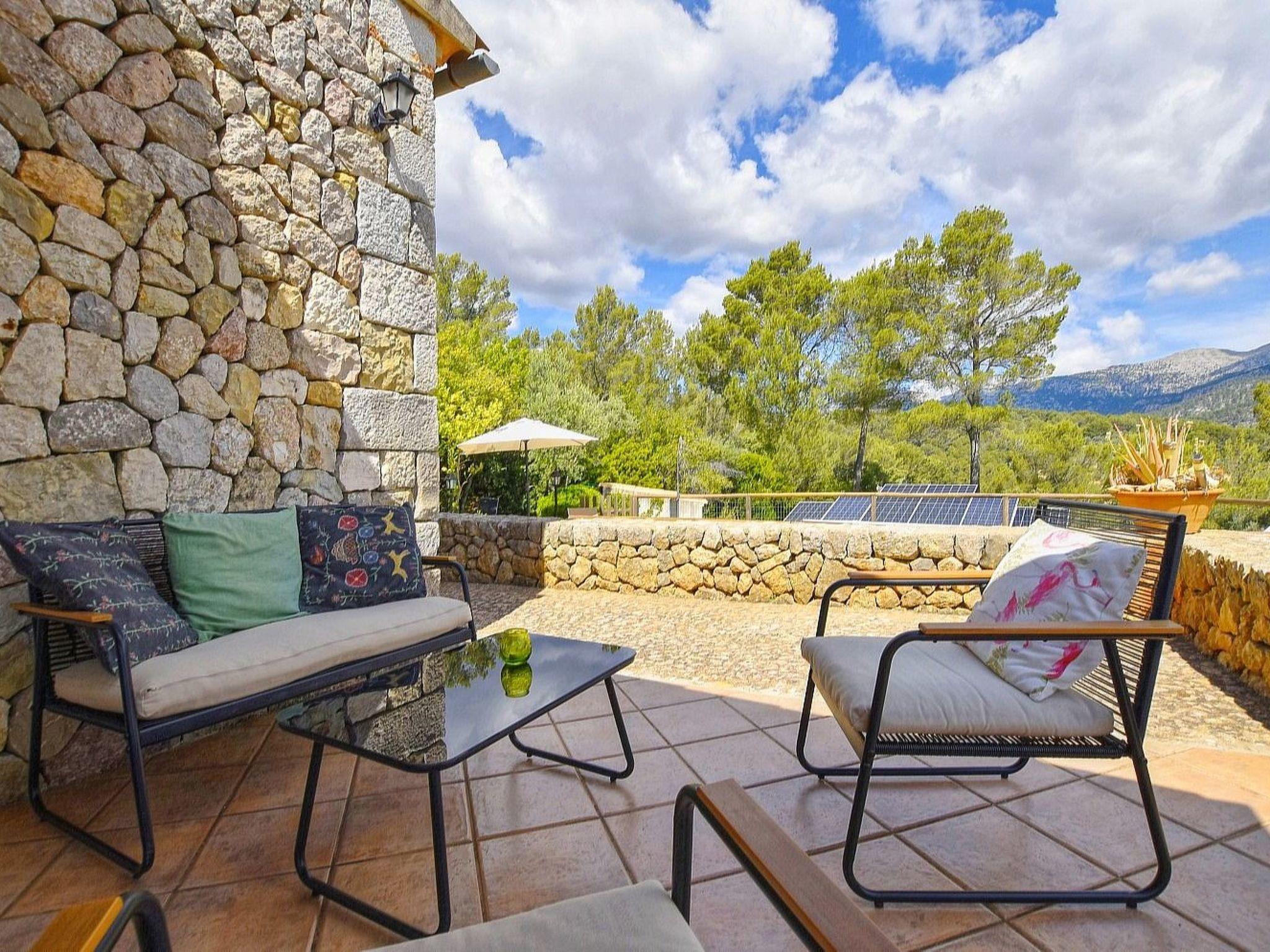 Mit etwa 75 m² Wohnfläche bietet das Haus einem Wohn- Esszimmer mit Wifi-Internet und SAT-TV und eine niedliche offene Küche. Die Küche verfügt über eine Spülmaschine. Insgesamt gibt es im Haus zwei Doppelschlafzimmer und ein Badezimmer. Eines der Schlafzimmer erreicht man über eine Wendeltreppe. Eines der Schlafzimmer hat jeweils zwei Einzelbetten das zweite hat ein Doppelbett. Zwei Badezimmer mit Dusche vervollständigen die Ausstattung. Für die sehr warmen Tage stellen wir Ventilatoren zur Verfügung, eines der Schlafzimmer verfügt über einen Deckenventilator. Vom Wohnzimmer aus gelangt man zur anliegenden teilweise überdachten Terrasse die einen unglaublichen Ausblick über die Berge Mallorcas bietet.