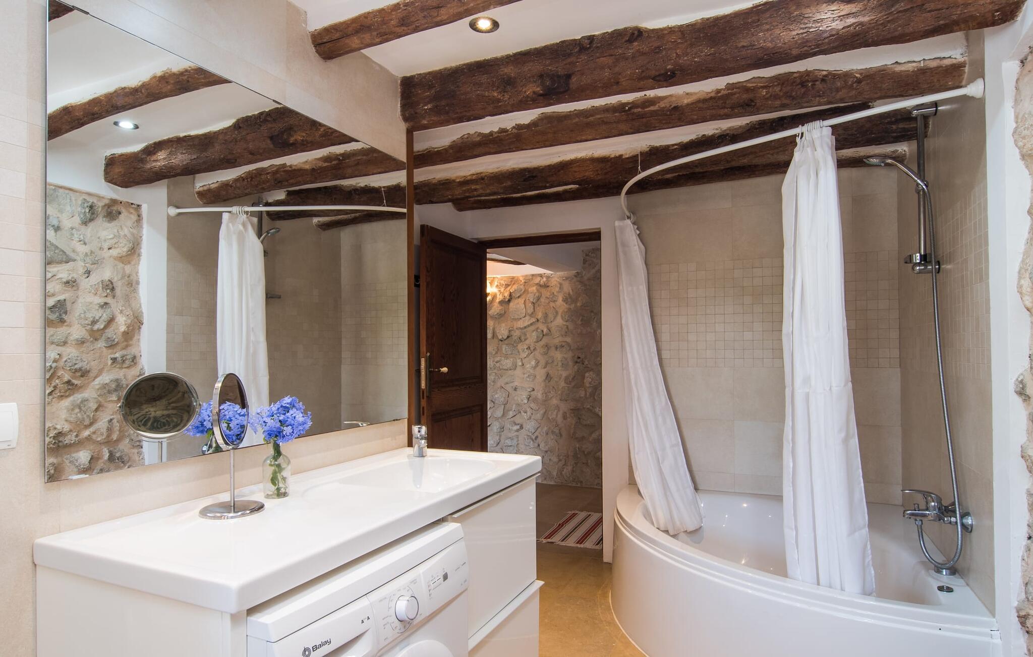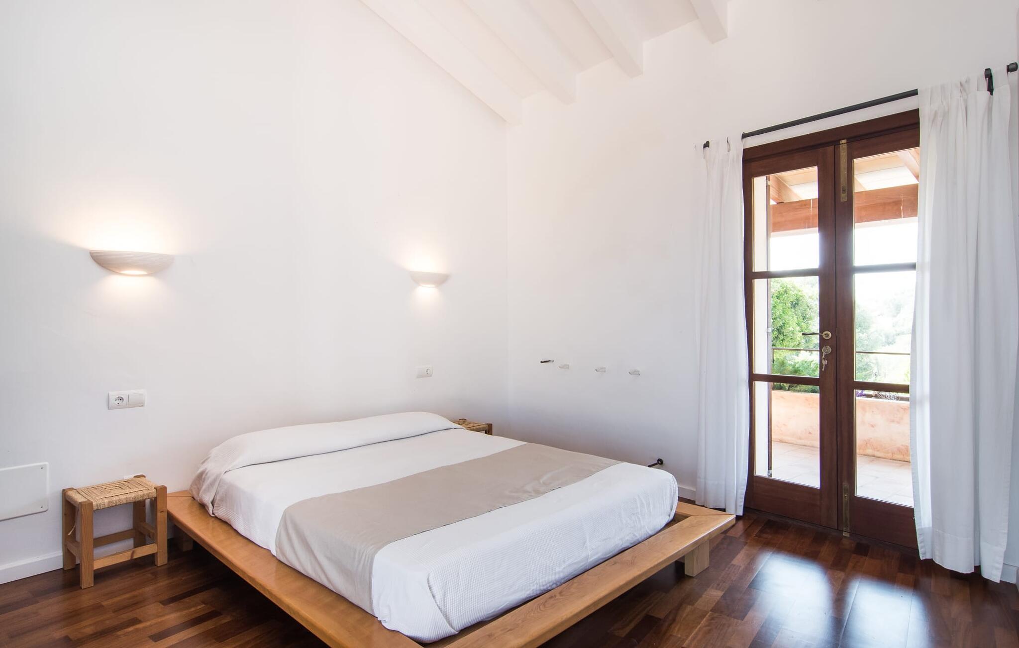 Im Inneren verbindet die Finca rustikalen Charme mit modernem Minimalismus. Es gibt zwei komfortable Wohn- und Esszimmer, während die Küche mit Panoramafenster und modernen Annehmlichkeiten aufwartet. Das Anwesen verfügt über sieben Doppelzimmer, drei davon mit eigenem Bad, die viel Platz und Komfort bieten.