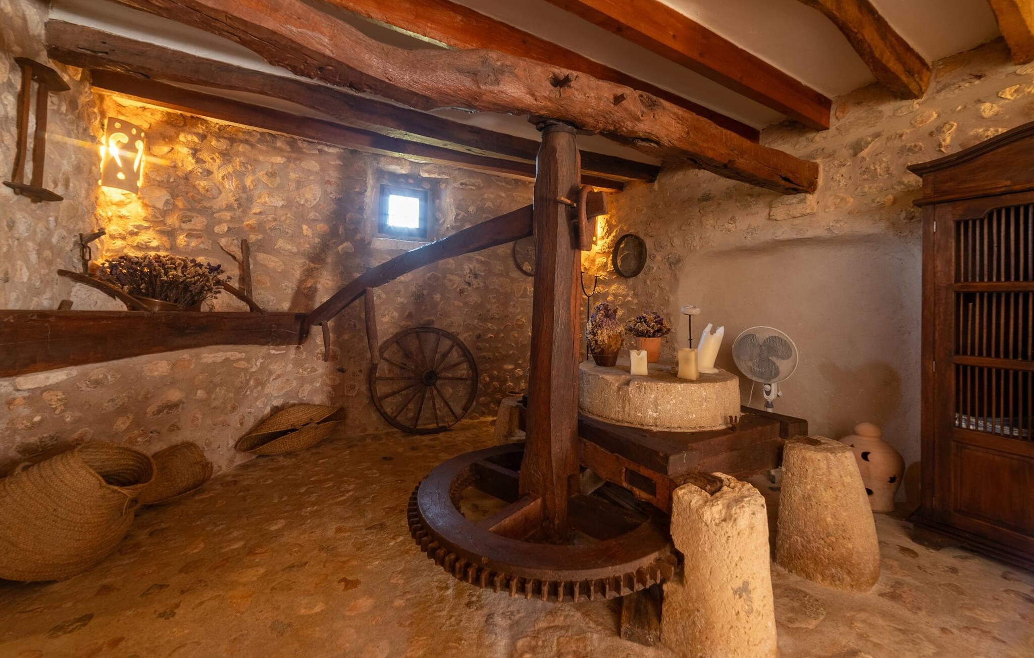 Schon beim Betreten des mallorquinischen Hauses herrscht eine sehr behagliche Atmosphäre und wer Authentizität und traditionellen Charme liebt, wird sofort begeistert sein. Viel Naturstein, dicke Wände, klassische Sichtbalkendecken und spanische Dekorationen tragen zu diesem individuellen Flair bei, in dem Sie sich schnell wie zu Hause fühlen werden. Sie können noch immer die jahrhundertealte Mühle und den ehemaligen Futtertrog sehen! Im Erdgeschoss befinden sich ein Schlafzimmer und zwei Badezimmer (eines davon en-suite) sowie ein elegantes Esszimmer, in dem Sie drinnen umgeben von Natursteinmauern speisen können. In der originalen, alten Küche finden Sie einen angenehmen Platz am Kamin – hier können Sie einen romantischen Abend zusammensitzen und in die knisternden Flammen blicken. In der anderen Küche können Sie Ihre Mahlzeiten zubereiten und verfügen über eine komplette Ausstattung, sodass Sie sich problemlos weiter selbst versorgen können. Das Steinwaschbecken ist ein echter Hingucker! Direkt neben der beeindruckenden Getreidemühle befindet sich ein weiterer großer Esstisch, an dem jeder bequem Platz findet. In der obersten Etage befindet sich ein Wohnzimmer mit einem weiteren Kamin. Hier können Sie fernsehen, ein gutes Buch lesen oder sich gut unterhalten. Darüber hinaus befinden sich auf dieser Etage drei Schlafzimmer und ein drittes Badezimmer. Das Schlafzimmer bietet tolle Entspannungszonen im klassischen Design für die Nacht oder für eine Siesta; Insgesamt stehen Ihnen ein 1,50 x 1,90-Bett und vier 0,90 x 1,90-m-Betten zur Auswahl.