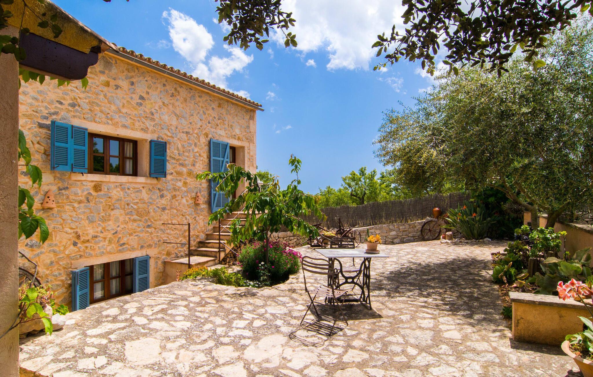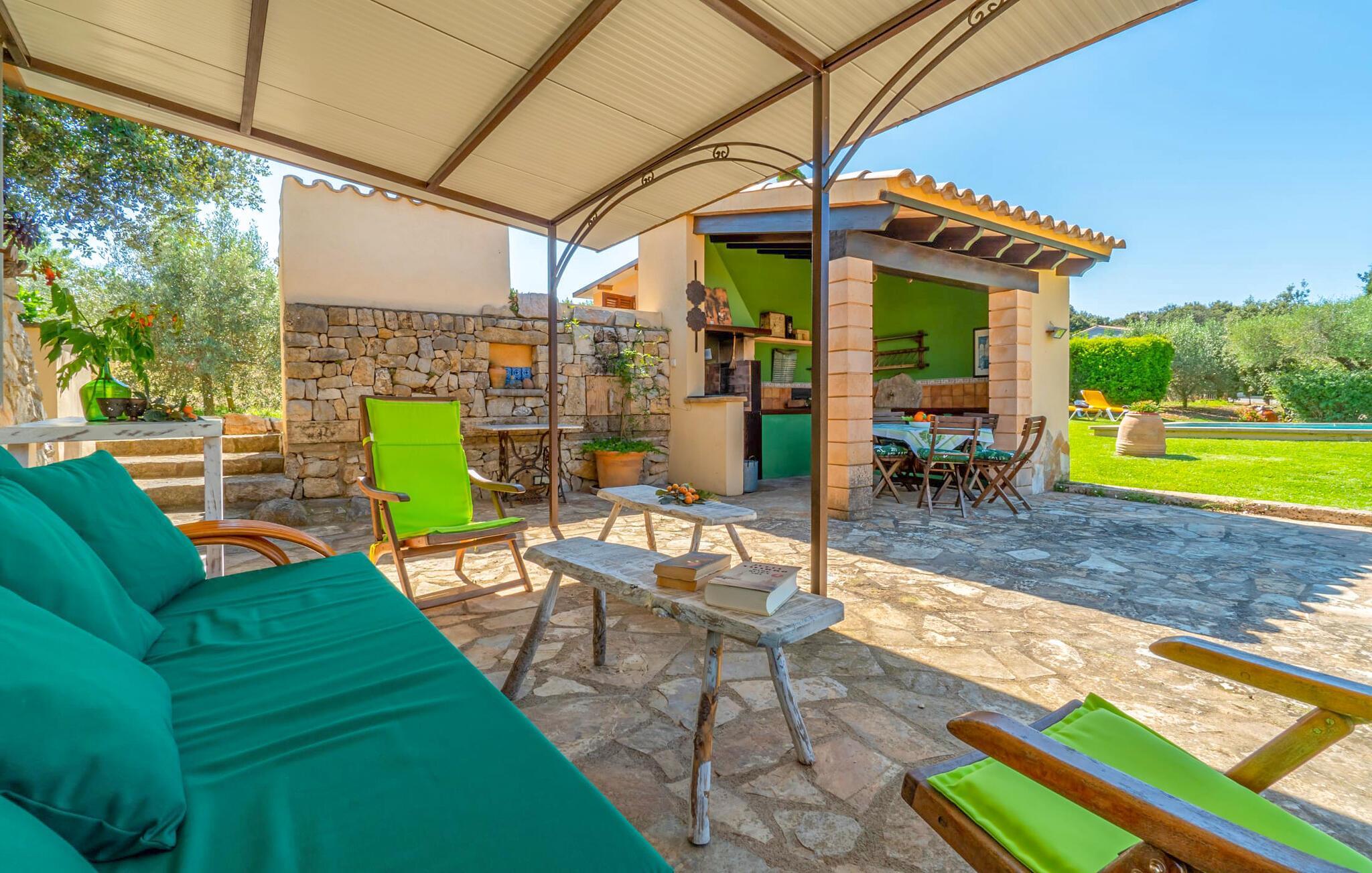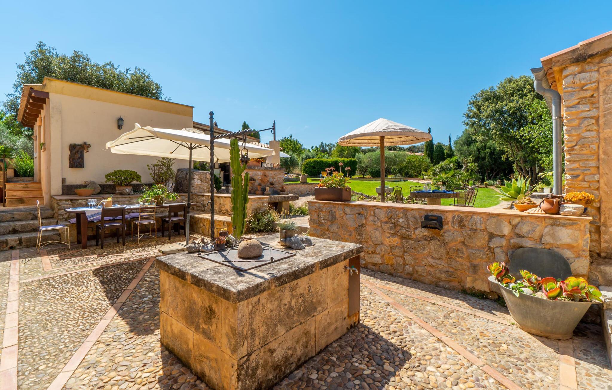 Ein absolut bezauberndes Ambiente empfängt die Gäste in der Villa „Ses Velletes“. Das Anwesen liegt herrlich idyllisch und ruhig, ist komplett umzäunt und durch ein Tor zur Einfahrt hin abgeschlossen. Auf dem weitläufigen Grundstück, geprägt von Rasenflächen und vielen mediterranen Pflanzen, finden Sie hübsche, offene und überdachte Terrassen mit vielfältigen Blumen und Gestaltungsdetails, die zum Entdecken und Entdecken einladen. Liebevoll arrangierte Sitzmöglichkeiten laden zum genussvollen Entspannen und Verweilen im Freien ein, während Sie immer wieder auf der Suche nach neuen Lieblingsplätzen sind. Der rustikale Esstisch mit gemauerten Bänken eignet sich zu jeder Tageszeit für gesellige Mahlzeiten, die man gemütlich und mit herrlichem Blick in den Garten genießen kann. Wenn Sie möchten, können Sie das Essen auch einfach in der Außenküche zubereiten und direkt hier genießen. Auf dem Grill können Sie allerlei frische regionale Köstlichkeiten zubereiten und vielleicht alle gemeinsam einen kulinarischen Grillabend feiern. Kleine Nischen, Treppen und Mauern verleihen dem Außenbereich ein besonders malerisches und heimeliges Flair. Der niedliche Teich beherbergt sogar Schildkröten. Herzstück des Gartens ist der 7 x 4 m große Pool, geschmückt mit dekorativen hellblauen Fliesen und ausgestattet mit einem bequemen Treppeneinstieg. Hier finden Groß und Klein eine angenehme Erfrischung nach Herzenslust. Für ausgiebiges Sonnenbaden stehen bequeme Liegen zur Verfügung, sowie mehrere Sonnenschirme, falls die UV-Strahlen zu stark werden. Einfach nichts tun und die Sorgen hinter sich lassen – das können Sie hier auf außergewöhnliche Weise genießen.
