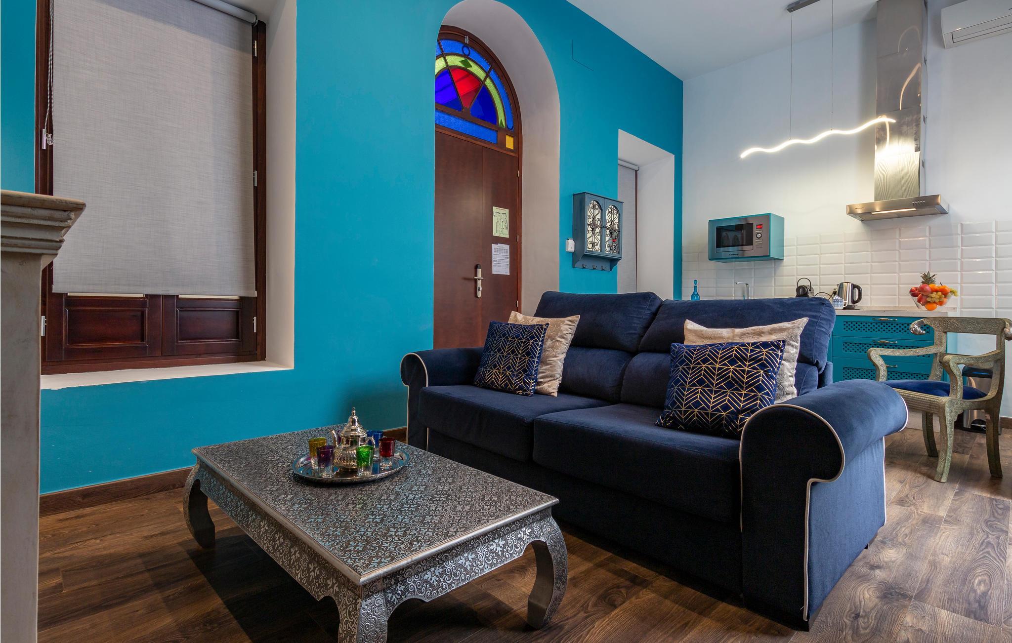Treten Sie in ein in meeresblau getunktes Apartment im historischen Zentrum von Sevilla.