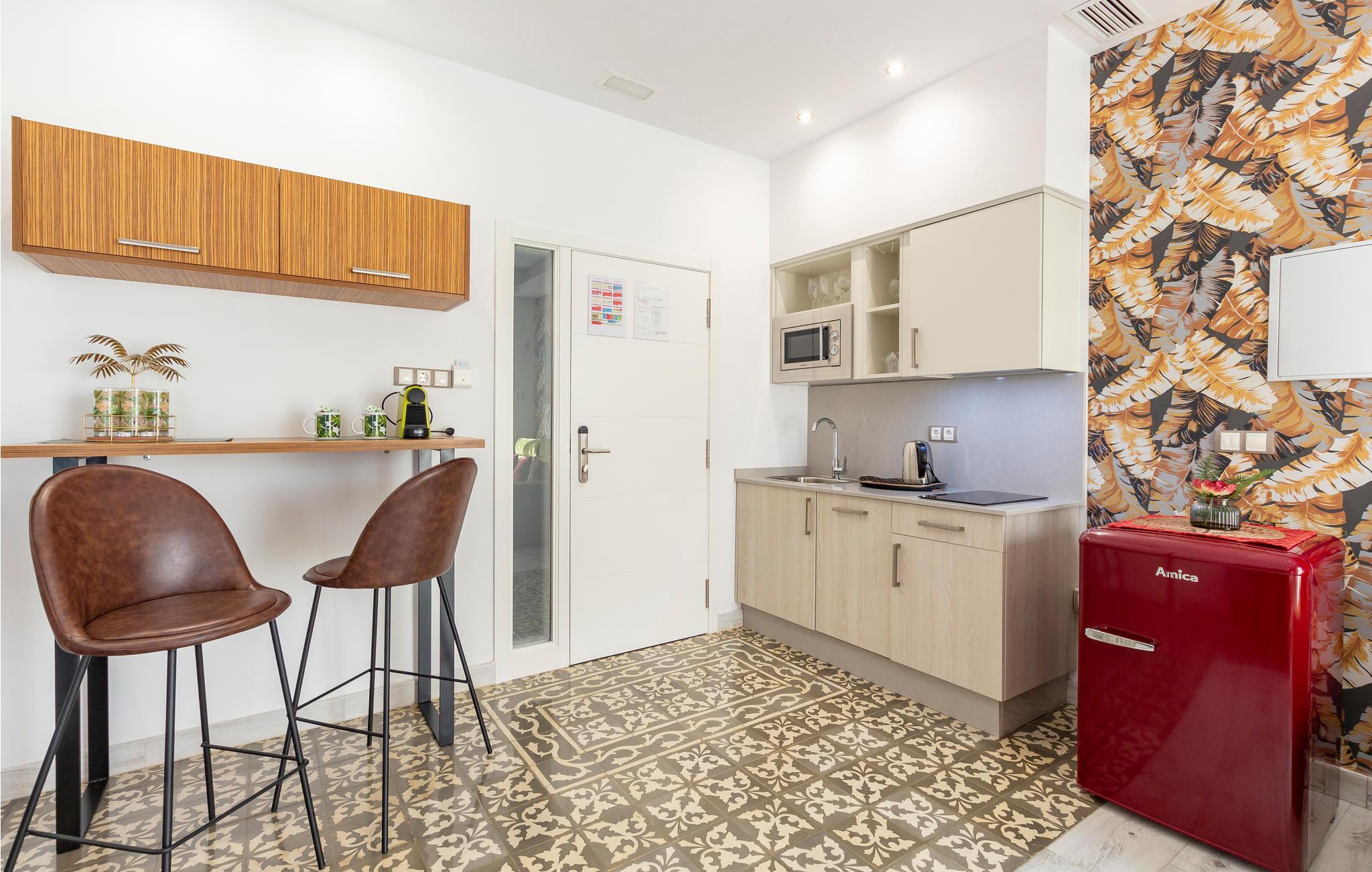 Hier begrüßt Sie ein markantes Ferienapartment mit spannenden Details in Sachen Einrichtung und Platzierung. Kunstvolle Fliesen, Holzmöbel sowie gespanntes Leder als Sitzmöglichkeiten, all das werden Sie in dieser wunderbaren Wohnung genießen. Selbige bietet Ihnen ein offengelegtes Wohnkonzept, wodurch jeder Raum bis auf das Badezimmer miteinander verbunden ist, die Wohnung jedoch sehr geräumig wirken lässt.