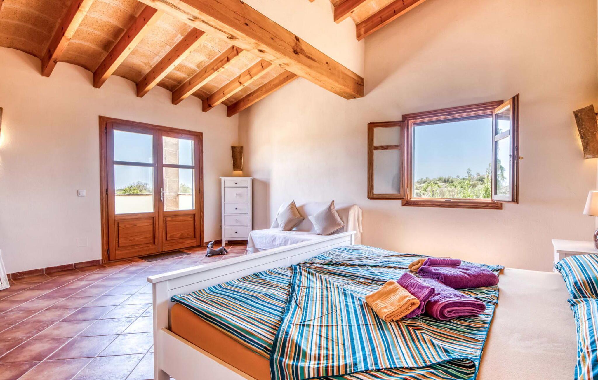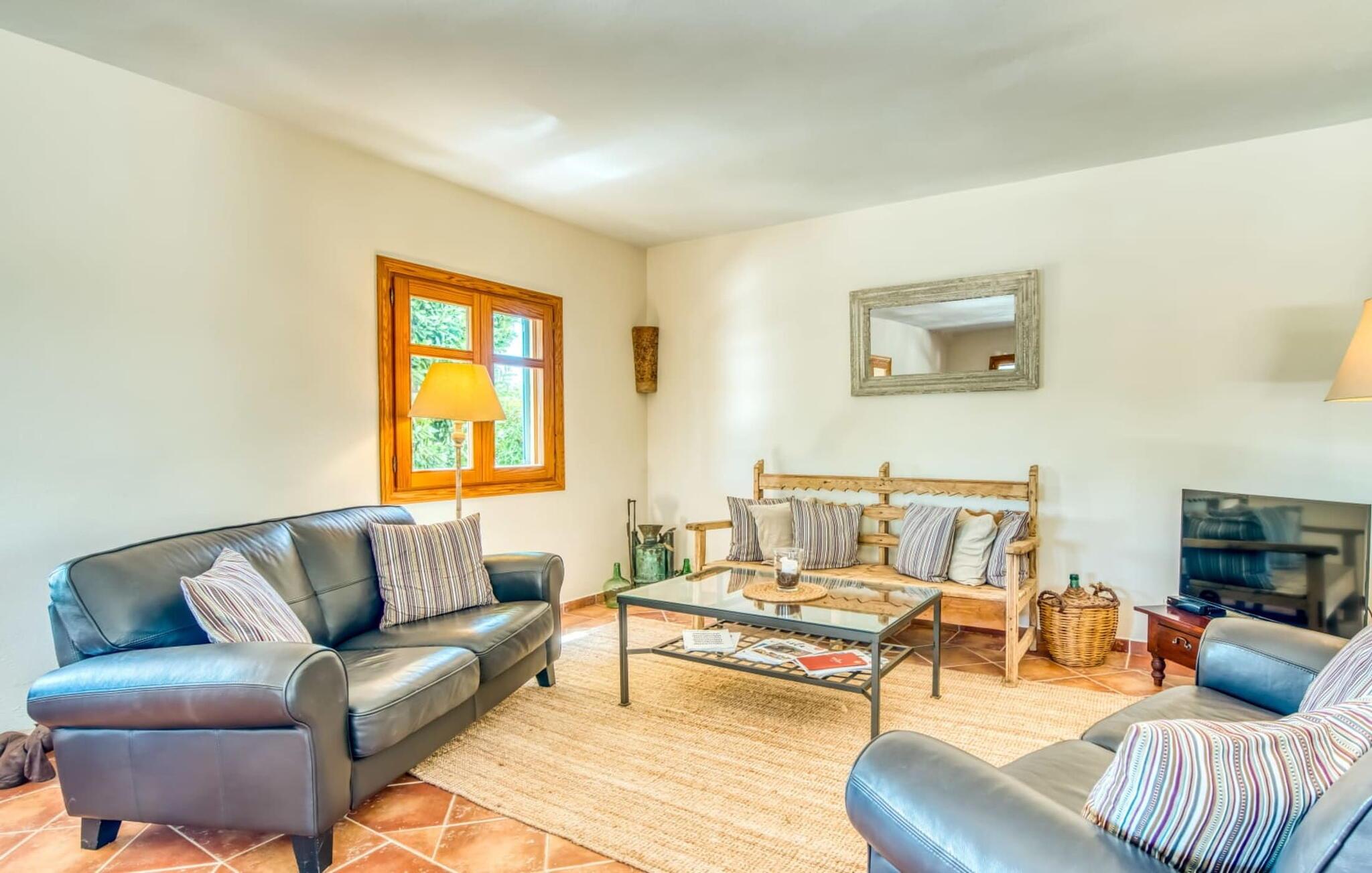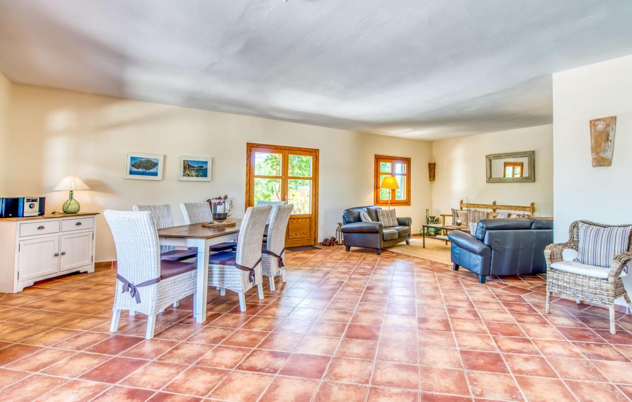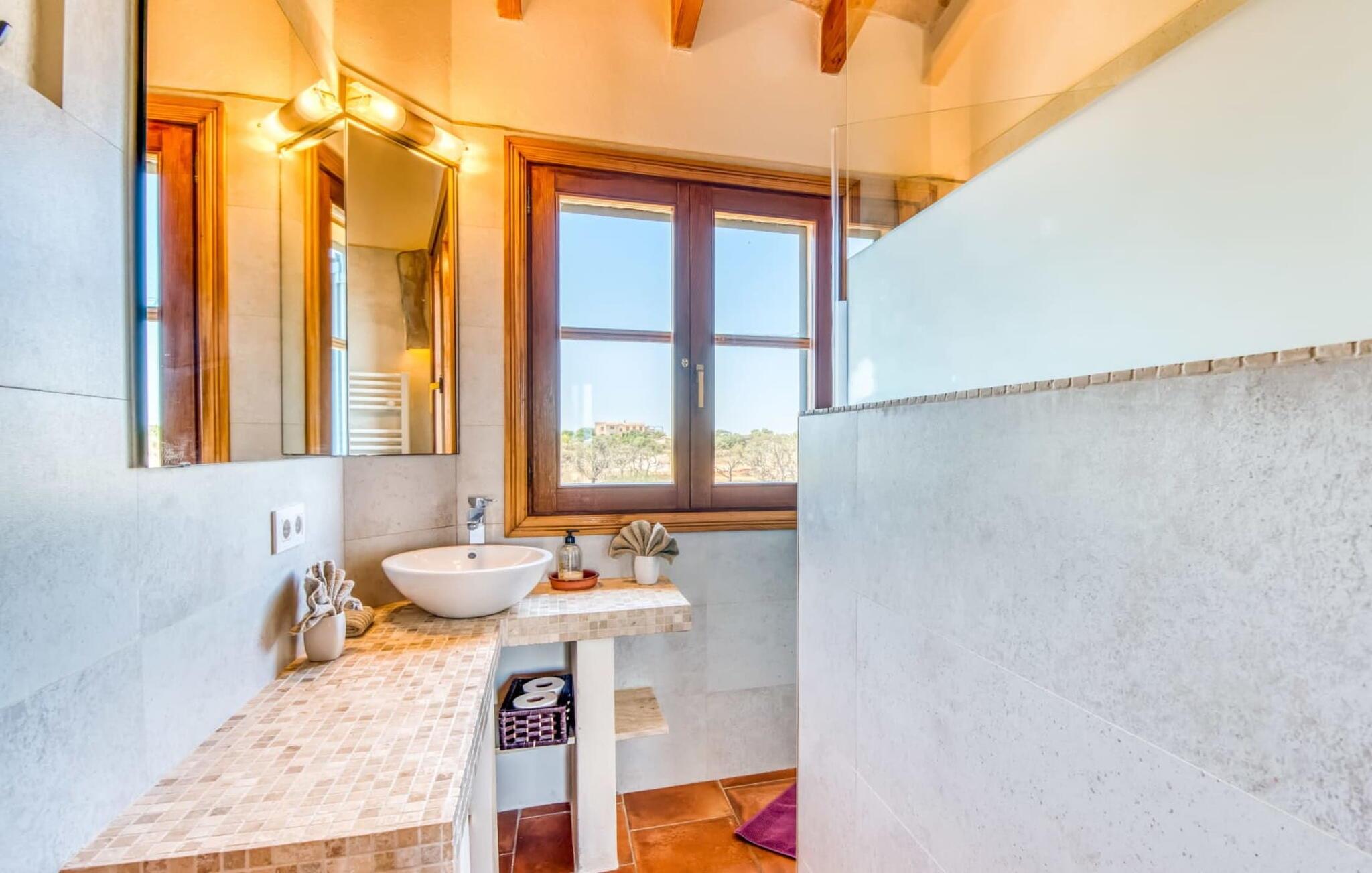 Die Zimmer sind hell und freundlich gestaltet. Ein offener Wohnbereich mit zwei bequemen Sofas lädt zu einem gemütlichen Fernsehabend ein. Der Wohnbereich öffnet sich zu einer Essecke mit einem Frisierstuhl für die jüngsten Gäste. Dieser Wohnbereich verfügt über pflegeleichte, terrakottafarbene Fliesen, Wände in sanften, erdigen Farben, honigfarbene Holzfenster und Fliesen, die in Lampen umgewandelt und an der Wand montiert wurden, was die besondere natürliche Atmosphäre des Wohnbereichs unterstreicht Haus. Die komfortable Küche befindet sich hinter dem Essbereich und ist funktionell ausgestattet mit einer Spülmaschine, einem Herd mit Gas- und Cerankochfeld, einem großen, freistehenden Kühlschrank, einer Kaffeemaschine (Nespresso, Pads müssen Sie selbst mitbringen) und vielem mehr . Mit den echten mallorquinischen Fliesen an den Wänden und den Arbeitsflächen trägt dieser Raum zum authentischen Stil des Hauses bei. Eltern mit kleinen Kindern sollten aus Sicherheitsgründen beachten, dass die Treppe offen ist und eine potenzielle Gefahr darstellen könnte. In den drei unglaublich geräumigen und komfortablen Schlafzimmern der Villa gibt es ausreichend Platz für bis zu 6 Personen (plus ein Baby) zum Entspannen. In den Schlafzimmern finden Sie die gleichen schönen Bodenfliesen, hellen, fröhlichen Wände und teilweise freiliegenden Holzbalken. Beide Badezimmer sind mit Naturstein ausgestattet.