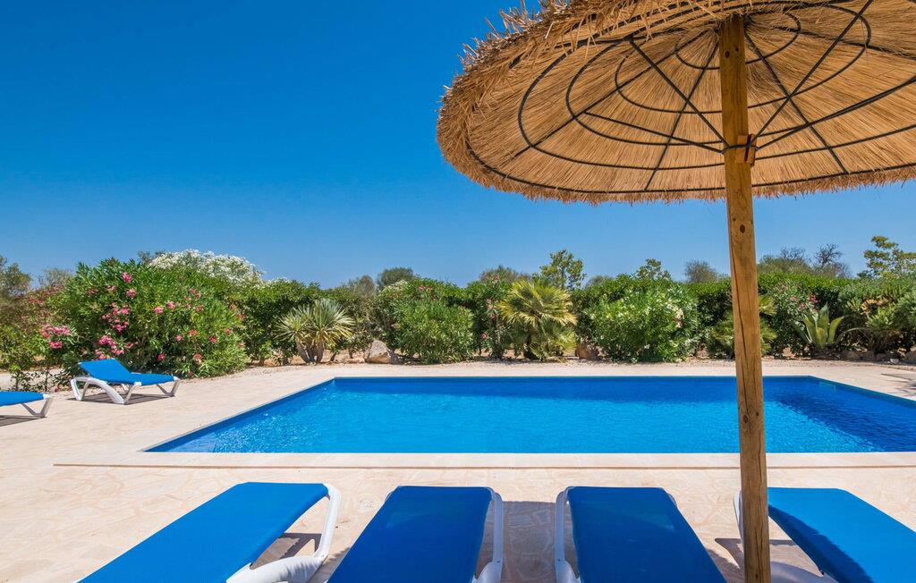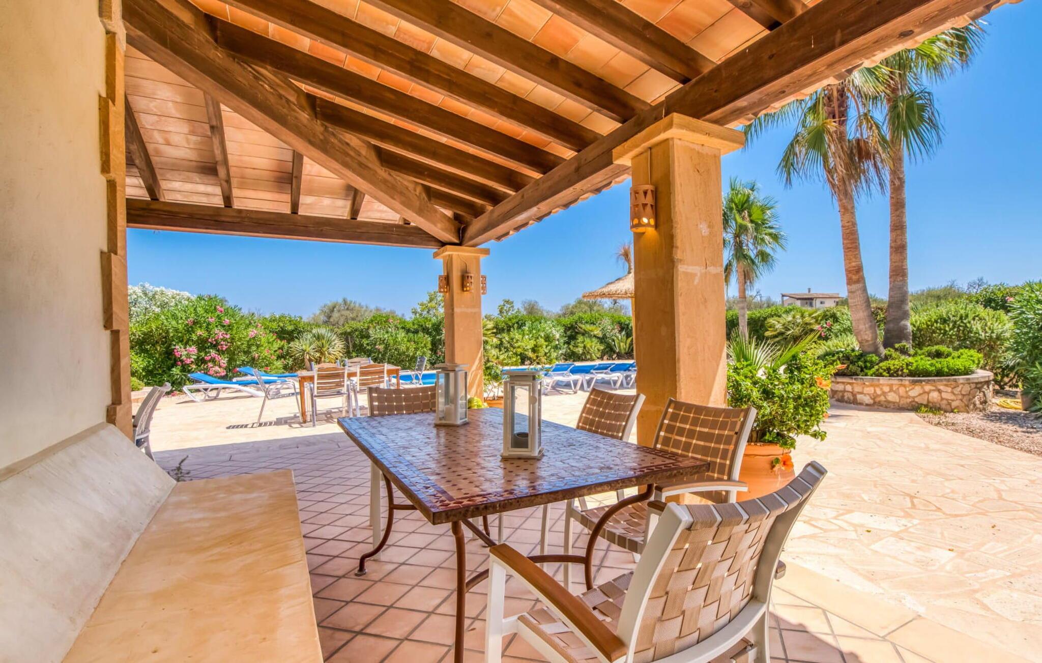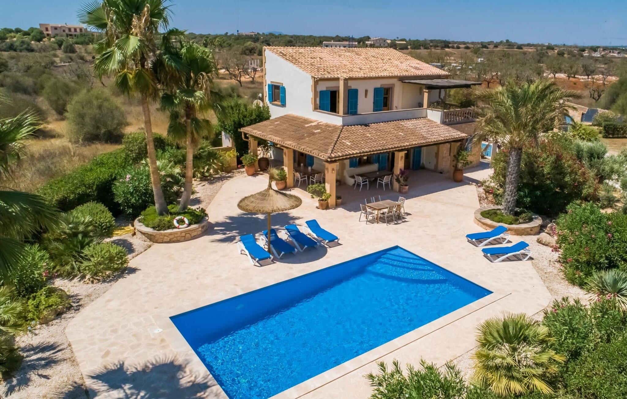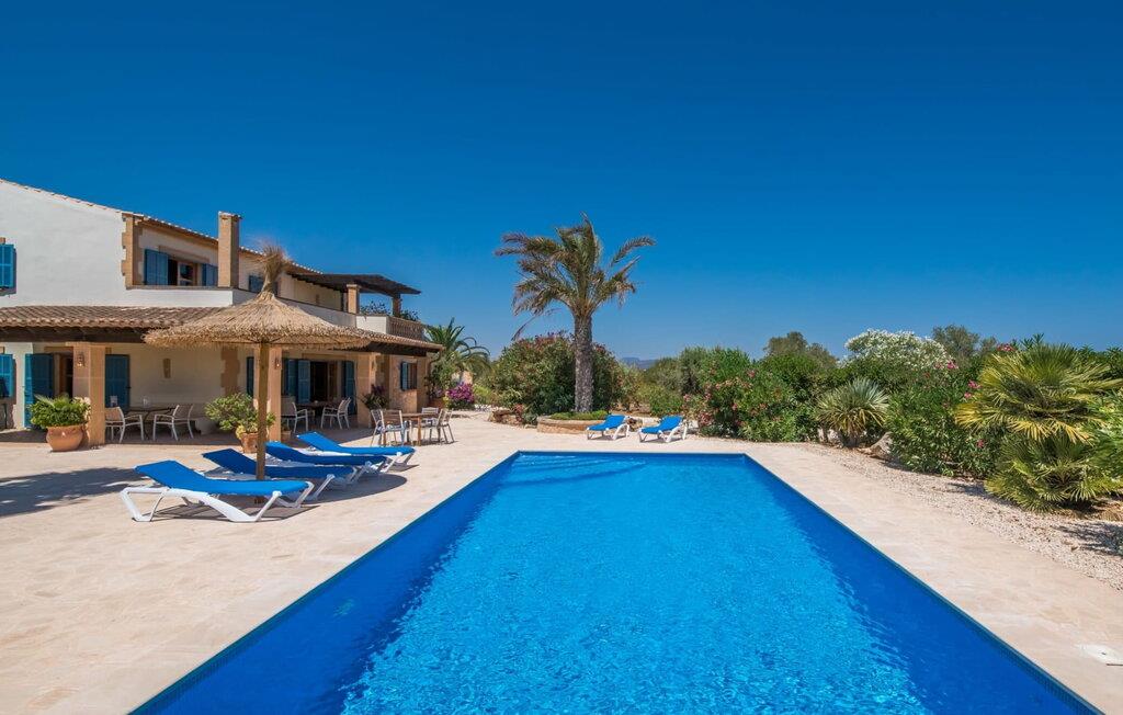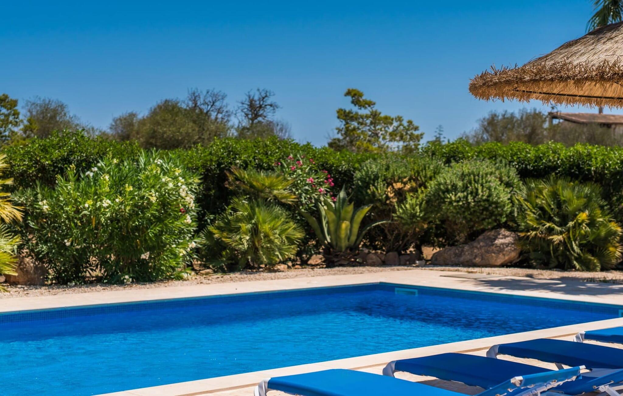 Die familienfreundliche Villa „Sila“ besticht durch ihre einzigartige, ruhige und völlig uneinsehbare Lage auf einem knapp 10.000 m² großen, mit Palmen und Oleandern bewachsenen Grundstück. Ihr Blick reicht weit über die Grenzen des Anwesens hinaus, während Sie die Abgeschiedenheit dieser bezaubernden Villa vor der Kulisse von Olivenhainen und landwirtschaftlichen Parzellen genießen. Allerdings liegt das Haus keineswegs isoliert, sondern vor den Toren der schönen Stadt Santanyí. Dass Sie in der Nähe eines der schönsten Orte im Süden der Insel wohnen, werden Sie schnell merken – wenn nicht sofort, dann auf jeden Fall, wenn Sie die märchenhafte Aussicht vom großzügigen Balkon im Obergeschoss genießen. Über eine lange Auffahrt gelangen Sie zum Haus – die fröhliche Villa mit wunderschönen hellblauen Fensterläden und zahlreichen Terrassen wirkt so friedlich und ruhig, dass Sie sich sofort rundum willkommen fühlen werden. Auf dem gesamten Anwesen und in der Villa wirkt alles besonders natürlich und authentisch – dies wird auch durch den üppigen Garten rund um die Villa unterstrichen. Der blaue Himmel spiegelt sich in den Poolliegen und azurblauen Fensterläden rund um den großen, privaten Pool von 50 m² mit großer, umlaufender Natursteinterrasse. Gönnen Sie sich ein Sonnenbad auf der einladenden Poolterrasse und genießen Sie Abendessen mit der gesamten Gruppe in den überdachten Außenbereichen der Unterkunft.