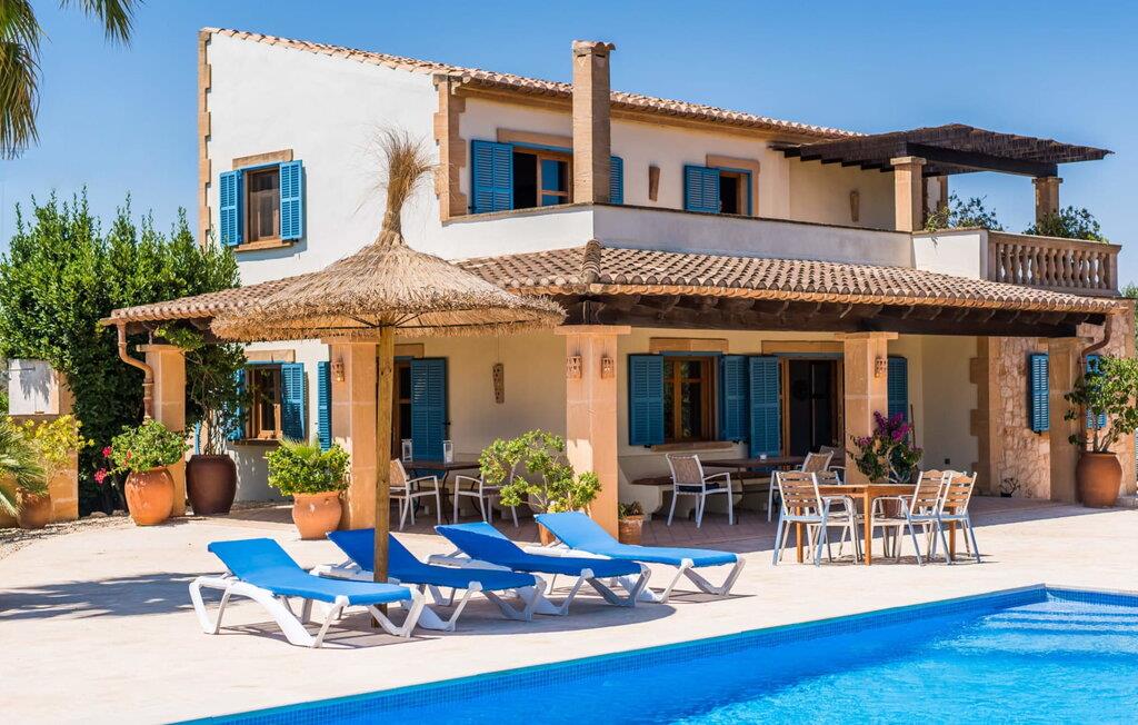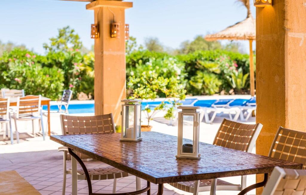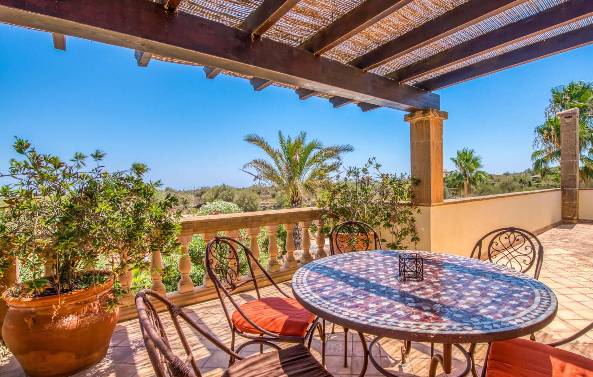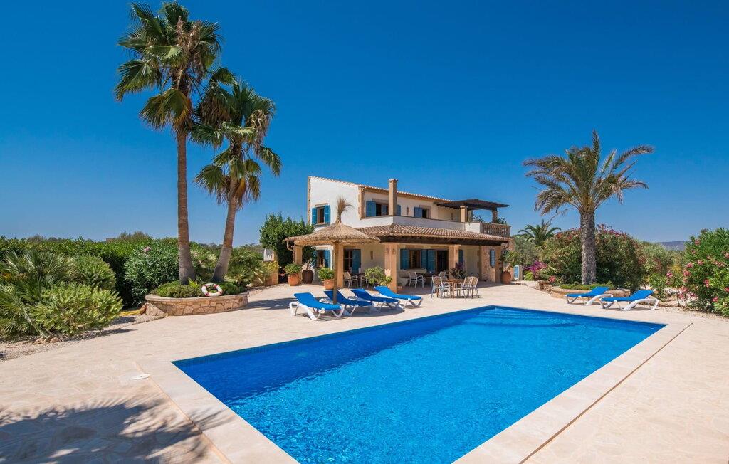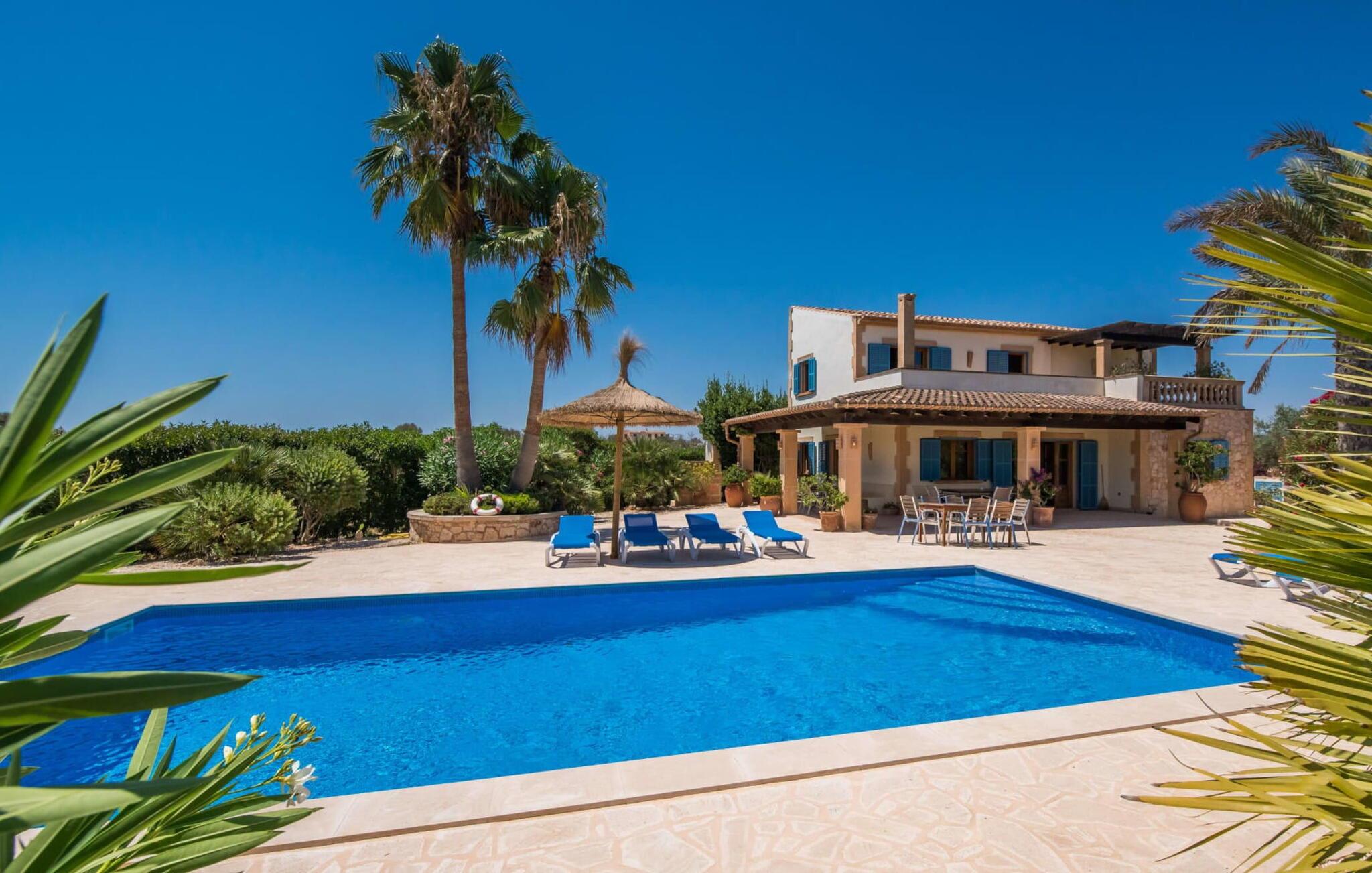 Die familienfreundliche Villa „Sila“ besticht durch ihre einzigartige, ruhige und völlig uneinsehbare Lage auf einem knapp 10.000 m² großen, mit Palmen und Oleandern bewachsenen Grundstück. Ihr Blick reicht weit über die Grenzen des Anwesens hinaus, während Sie die Abgeschiedenheit dieser bezaubernden Villa vor der Kulisse von Olivenhainen und landwirtschaftlichen Parzellen genießen. Allerdings liegt das Haus keineswegs isoliert, sondern vor den Toren der schönen Stadt Santanyí. Dass Sie in der Nähe eines der schönsten Orte im Süden der Insel wohnen, werden Sie schnell merken – wenn nicht sofort, dann auf jeden Fall, wenn Sie die märchenhafte Aussicht vom großzügigen Balkon im Obergeschoss genießen. Über eine lange Auffahrt gelangen Sie zum Haus – die fröhliche Villa mit wunderschönen hellblauen Fensterläden und zahlreichen Terrassen wirkt so friedlich und ruhig, dass Sie sich sofort rundum willkommen fühlen werden. Auf dem gesamten Anwesen und in der Villa wirkt alles besonders natürlich und authentisch – dies wird auch durch den üppigen Garten rund um die Villa unterstrichen. Der blaue Himmel spiegelt sich in den Poolliegen und azurblauen Fensterläden rund um den großen, privaten Pool von 50 m² mit großer, umlaufender Natursteinterrasse. Gönnen Sie sich ein Sonnenbad auf der einladenden Poolterrasse und genießen Sie Abendessen mit der gesamten Gruppe in den überdachten Außenbereichen der Unterkunft.