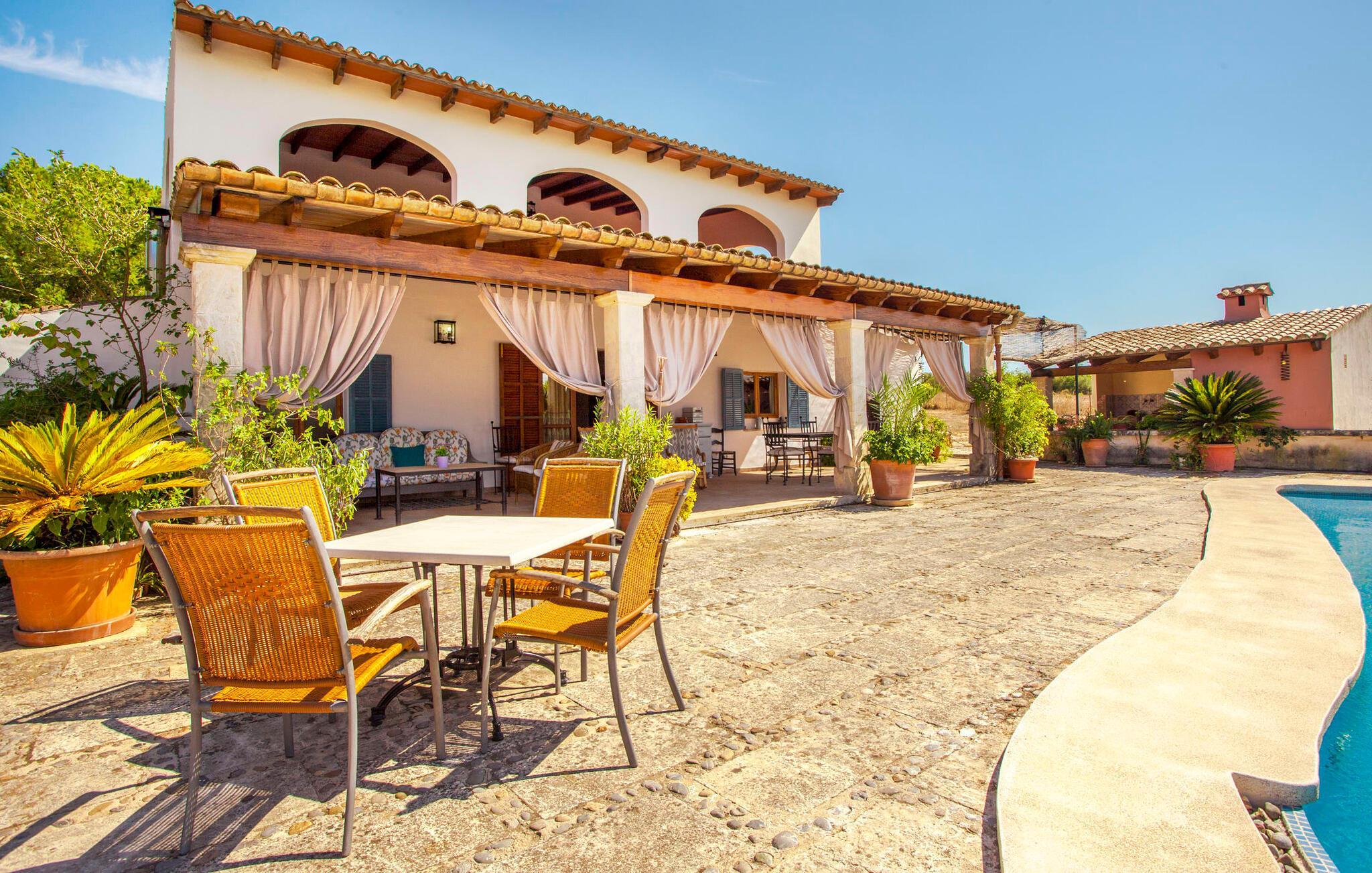 Ein Villenurlaub bietet die perfekte Auszeit vom städtischen Trubel – vor allem, wenn die Lage so naturnah ist, wie es bei diesem hübschen Anwesen der Fall ist: Das Anwesen der Villa „Son Bachs“ ist von der ländlichen mediterranen Ebene umgeben „Pla de Mallorca“, über das Sie Ihren Blick schweifen lassen können. Der schön geschwungene Pool ist groß genug, um auch ambitionierten Schwimmern an einem sonnigen Tag eine wunderbare Erfrischung zu bieten. Anschließend können Sie sich für eine Pause auf eine der Liegen zurückziehen – entweder im Schutz einer Palme, die tropisches Flair versprüht, oder unter der schattigen Pergola. Der Garten vereint verschiedene Qualitäten, darunter auch einen wildromantischen Touch, während der Sitz- und Loungebereich einem gepflegten Park gleicht. Dank des Bungalows, der über eine komfortable Außenküche mit eingebautem Grill verfügt, lässt sich der Traum einer entspannten Grillfeier im Handumdrehen verwirklichen. Ein Esstisch steht direkt am Pool, ein weiterer auf der überdachten Veranda, die auch über eine gemütliche Sitzecke und einen Schaukelstuhl verfügt. Die überdachte Terrasse, die vom Obergeschoss aus zugänglich ist, lädt zum gemütlichen Entspannen ein.
