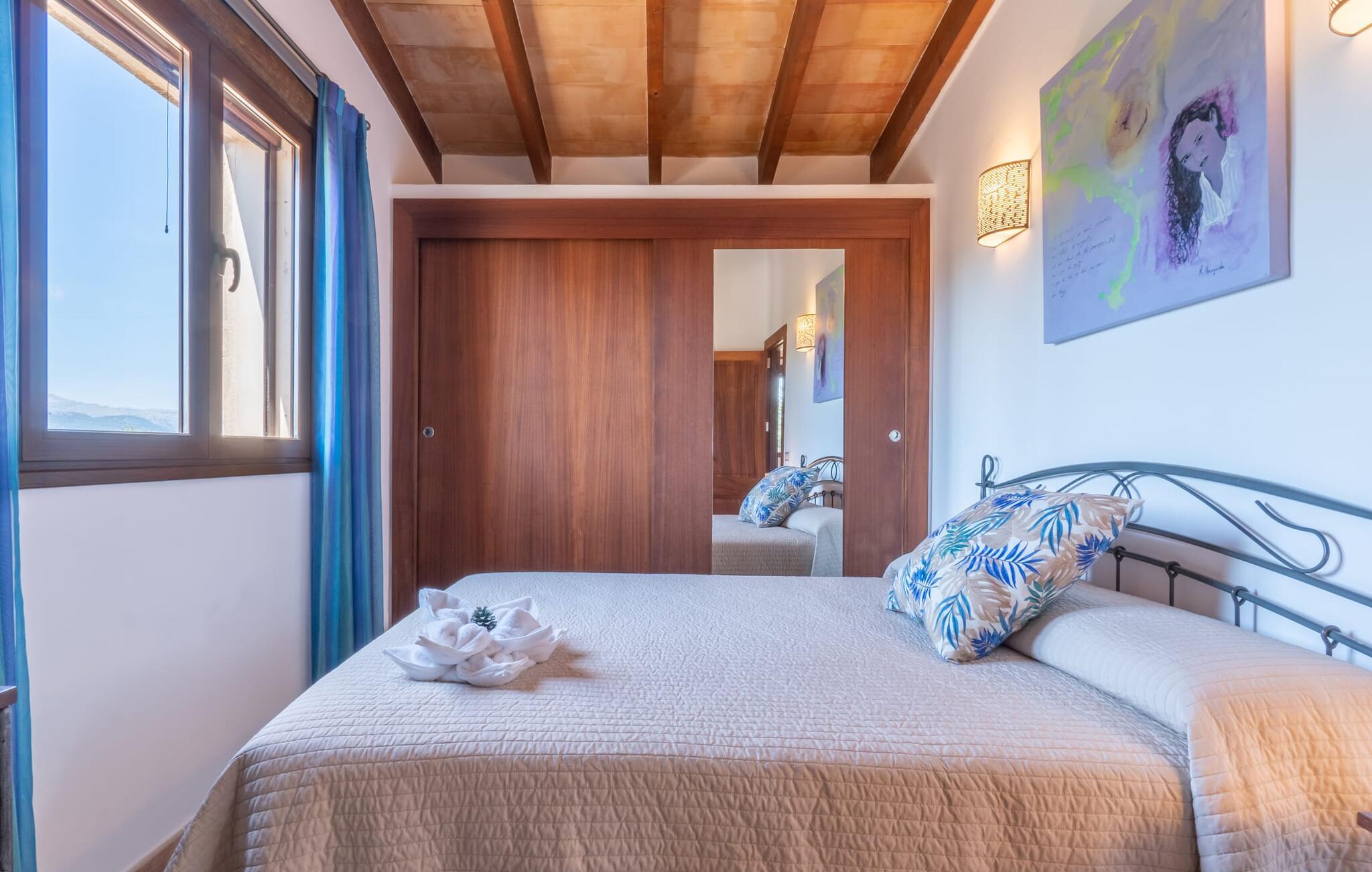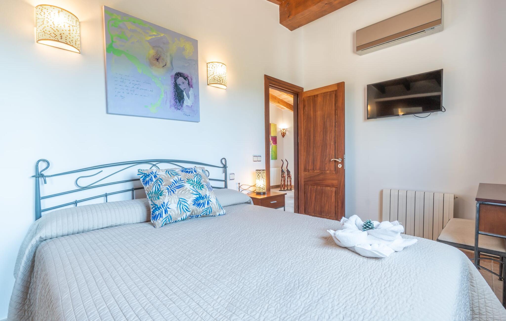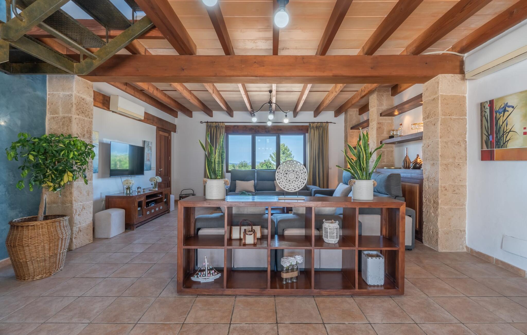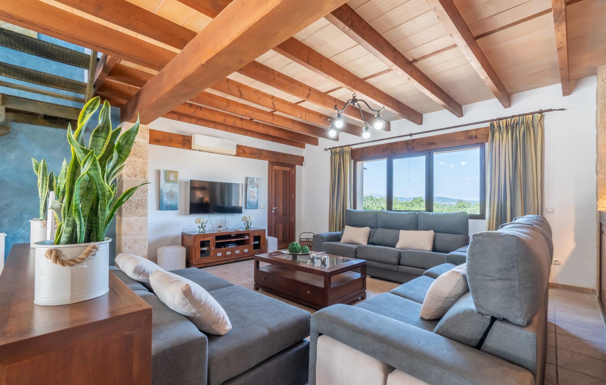 Im Inneren verbindet das Bauernhaus traditionelle mallorquinische Elemente mit modernem Komfort. Im Erdgeschoss befindet sich ein Wohnzimmer mit einem großen Ecksofa, das sich ideal zum geselligen Beisammensein eignet, während die gut ausgestattete Küche und der offene Essbereich Platz für die ganze Familie bieten. Ein Schlafzimmer und ein Badezimmer befinden sich ebenfalls auf dieser Ebene. Eine Treppe mit Kindersicherung führt vom Wohnzimmer in die obere Etage. Im Obergeschoss erwartet Sie ein Hauptschlafzimmer mit Ankleidebereich und eigenem Bad sowie zwei weitere Schlafzimmer, die sich ein Badezimmer teilen. In einem separaten Nebengebäude befindet sich das fünfte Schlafzimmer mit eigenem WC. Eine Klimaanlage in allen Bereichen sorgt für einen komfortablen Aufenthalt, auch in der Sommerhitze.