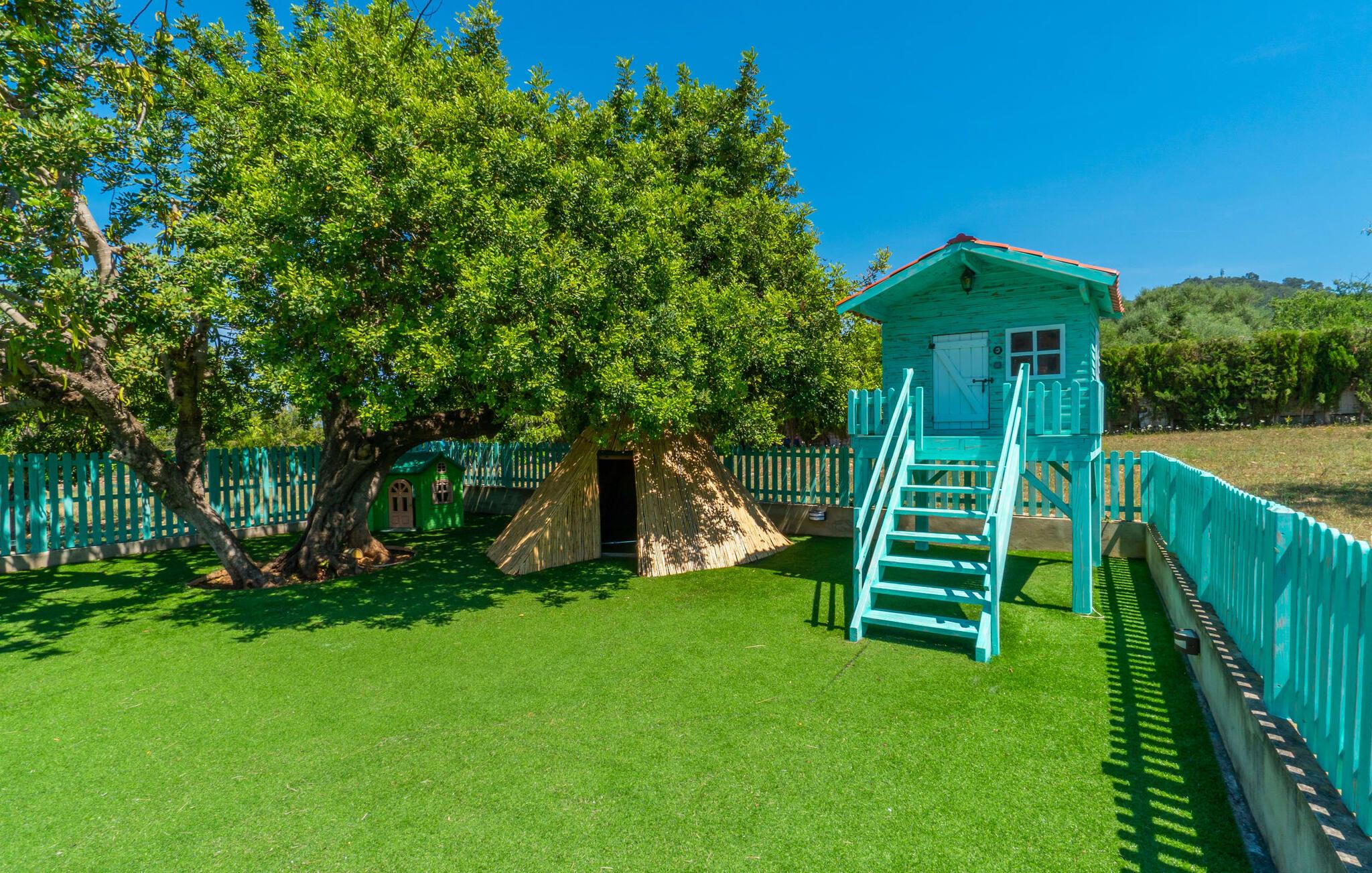 Die kinderfreundlichen Außenbereiche sind zum Genießen konzipiert, mit einem Pool, einem kindersicheren Spielplatz mit Bambushütte und Baumhaus und viel Platz für alle zum Entspannen. Die gemütliche überdachte Terrasse eignet sich perfekt für Grillabende mit der Familie, während zwei Tiefgaragenplätze in den heißen Sommermonaten für Komfort sorgen.