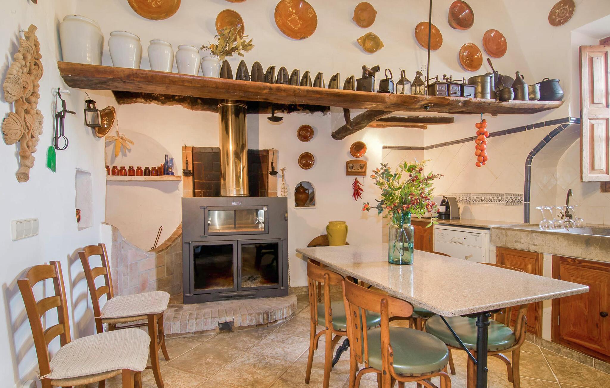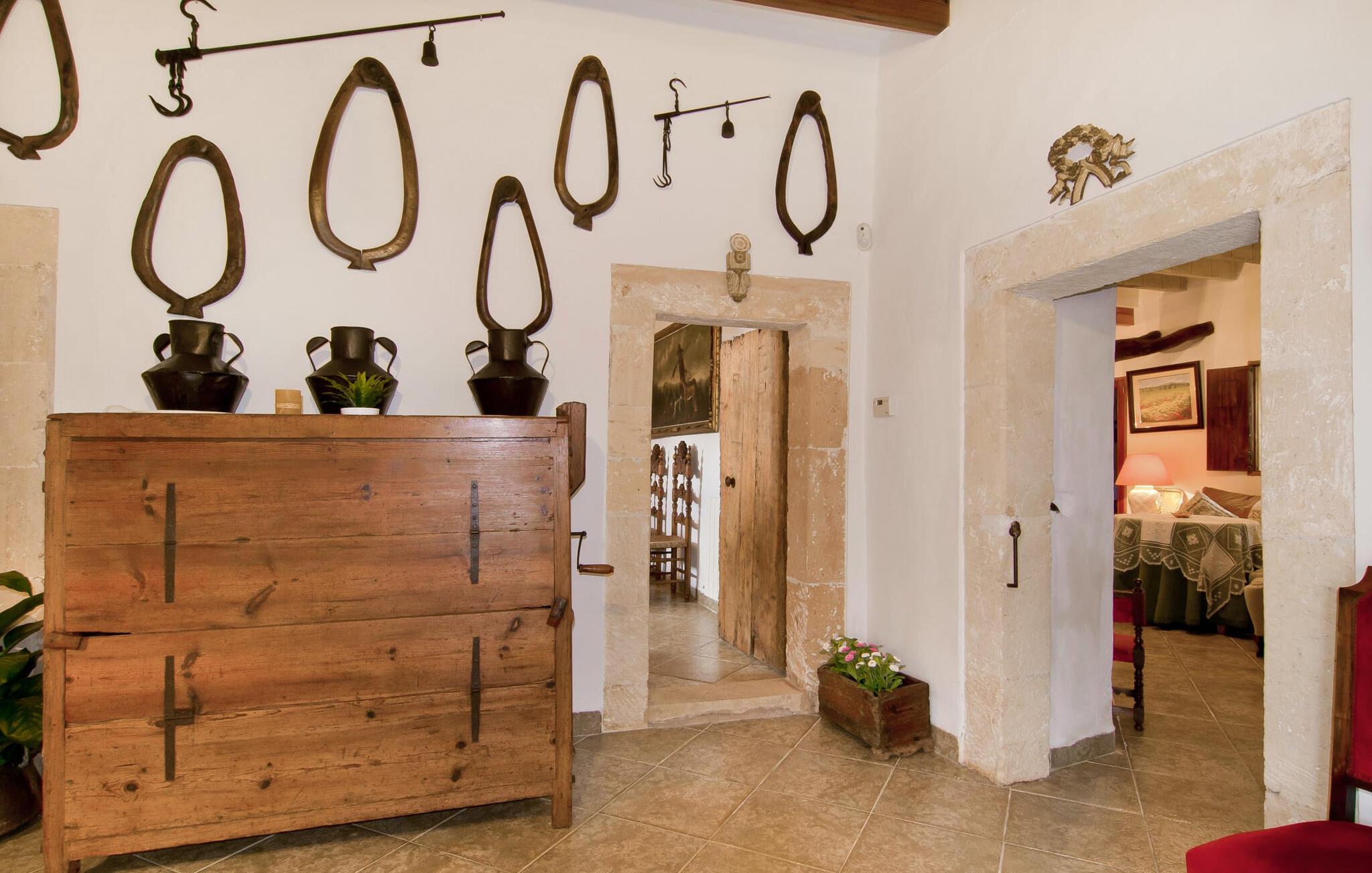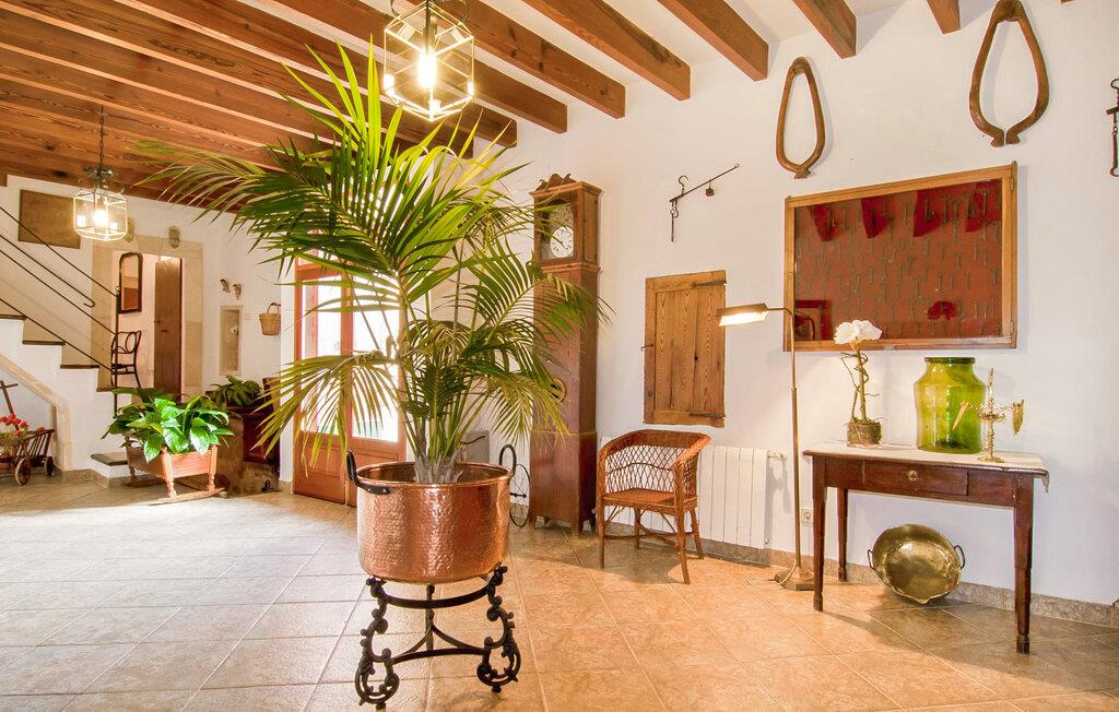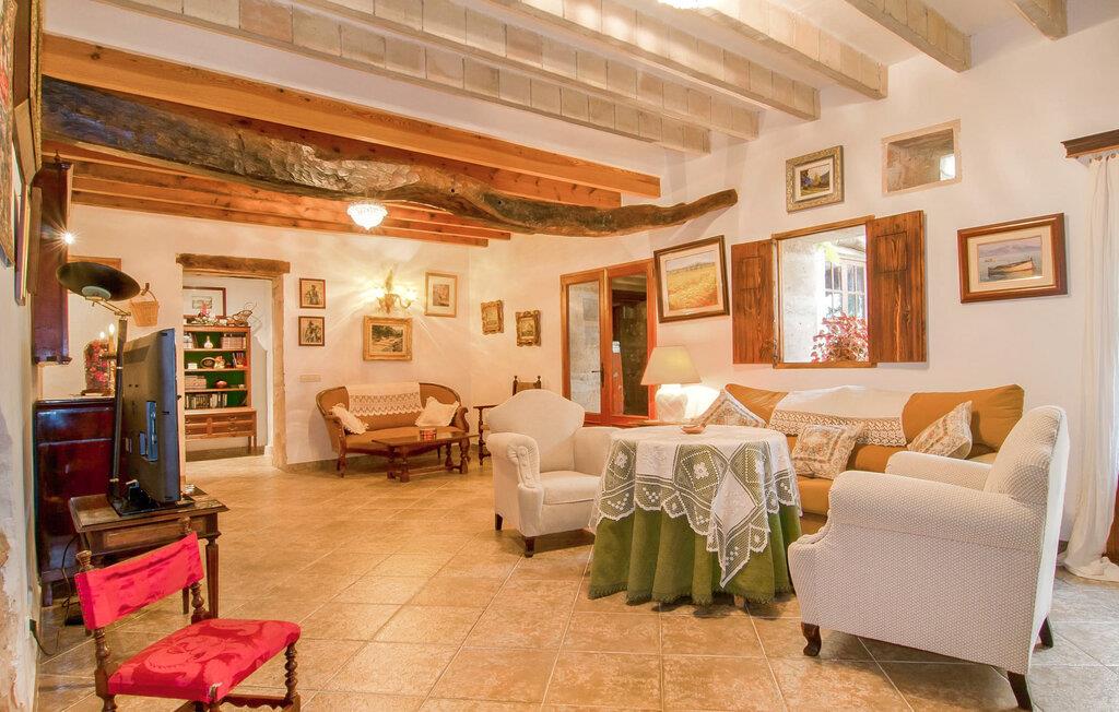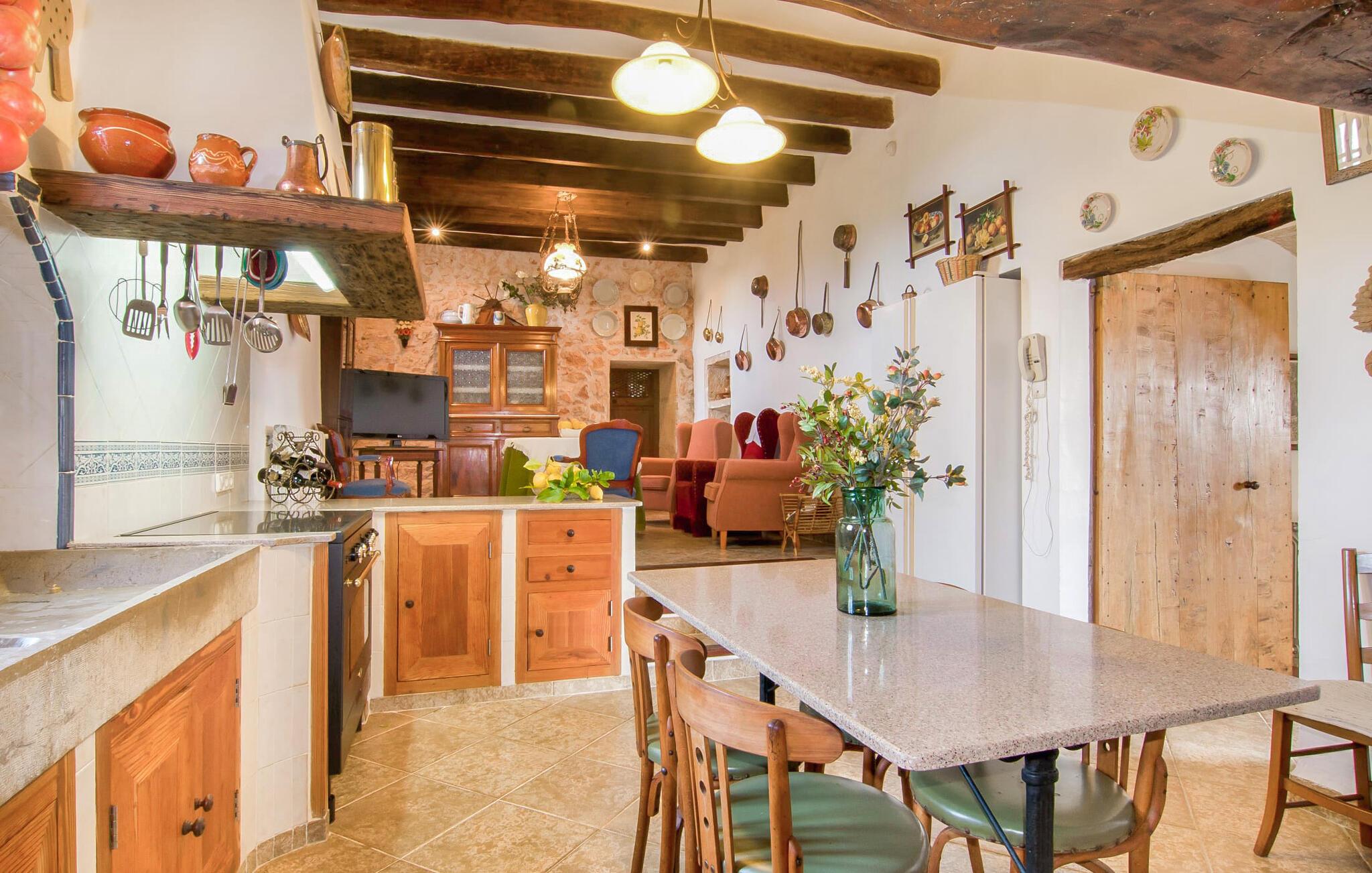 Das Haupthaus ist sehr schön gestaltet. Sichtbares Bruchsteinmauerwerk und hölzerne Deckenbalken harmonieren deutlich mit den vielen landwirtschaftlichen Artefakten. Ein moderner Kamin, der sich in der Küche befindet, wo früher der Herd stand, handbemalte typisch mallorquinische Wandfliesen und modernster Komfort durch den amerikanischen Kühlschrank mit Eismaschine stehen in keinem Widerspruch zueinander. Dieses alte Häuschen wurde auf den neuesten Stand gebracht, um modernen Ansprüchen gerecht zu werden und gleichzeitig mit Sammlungen alter Krüge, Wandteller, Kupferpfannen und anderen liebevoll arrangierten Details auf subtile Weise Details seiner Vergangenheit zu vermitteln. Der Wohnbereich mit Sesseln und Stühlen in verschiedenen Farben liegt auf einer zweiten Ebene von der Küche entfernt. Es gibt sogar einen Fernseher. Das sehr geräumige Wohnzimmer verfügt über einen weiteren LCD-Fernseher.