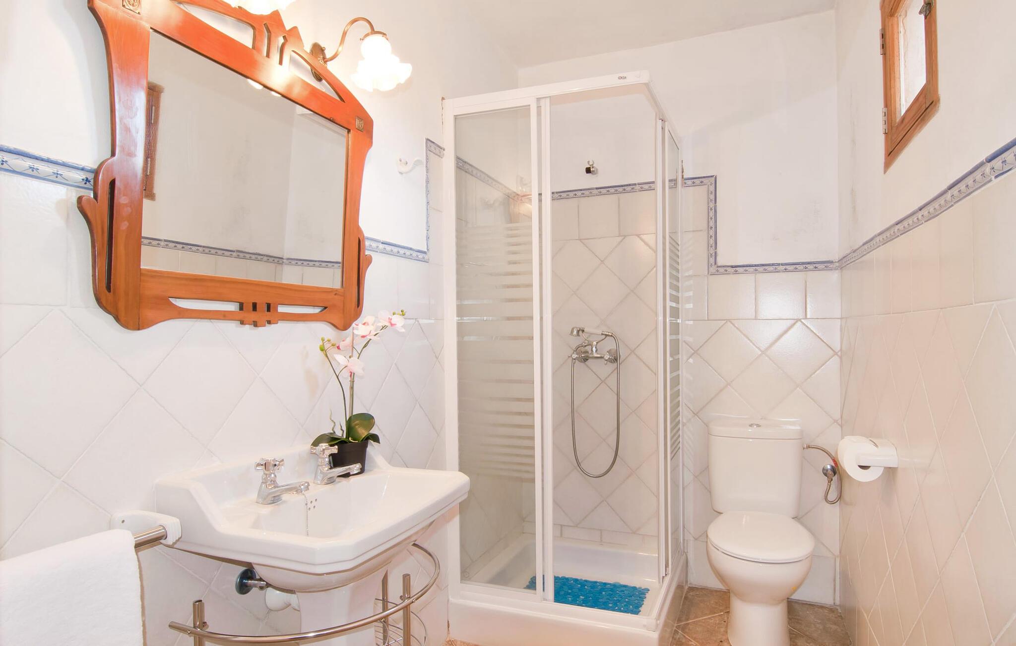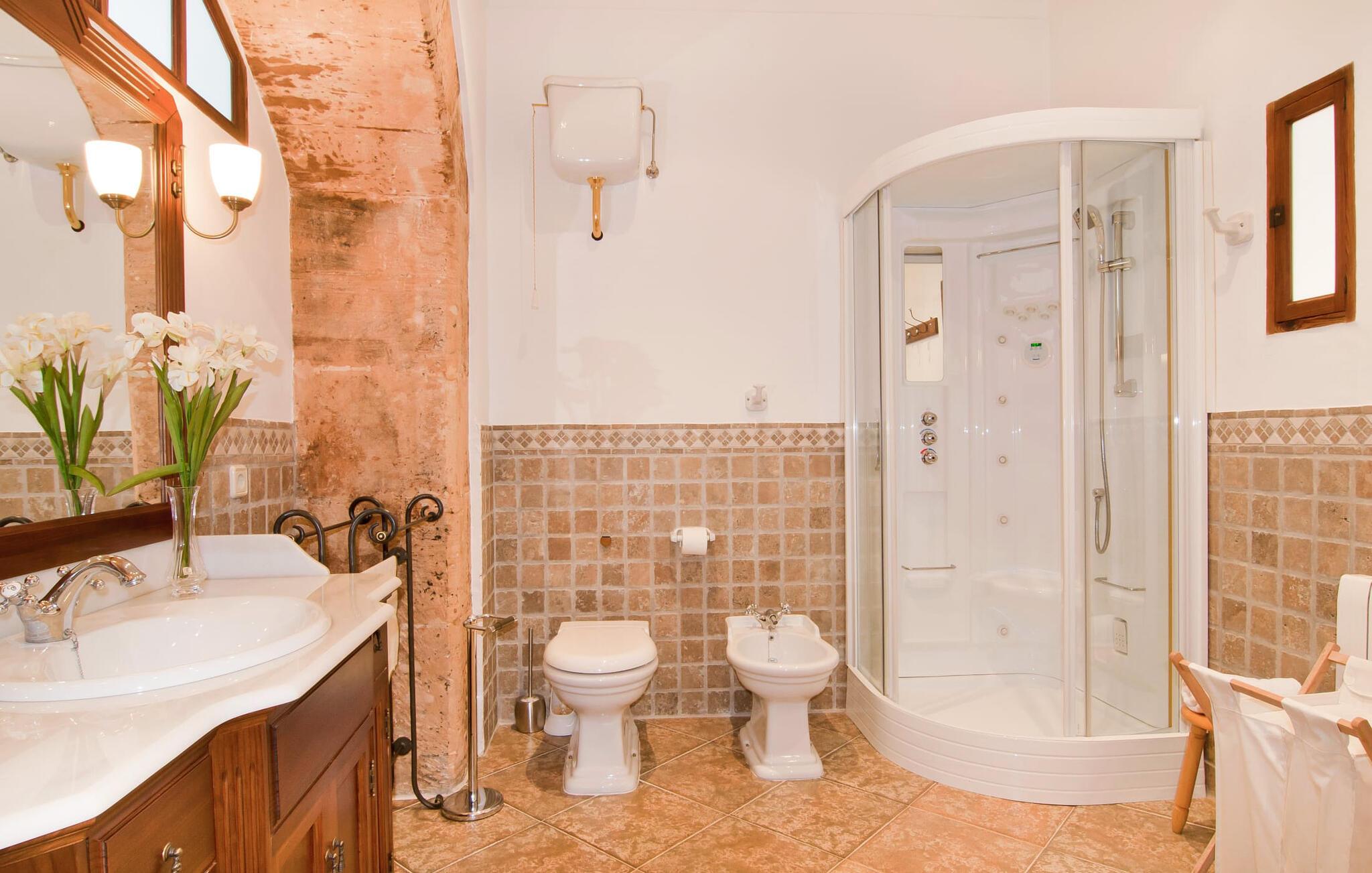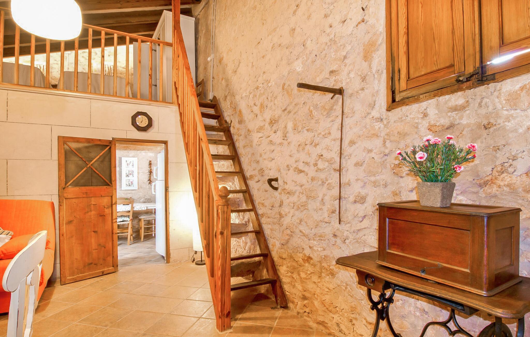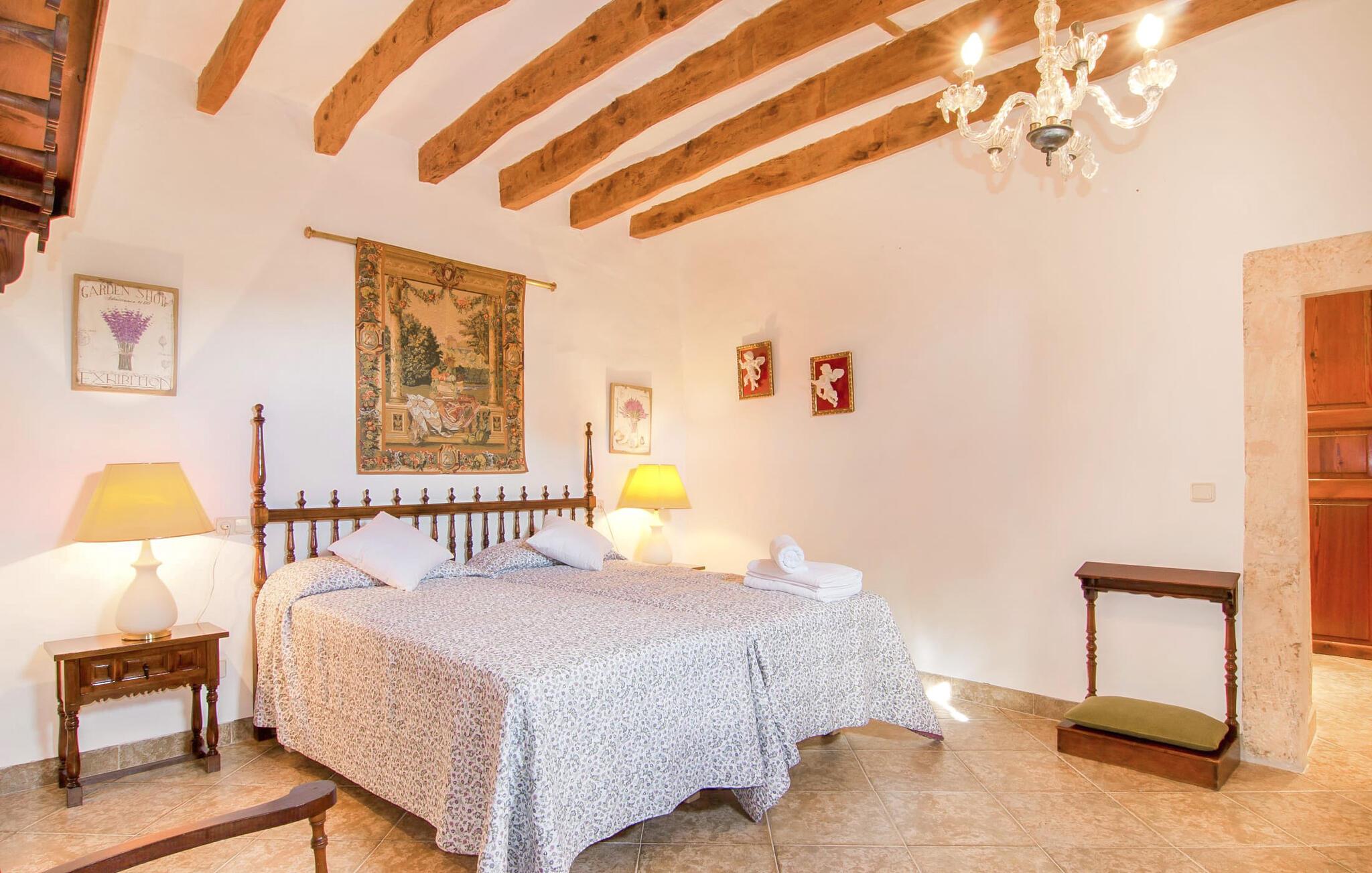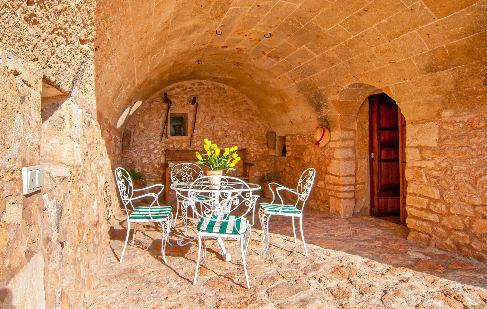 Das Haupthaus ist sehr schön gestaltet. Sichtbares Bruchsteinmauerwerk und hölzerne Deckenbalken harmonieren deutlich mit den vielen landwirtschaftlichen Artefakten. Ein moderner Kamin, der sich in der Küche befindet, wo früher der Herd stand, handbemalte typisch mallorquinische Wandfliesen und modernster Komfort durch den amerikanischen Kühlschrank mit Eismaschine stehen in keinem Widerspruch zueinander. Dieses alte Häuschen wurde auf den neuesten Stand gebracht, um modernen Ansprüchen gerecht zu werden und gleichzeitig mit Sammlungen alter Krüge, Wandteller, Kupferpfannen und anderen liebevoll arrangierten Details auf subtile Weise Details seiner Vergangenheit zu vermitteln. Der Wohnbereich mit Sesseln und Stühlen in verschiedenen Farben liegt auf einer zweiten Ebene von der Küche entfernt. Es gibt sogar einen Fernseher. Das sehr geräumige Wohnzimmer verfügt über einen weiteren LCD-Fernseher.