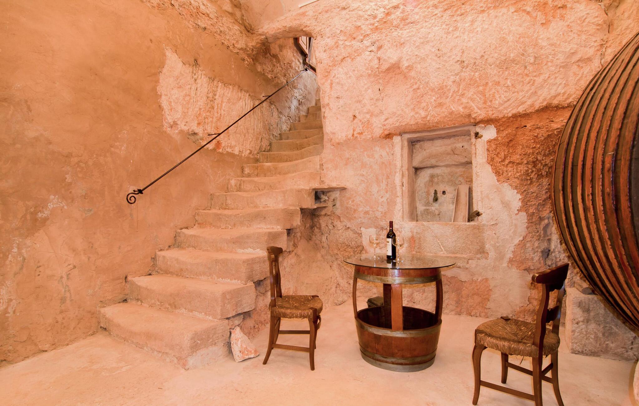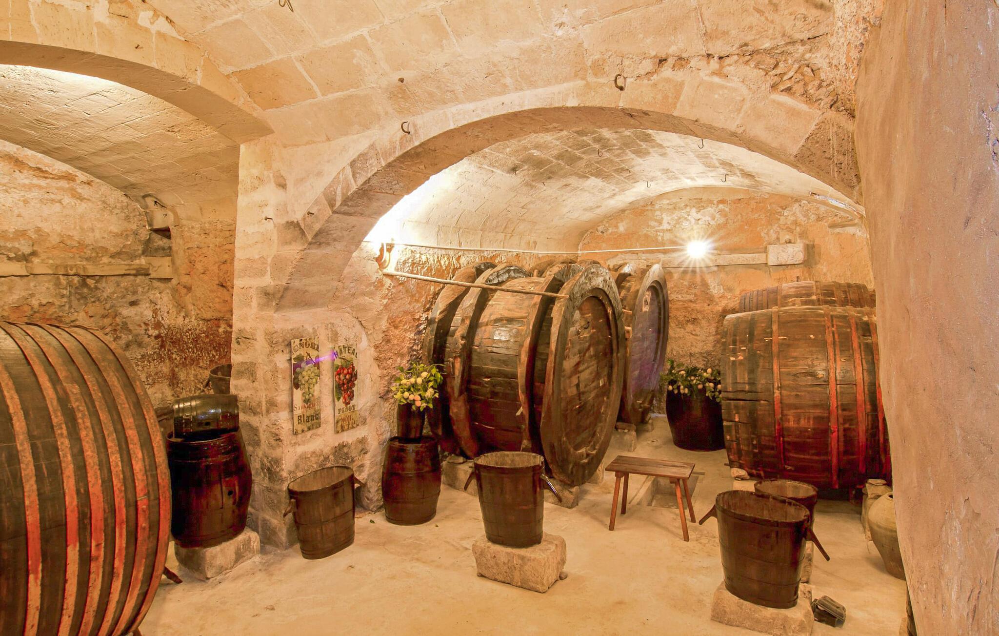 Neben den sehr komfortablen und gemütlichen Wohn- und Schlafräumen gibt es im Außenbereich zahlreiche Sitzmöglichkeiten. Hier finden Sie einen großen Esstisch mit vielen Stühlen, kleine schattenspendende Bänke und ein Kaffeehaus-Ensemble aus vier Stühlen unter einem Bogen, wo Sie Ihren Kaffee in der Sonne oder im Schatten genießen können. Die Polyrattan-Sonnenliegen bieten den Gästen – auf Wunsch mit Schattenspender durch einen Sonnenschirm – einen bequemen Liegeplatz und können das ruhige und milde mediterrane Klima genießen oder sich nach einem Bad im privaten Pool erholen. Lust auf eine kleine Weinprobe? Ein besonderes Highlight ist der Gewölbekeller, der echte Weinfässer beherbergt. Ein besonders rustikaler Ort, um bei schlechtem Wetter einen Abend oder einen Tag zu verbringen