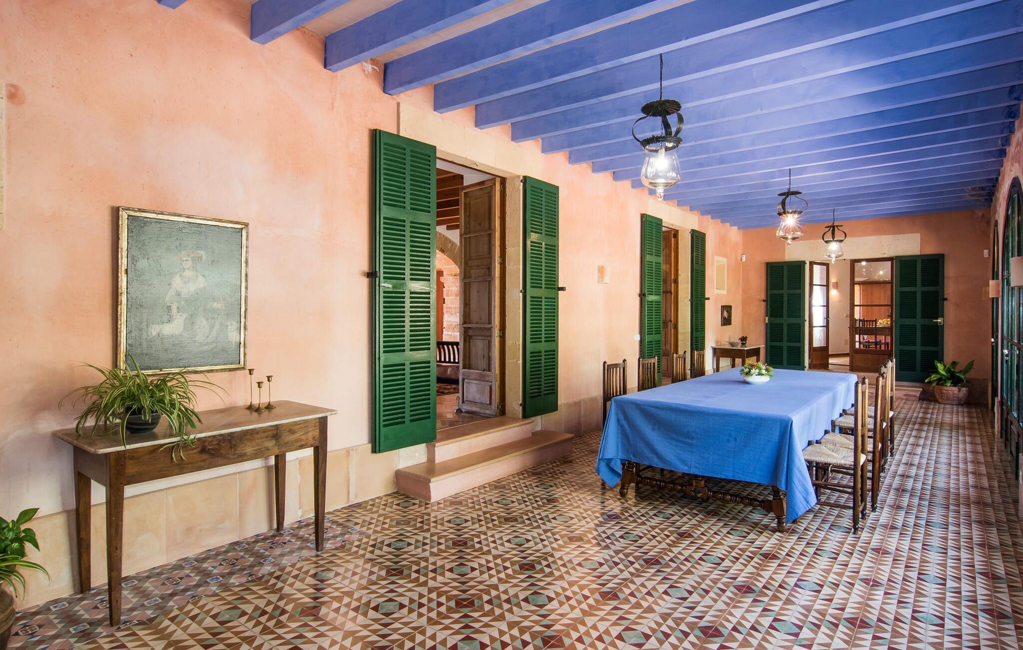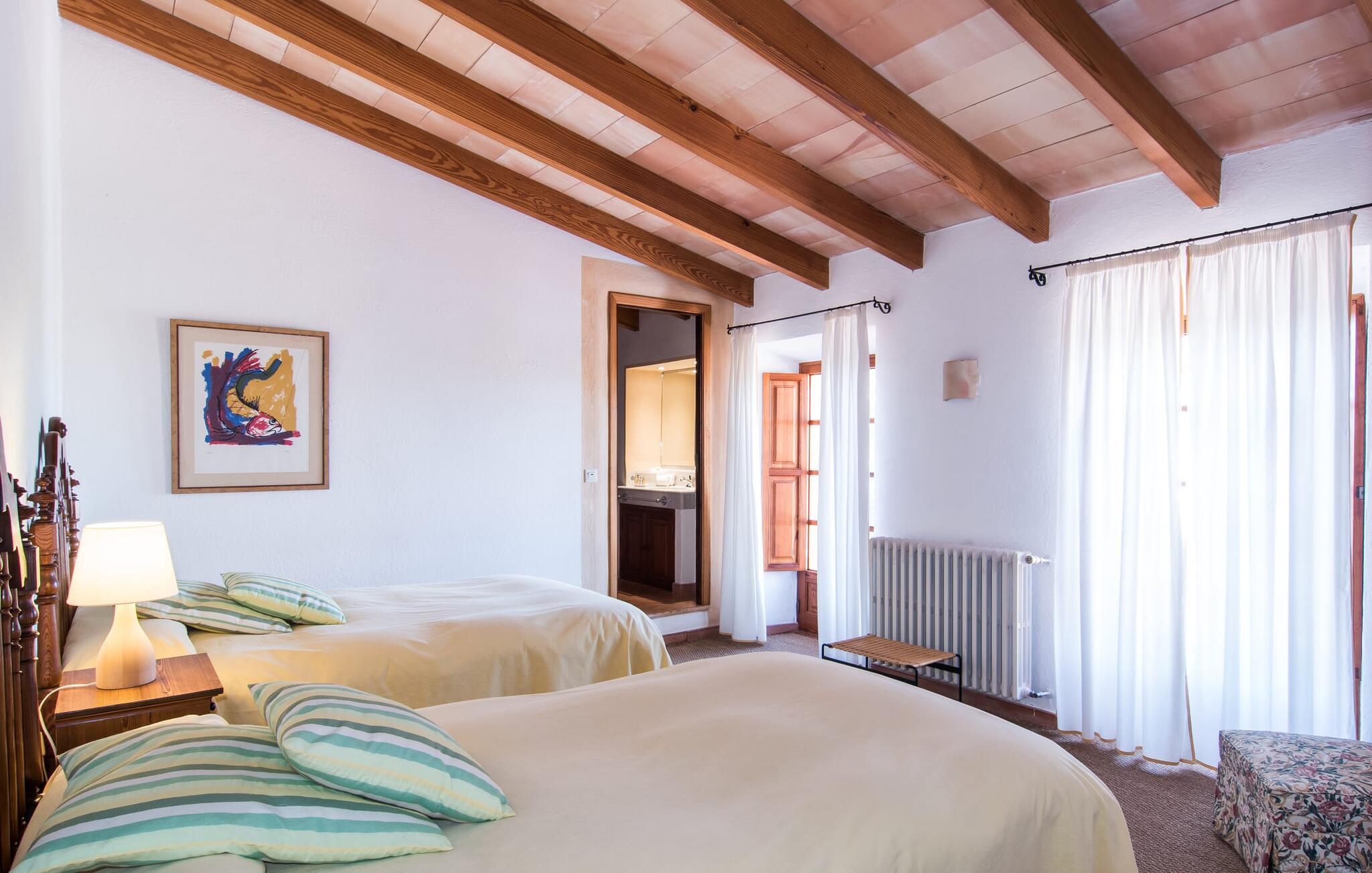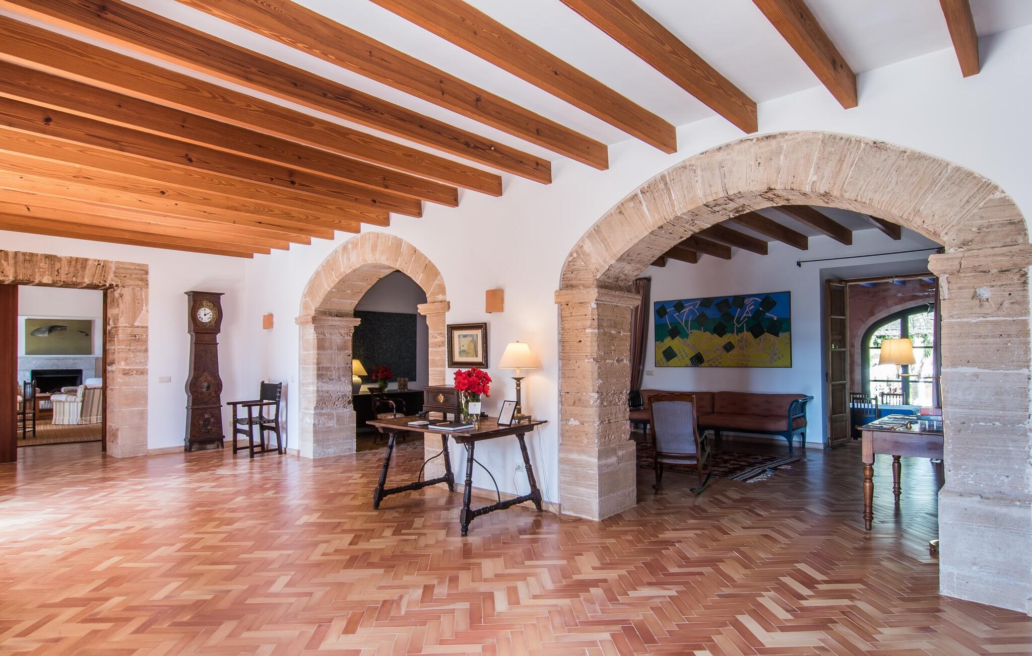 Die familienfreundliche Immobilie beweist ihre Großzügigkeit auf den 2.000 m² Innenwohnfläche, die man angesichts des Außenbereichs erwarten darf. Das feudale Anwesen bietet auf zwei Etagen insgesamt drei Essbereiche, zwei wunderschöne Aufenthaltsräume, eine Bibliothek und ein Musikzimmer mit Flügel auf eine offene Galerie. Die Inneneinrichtung ist eine reizvolle Mischung aus mallorquinischer Gemütlichkeit mit viel Holz und gemütlichen Sitzgelegenheiten einerseits und zeitgenössischen Stilelementen andererseits. Liebevolle Details in der Dekoration vermitteln den Charme eines privaten Boutique-Hotels. Zur Gemütlichkeit tragen zahlreiche Kamine bei, die teils dekorativ, aber auch partyfunktional sind. Lobenswert ist auch, dass es eine voll ausgestattete und rundum gemütliche Küche gibt, die ein wenig an ein Zimmer in einem alten Bauernhaus erinnert, was nostalgisch und charmant ist. Den Gästen stehen acht Doppelzimmer zur Verfügung, die von der Ausstattung her eher an Suiten erinnern. Jedes der vollklimatisierten Zimmer verfügt nicht nur über ein eigenes Badezimmer mit Badewanne, sondern auch über einen eigenen Loungebereich, sodass Gäste wie ein Baby schlafen und sich in ihrem eigenen ruhigen Zimmer vollkommen entspannen können. Apropos Babys: Selbstverständlich stehen zwei Babybetten zur Verfügung, für etwas größere Kinder können optional bis zu zwei Zustellbetten hinzugebucht werden. Aufgrund der Zentralheizung ist dieses tolle Herrenhaus auch das ganze Jahr über für jede Veranstaltung buchbar.