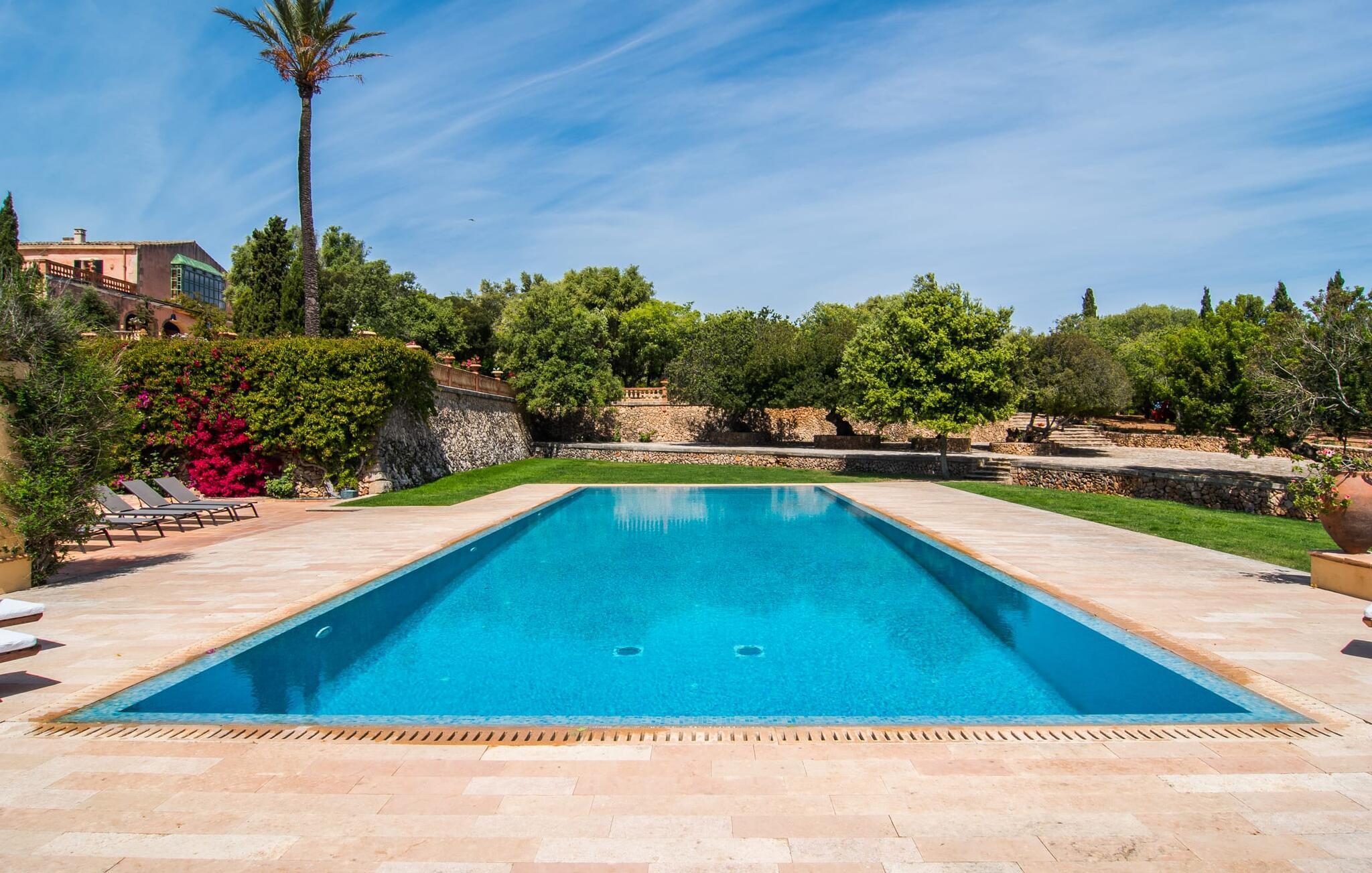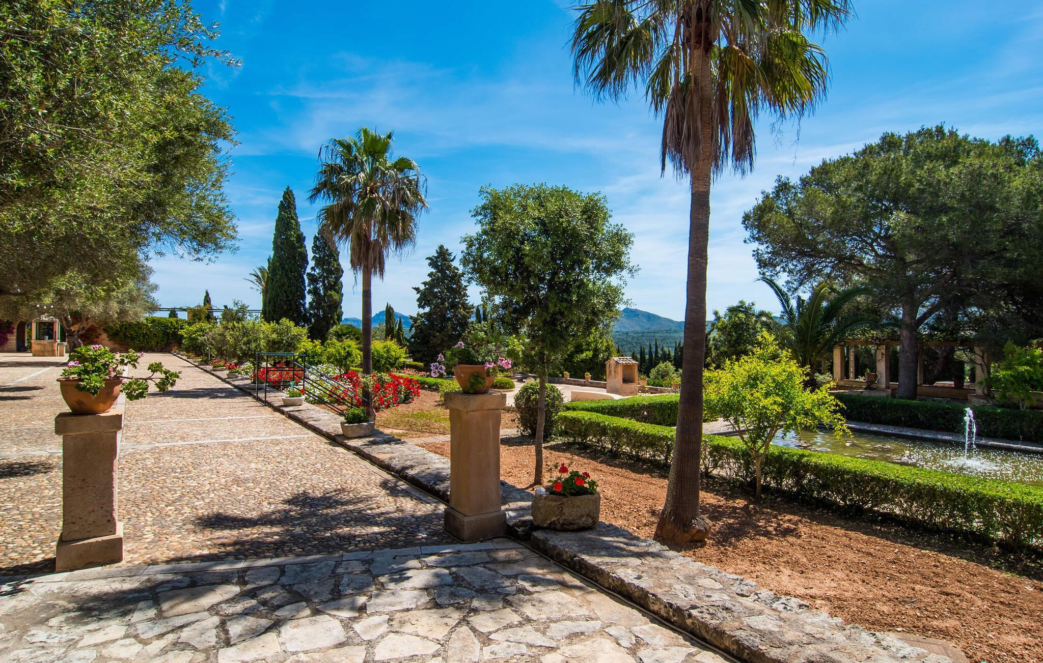 In vollkommener Abgeschiedenheit können Sie die Aussicht auf die wunderschönen sanften Hügel genießen, die für die Küstenlandschaft Mallorcas charakteristisch sind. 1,3 Millionen m² oder 130 ha Land, diese Größenordnung ist atemberaubend. Ebenso spannend wie diese Dimensionen ist die Gestaltung des angrenzenden Gartens. Rund um die ehrfurchtsvollen Mauern liegen sieben verschiedene Gärten, die zusammen eine fast magische Parklandschaft bilden. Der Ort erinnert an eine Klosteranlage oder ein Herrenhaus. Drei kleine Teiche mit teilweisen Wasserfällen, gepflasterte Wege, eine einzigartige Vielfalt an Oliven-, Johannisbrot- und Zitronenbäumen, Wege und Beete gesäumt von üppig blühenden Pflanzen, hängende Schlingpflanzen, die dem massiven Bruchsteinmauerwerk schmeicheln – das sind nur einige der wenigen Details, die... vermitteln absolute Privatsphäre und Schönheit. Nachts erstrahlt der Park in einem zauberhaften Licht, ebenso wie der riesige Pool, der von Rasenflächen und Natursteinflächen umgeben ist und von einer überdachten Lounge abgerundet wird. Zahlreiche Sitzecken mit einem aufwendigen Kaffeehaus-Ensemble, aber auch reichlich Tische, die bei einer Veranstaltung mit bis zu 400 Personen im Garten aufgestellt werden können, spiegeln das Potenzial für einen ganz besonderen Anlass wider. Übrigens helfen Ihnen die freundlichen Besitzer gerne bei der Organisation Ihres ganz privaten Festanlasses.