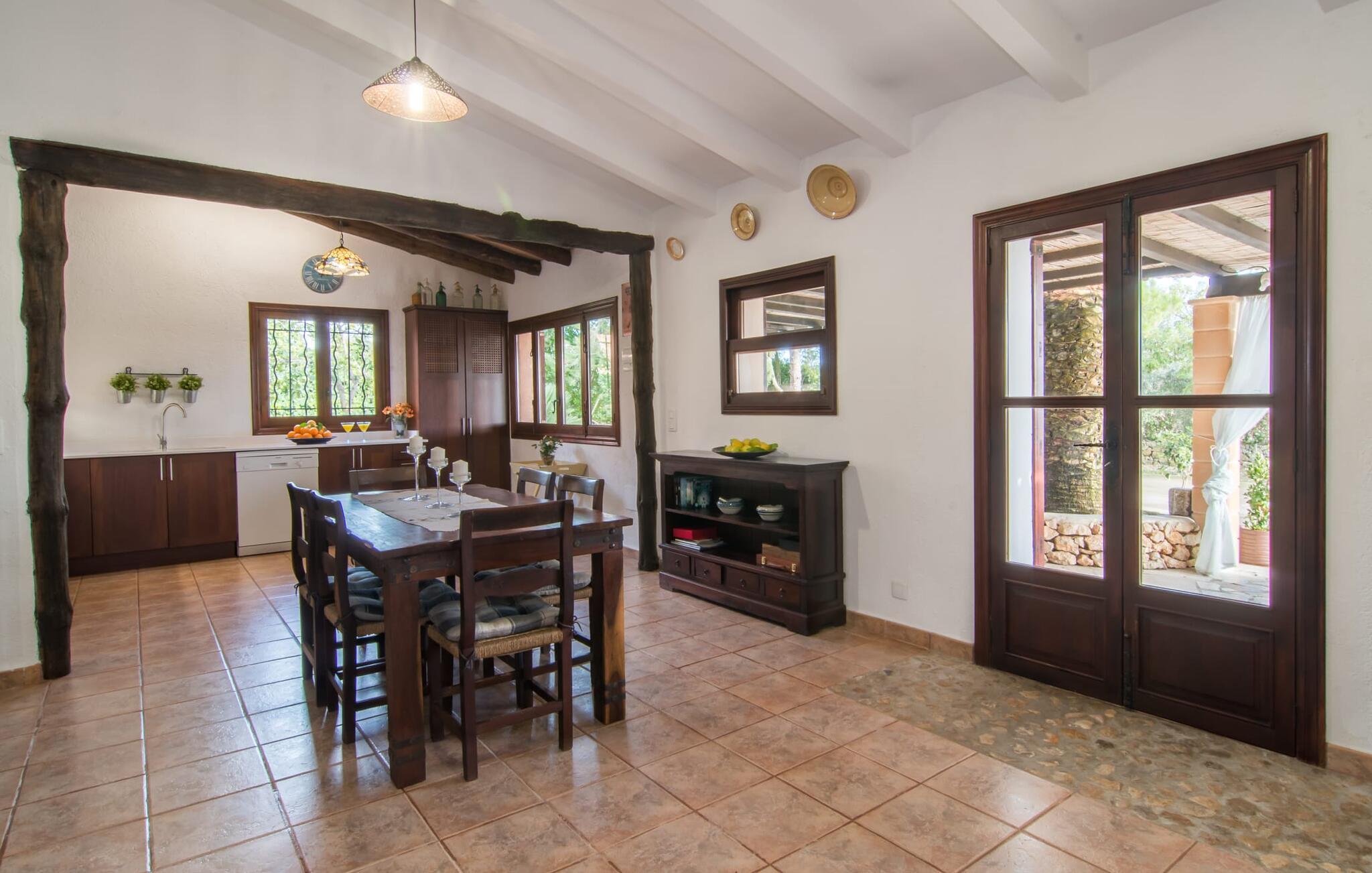 Die traditionelle Villa „So Fangos“ in perfekter ländlicher Alleinlage etwas südlich von Manacor ist perfekt für Kinder und Familien. Dies erkennt man bereits von außen, zum Beispiel durch den etwas erhöhten Pool hinter dem Haus direkt neben einem schönen, schattigen Waldstück mit Sonnenterrasse und kleiner Rasenfläche. Da der Poolbereich umzäunt und mit einem Tor verschlossen ist, ist gewährleistet, dass Kinder in diesem Bereich nicht ohne Aufsicht spielen können. Am Pool stehen insgesamt sechs Liegestühle zum Sonnenbaden und zwei Sonnenschirme für Schatten zur Verfügung. Die Villa selbst ist von einer Terrassenfläche aus Naturstein umgeben, die von mediterranen Grünpflanzen umgeben ist. Eine hohe Palme grenzt direkt an den überdachten Terrassenbereich entlang des Hauses. In diesem Bereich finden Sie einen einfachen Holztisch mit sechs bequemen Holzstühlen – ein toller Essbereich im Freien, der nur wenige Meter vom Hauseingang und der Küche entfernt ist. Auf der anderen Seite der Veranda befindet sich ein Loungebereich – perfekt am Abend, wenn die Kinder im Bett liegen und Sie einfach nur das Zirpen der Heuschrecken und das milde Klima bei einem letzten Drink genießen möchten. Auf der Rückseite des Hauses gibt es eine weitere kleine, überdachte Terrasse mit einem Sitzplatz für unsere Leute. Das Schöne an dieser Terrasse ist, dass sie von zwei der drei Schlafzimmer direkt zugänglich ist. Die Terrasse ist ebenfalls von einem Holztor umgeben und kann mit einer Tür verschlossen werden. Den Hausgästen steht ein Basketballplatz zur Verfügung. Anschließend ein erfrischendes Bad im privaten Pool.